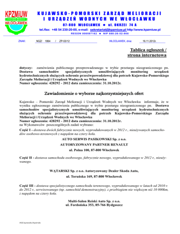 KUJAWSKO-POMORSKI ZARZĄD MELIORACJI I URZĄDZEŃ WODNYCH WE WŁOCŁAWKU 87-800 WŁO CŁAWE K ul. OKRZEI 74 A tel./fax: +48 54 230-20-00, e-mail: [email protected] http:\\www.kpzmiuw.pl REGON 000597162 NIP 888-26-52-908 ZNAK: NGZ/ 1864 / ZP-53/12 WŁOCŁAWEK, dnia: 16.11.2012r. Tablica ogłoszeń / strona internetowa dotyczy: zamówienia publicznego przeprowadzanego w trybie przetargu nieograniczonego pn. Dostawa samochodów specjalistycznych umożliwiających monitoring urządzeń hydrotechnicznych służących ochronie przeciwpowodziowej dla potrzeb Kujawsko-Pomorskiego Zarządu Melioracji i Urządzeń Wodnych we Włocławku Numer ogłoszenia: 428292 - 2012 data zamieszczenia: 31.10.2012r. Zawiadomienie o wyborze najkorzystniejszych ofert Kujawsko – Pomorski Zarząd Melioracji i Urządzeń Wodnych we Włocławku informuje, że w wyniku ogłoszonego zamówienia publicznego w trybie przetargu nieograniczonego pn. Dostawa samochodów specjalistycznych umożliwiających monitoring urządzeń hydrotechnicznych służących ochronie przeciwpowodziowej dla potrzeb Kujawsko-Pomorskiego Zarządu Melioracji i Urządzeń Wodnych we Włocławku Numer ogłoszenia: 428292 - 2012 data zamieszczenia: 31.10.2012r. na Wykonawców poszczególnych zadań wybrano: Część I - dostawa dwóch fabrycznie nowych, wyprodukowanych w 2012 r., nieużywanych samochodów osobowo-terenowych z napędem na cztery koła. AUTO SERWIS PASIKOWSKI Sp. z o.o. AUTORYZOWANY PARTNER RENAULT ul. Polna 100, 87-800 Włocławek Część II - dostawa samochodu osobowego, fabrycznie nowego, wyprodukowanego w 2012 r., nieużywanego. WĄTARSKI Sp. z o.o. Autoryzowany Dealer Skoda Auto, ul. Toruńska 169, 87-800 Włocławek Część III - dostawa specjalistycznego samochodu terenowego, wyprodukowanego w latach od 2010 r. do 2012 r., serwisowanego (np. samochód demonstracyjny), z przebiegiem nie większym niż 10 000km, z napędem na cztery koła. Multi-Salon Reiski Auto Sp. z o.o. ul. Fordońska 353, 85-766 Bydgoszcz NGZ Agnieszka Dopierała Uzasadnienie: Wykonawcy złożyli oferty nie podlegające odrzuceniu, spełnili warunki udziału w postępowaniu określone w art. 22 ust. 1 ustawy z dnia 29 stycznia 2004r. Prawo zamówień publicznych (tekst jednolity Dz. U. z 2010r. Nr 113, poz. 759 z późn. zm.) oraz w rozdziale I pkt 5 specyfikacji istotnych warunków zamówienia (SIWZ) i złożyli wszystkie oświadczenia oraz dokumenty wymagane w SIWZ. Ofertom tych wykonawcy przyznano najwyższą ilość punktów. Informuję, że w prowadzonym postępowaniu złożono 4 oferty, którym zgodnie ze streszczeniem oceny i porównania złożonych ofert przyznano następującą punktację: Część I Oferta nr 2 AUTO SERWIS PASIKOWSKI Sp. z o.o. AUTORYZOWANY PARTNER RENAULT ul. Polna 100, 87-800 Włocławek Punkty za kryterium cena - 85,00 pkt. Punkty za kryterium zużycie energii – 5,00 pkt. Punkty za kryterium emisja CO2 – 5,00 pkt. Punkty za kryterium emisja zanieczyszczeń – 5,00 pkt. Łączna ilość punktów – 100,00 pkt. Część II Oferta nr 4 WĄTARSKI Sp. z o.o. Autoryzowany Dealer Skoda Auto, ul. Toruńska 169, 87-800 Włocławek Punkty za kryterium cena - 85,00 pkt. Punkty za kryterium zużycie energii – 5,00 pkt. Punkty za kryterium emisja CO2 – 5,00 pkt. Punkty za kryterium emisja zanieczyszczeń – 5,00 pkt. Łączna ilość punktów – 100,00 pkt. Część III Oferta nr 1 Multi-Salon Reiski Auto Sp. z o.o. ul. Fordońska 353, 85-766 Bydgoszcz Punkty za kryterium cena – 85,00 pkt. Punkty za kryterium zużycie energii – 4,58 pkt. Punkty za kryterium emisja CO2 – 4,68 pkt. Punkty za kryterium emisja zanieczyszczeń – 4,00 pkt. Łączna ilość punktów – 98,26 pkt. Oferta nr 3 MOTO –CHAMP Ul. Ks. Schulza 1 A, 85-315 Bydgoszcz Punkty za kryterium cena – 67,97 pkt. Punkty za kryterium zużycie energii – 5,00 pkt. Punkty za kryterium emisja CO2 – 5,00 pkt. Punkty za kryterium emisja zanieczyszczeń – 5,00 pkt. Łączna ilość punktów – 82,97 pkt. Agnieszka Dopierała W związku z powyższym proszę wybranych Wykonawców o przesłanie podpisanej umowy lub przybycie umocowanych przedstawicieli Waszej firmy do siedziby Kujawsko-Pomorskiego Zarządu Melioracji i Urządzeń Wodnych we Włocławku, ul. Okrzei 74a celem podpisania umowy. Zgodnie z art. 92 ust. 1 pkt 4 ustawy z dnia 29 stycznia 2004r. Prawo zamówień publicznych zamawiający informuje, że w tym postępowaniu może zawrzeć umowę w sprawie zamówienia publicznego przed upływem terminów, o których mowa w art. 94 ust. 1 pkt 2 ustawy z uwagi na fakt, że w postępowaniu nie odrzucono żadnej oferty i nie wykluczono żadnego wykonawcy. Jarosław Ćwikliński Z-ca Dyrektora Kujawsko-Pomorskiego Zarządu Melioracji i Urządzeń Wodnych we Włocławku Rozdzielnik: 1. Tablica ogłoszeń/strona internetowa 2. a/a Agnieszka Dopierała