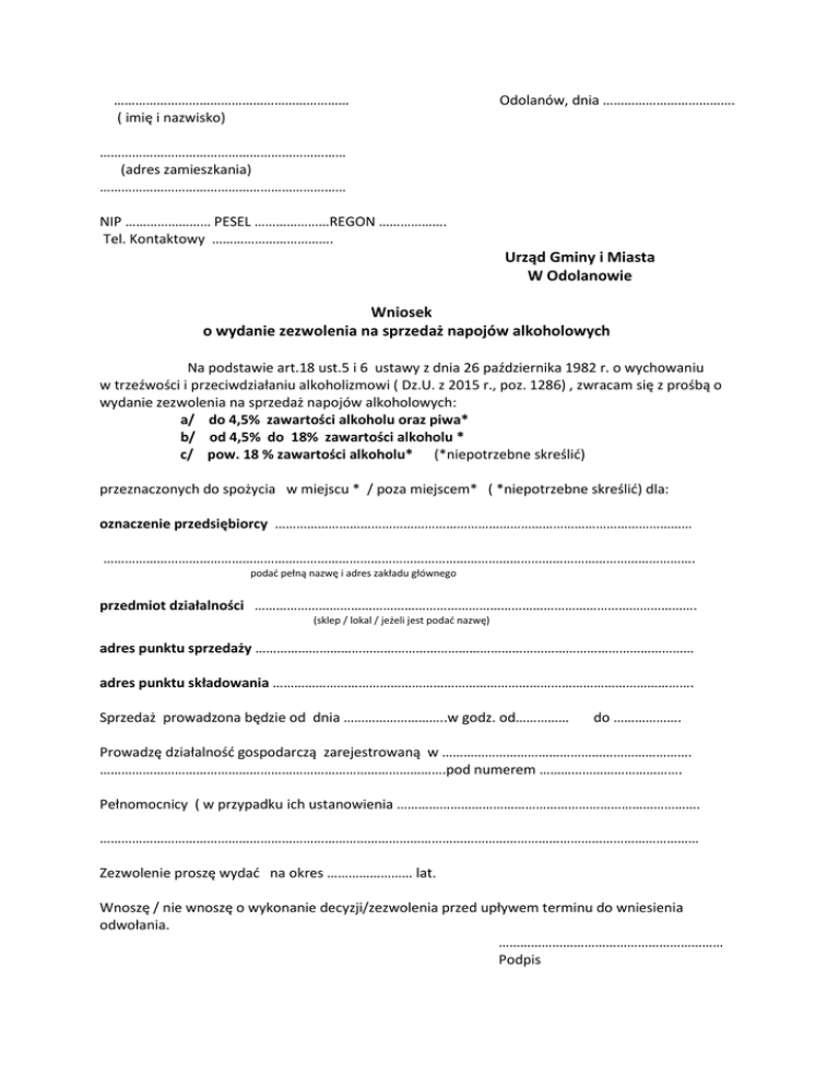 ………………………………………………………… ( imię i nazwisko) Odolanów, dnia ………………………………. …………………………………………………………… (adres zamieszkania) …………………………………………………………… NIP …………………… PESEL …………………REGON ………………. Tel. Kontaktowy ……………………………. Urząd Gminy i Miasta W Odolanowie Wniosek o wydanie zezwolenia na sprzedaż napojów alkoholowych Na podstawie art.18 ust.5 i 6 ustawy z dnia 26 października 1982 r. o wychowaniu w trzeźwości i przeciwdziałaniu alkoholizmowi ( Dz.U. z 2015 r., poz. 1286) , zwracam się z prośbą o wydanie zezwolenia na sprzedaż napojów alkoholowych: a/ do 4,5% zawartości alkoholu oraz piwa* b/ od 4,5% do 18% zawartości alkoholu * c/ pow. 18 % zawartości alkoholu* (*niepotrzebne skreślić) przeznaczonych do spożycia w miejscu * / poza miejscem* ( *niepotrzebne skreślić) dla: oznaczenie przedsiębiorcy ……………………………………………………………………………………………………… …………………………………………………………………………………………………………………………………………………. podać pełną nazwę i adres zakładu głównego przedmiot działalności ……………………………………………………………………………………………………………. (sklep / lokal / jeżeli jest podać nazwę) adres punktu sprzedaży …………………………………………………………………………………………………………… adres punktu składowania ………………………………………………………………………………………………………. Sprzedaż prowadzona będzie od dnia ………………………..w godz. od…………… do ………………. Prowadzę działalność gospodarczą zarejestrowaną w ……………………………………………………………. …………………………………………………………………………………….pod numerem …………………………………. Pełnomocnicy ( w przypadku ich ustanowienia …………………………………………………………………………. …………………………………………………………………………………………………………………………………………………… Zezwolenie proszę wydać na okres …………………… lat. Wnoszę / nie wnoszę o wykonanie decyzji/zezwolenia przed upływem terminu do wniesienia odwołania. ……………………………………………………… Podpis Do wniosku należy dołączyć: 1. Dokument potwierdzający tytuł prawny do lokalu stanowiącego punkt sprzedaży napojów alkoholowych, 2. Pisemną zgodę właściciela , użytkownika, zarządcy lub administratora budynku jeżeli punkt sprzedaży będzie zlokalizowany w budynku wielorodzinnym, 3. Decyzję właściwego państwowego inspektora sanitarnego o zatwierdzeniu zakładu