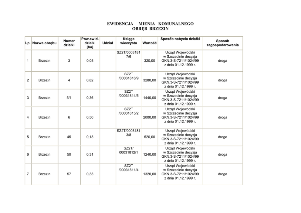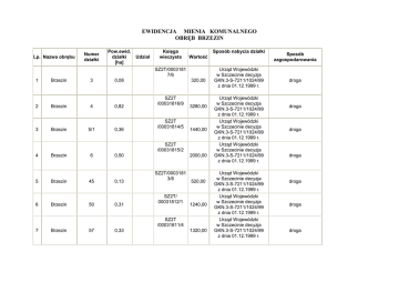 EWIDENCJA MIENIA KOMUNALNEGO OBRĘB BRZEZIN Lp. Nazwa obrębu Numer działki Pow.ewid. działki [ha] Udział Księga wieczysta Sposób nabycia działki Wartość SZ2T/0003181 7/6 1 2 3 Brzezin Brzezin Brzezin 3 4 5/1 0,08 0,82 0,36 320,00 SZ2T /00031816/9 SZ2T /00031814/5 3280,00 1440,00 SZ2T /00031815/2 4 5 6 Brzezin Brzezin Brzezin 6 45 50 0,50 0,13 0,31 2000,00 SZ2T/0003181 3/8 SZ2T/ 00031812/1 520,00 1240,00 SZ2T /00031811/4 7 Brzezin 57 0,33 1320,00 Urząd Wojewódzki w Szczecinie decyzja GKN.3-S-7211/1024/99 z dnia 01.12.1999 r. Urząd Wojewódzki w Szczecinie decyzja GKN.3-S-7211/1024/99 z dnia 01.12.1999 r. Urząd Wojewódzki w Szczecinie decyzja GKN.3-S-7211/1024/99 z dnia 01.12.1999 r. Urząd Wojewódzki w Szczecinie decyzja GKN.3-S-7211/1024/99 z dnia 01.12.1999 r. Urząd Wojewódzki w Szczecinie decyzja GKN.3-S-7211/1024/99 z dnia 01.12.1999 r. Urząd Wojewódzki w Szczecinie decyzja GKN.3-S-7211/1024/99 z dnia 01.12.1999 r. Urząd Wojewódzki w Szczecinie decyzja GKN.3-S-7211/1024/99 z dnia 01.12.1999 r. Sposób zagospodarowania droga droga droga droga droga droga droga 8 9 10 Brzezin Brzezin Brzezin 67 75 85 0,48 0,42 0,34 SZ2T /00031810/7 SZ2T /00031809/7 SZ2T /00031808/0 1920,00 1680,00 1360,00 SZ2T /00031807/3 11 Brzezin 100 0,04 160,00 SZ2T /00031806/6 12 Brzezin 101 0,83 3320,00 12009 13 14 Brzezin Brzezin 110/2 118 0,50 1,45 3000,00 SZ2T /00031805/9 5800,00 SZ2T /00031804/2 15 Brzezin 135 0,84 3360,00 Urząd Wojewódzki w Szczecinie decyzja GKN.3-S-7211/1024/99 z dnia 01.12.1999 r. Urząd Wojewódzki w Szczecinie decyzja GKN.3-S-7211/1024/99 z dnia 01.12.1999 r. Urząd Wojewódzki w Szczecinie decyzja GKN.3-S-7211/1024/99 z dnia 01.12.1999 r. Urząd Wojewódzki w Szczecinie decyzja GKN.3-S-7211/1024/99 z dnia 01.12.1999 r. Urząd Wojewódzki w Szczecinie decyzja GKN.3-S-7211/1024/99 z dnia 01.12.1999 r. umowa o nieodpłatne przeniesienie prawa własności nieruchomości Rep. 6441/1999 z dnia 07.07.1999 r. Urząd Wojewódzki w Szczecinie decyzja GKN.3-S-7211/1024/99 z dnia 01.12.1999 r. Urząd Wojewódzki w Szczecinie decyzja GKN.3-S-7211/1024/99 z dnia 01.12.1999 r. droga droga droga droga droga Grunt rolny – działki nauczycielskie droga droga 9640 16 Brzezin 140/3 0,3306 17 Brzezin 150 0,3025 18 Brzezin 150/1 0,1205 19 Brzezin sprzedana 150/2 0,1820 20 Brzezin 177 0,30 21 Brzezin 189 0,48 22 Brzezin 194 sprzedana 0,2818 23 Brzezin 211/2 0,66 umowa sprzedaŜy Rep. Tereny mieszkaniowe – 1500,00 7869/97 z dnia 23.12.1887 świetlica wiejska r. 28135 Urząd Wojewódzki w Tereny mieszkaniowe – Szczecinie decyzja umowa najmu podział GNG.2.T-7211-547/94 z poz. 18, 19 dnia 25.05.1994 r. 28135 Urząd Wojewódzki w Powstała w wyniku Szczecinie decyzja podziału działki 150 GNG.2.T-7211-547/94 z Tereny mieszkaniowe dnia 25.05.1994 r. budynek mieszkalny jednorodzinny nr 31 Urząd Wojewódzki w Sz2T działa niezabudowana Szczecinie decyzja /00028135/7 5096,00 Rep.A. 2147/2010 z dn. GNG.2.T-7211-547/94 z 12.07.2010 r. dnia 25.05.1994 r. SZ2T/0003180 Urząd Wojewódzki 3/5 w Szczecinie decyzja 1200,00 droga GKN.3-S-7211/1024/99 z dnia 01.12.1999 r. 1479 Urząd Wojewódzki w Szczecinie decyzja 1200,00 Cmentarz GNG.n.12-7211/1085/91 z dnia 02.05.1991 r. 20394 Urząd Wojewódzki w Tereny mieszkanioweSzczecinie decyzja budynek mieszkalny GNG.2.T-7211/548/94 z jednorodzinny nr 15akt 4732,00 dnia 25.05.1994 r. not. Rep.A4517/2010 z dnia 12.07.2010 z dnia 12.07.2010 r. 19605 Urząd Wojewódzki w Boisko sportowe Szczecinie decyzja zgodnie z pzp część GNG.2.T-7211-547/94 z działki przeznaczona dnia 25.05.1994 r. jest pod teren usług 11991,00 sportu-wiejskie boisko sportowe K 8aUS, a część pod teren zabudowy usługowej w zakresie nieuciąŜliwych usług K 8b U/US Urząd Wojewódzki w trwały zarząd – Szczecinie decyzja Przedszkole Publiczne 1456,00 GNG.n.12-7211/1085/91 z w BrzeŜnie dnia 02.05.1991 r. SZ2T/0003180 Urząd Wojewódzki 1/1 w Szczecinie decyzja 960,00 droga GKN.3-S-7211/1024/99 z dnia 01.12.1999 r. Sz2T/0003180 Urząd Wojewódzki 2/8 w Szczecinie decyzja 1600,00 droga GKN.3-S-7211/1024/99 z dnia 01.12.1999 r. 1480 24 Brzezin 218 0,08 25 Brzezin 265 0,24 26 Brzezin 266 0,40