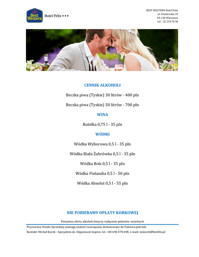 BEST WESTERN Hotel Felix ul. Omulewska 24 04-128 Warszawa tel. : 22 210 70 50 CENNIK ALKOHOLI Beczka piwa (Tyskie) 30 litrów - 400 pln Beczka piwa (Tyskie) 50 litrów - 700 pln WINA Butelka 0,75 l - 35 pln WÓDKI Wódka Wyborowa 0,5 l - 35 pln Wódka Biała Żubrówka 0,5 l - 35 pln Wódka Bols 0,5 l - 35 pln Wódka Finlandia 0,5 l - 50 pln Wódka Absolut 0,5 l - 55 pln NIE POBIERAMY OPŁATY KORKOWEJ Powyższa oferta alkoholi dotyczy wyłącznie pakietów weselnych Pracownicy Działu Sprzedaży pomogą znaleźć rozwiązanie dostosowane do Państwa potrzeb. Kontakt: Michał Kurek - Specjalista ds. Organizacji Imprez, tel. +48 696 478 698, e-mail: [email protected]
