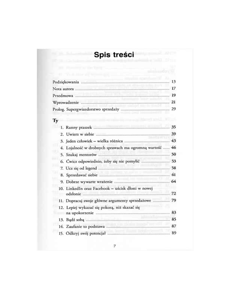 Spis treści Podziękowania 13 Nota autora 17 Przedmowa 19 Wprowadzenie 21 Prolog. Supergwiazdorstwo sprzedaży 29 Ty 1. Ranny ptaszek 35 2. Uwierz w siebie 39 3. Jeden człowiek — wielka różnica 43 4. Lojalność w drobnych sprawach ma ogromną wartość .. .... 46 5. Szukaj mentorów 50 6. Ćwicz odpowiednio, żeby się nie pomylić 53 7. Ucz się od legend 58 8. Sprzedawać siebie 61 9. Dobrze wywarte wrażenie 64 10. Linkedln oraz Facebook - uścisk dłoni w nowej odsłonie 72 11. Dopracuj swoje główne argumenty sprzedażowe 79 12. Lepiej wykazać się pokorą, niż skazać się na upokorzenie 83 13. Bądź sobą 85 14. Zaufanie to podstawa 87 15. Odkryj swój potencjał 89 7 MACKAYA MBA SPRZEDAŻY W PRAWDZIWYM ŚWIECIE 16. Świetny sprzedawca koncentruje się na kliencie 93 17. Dbaj o dziecko, które jest w tobie 98 Wyobraźnia 18. Wizualizacja sukcesu 105 19. Putt jako sposób na przetrwanie 108 20. Deszcz może wszystko poprawić 112 21. Musisz mieć marzenie! 114 22. Niech ci nie będzie tęskno do Miss America 116 23. Przesuwanie linii celów 119 24. Lista życzeń 122 25. Fantazje inspirują rzeczywistość 125 Wytrwałość 26. Abecadło determinacji - każdy to potrafi 131 27. Kto rezygnuje, ten nigdy nie wygrywa 137 28. Inwestycja w postaci 10 000 godzin 140 29. Współczucie i ciebie podniesie na duchu 144 30. Entuzjazm - tylko ty możesz go w sobie rozpalić 147 31. O entuzjazmie raz jeszcze 150 32. To nastawienie wyznacza górny pułap osiągnięć 153 33. Zmień sposób myślenia, a zmienisz swoje życie 157 34. Swoje pozytywne „ja" masz tuż pod palcami 161 35. Zmartwienia zaprzątają nam głowę przedwcześnie 165 Niepowodzenia 36. Nie ma lepszej szkoły niż szkoła przeciwności losu 171 37. Przezwyciężyć strach przed odmową 175 8 SPIS TREŚCI 38. Pokonaj odmowę, zanim ona pokona ciebie 179 39. Ci, którzy nie wiedzą, nie wiedzą, że nie wiedzą 183 40. Powroty to nie żarty 187 41. Tych słów się wystrzegaj 191 42. Wyścig na szczyt 194 43. Powątpiewanie w siebie jako źródło pewności siebie 197 44. Przegrać kilka właściwych bitew, żeby wygrać wojnę 201 45. Nie zgadzaj się na przegraną 205 Zwycięski krok 46. Darowanemu mułowi w zęby się nie zagląda 215 47. Najbardziej uważna publiczność 218 48. Wprowadź się w trans 221 49. Daj sobie luz 225 50. Psychologia dołka 228 51. Dobry wynik w krytycznym momencie 231 52. Zapanuj nad niebezpiecznym dryfem apatii 234 53. Odwaga - to cię odróżnia od tłumów 238 54. Świetne rzeczy świetnie się sprzedają 242 55. Ufaj swoim przeczuciom 245 56. Od braku wyrazu do fajności 249 57. Pasja - główna siła sprawcza 254 58. Odnieś sukces jako indywidualista 258 Kontakt 59. Internet jako skalpel sprzedaży 265 60. Media społecznościowe. Nowy gigantyczny ośrodek sprzedaży 273 9 MACKAYA MBA SPRZEDAŻY W PRAWDZIWYM ŚWIECIE 61. W grupie interesów 278 62. Pięćdziesiątka wcale nie musi być psychologicznym ograniczeniem prędkości 280 63. Jak zarabiać na adeptach nowych technologii 283 64. Sprzedaż w ukrytej kamerze 287 65. Obsługa klienta w nowej cyfrowej odsłonie 289 66. Obsługa klienta w epoce internetu 292 67. Mackay 25 - lista kontrolna. Przygotowania do spotkania sprzedażowego 297 68. Nieodebrany serwis 303 69. Jak wykorzystać Twittera do zwiększania skuteczności sprzedaży 306 Doskonałość 70. Dążenie do doskonałości 317 71. Sprzedaj się pracy marzeń 321 72. Zakochaj się w swojej pracy 324 73. Uczciwość 328 74. Twój charakter powinien być najmocniejszym punktem twojej charakterystyki 335 75. Sieci bywają różne 339 76. Rewolucja na finiszu 341 77. Nikt nie uważa, że jest przeciętny 345 78. Poczucie własnej wartości jako atut 348 79. Klub, do którego warto należeć 352 80. Do sprzedaży potrzeba człowieka z krwi i kości 354 81. Sukces w sprzedaży Przepis na wyróżnienie 357 82. Siedem czynników sukcesu 360 10 SPIS TREŚCI Myśli końcowe Elitarna ósemka Mackaya (plus jedna pozycja dodatkowa). Lista książek o sprzedaży, które mogą odmienić twoje życie 367 Druga nota autora 375 Abecadło sprzedaży 376 Drugie Dziesięć Przykazań 379 Indeks 383 11