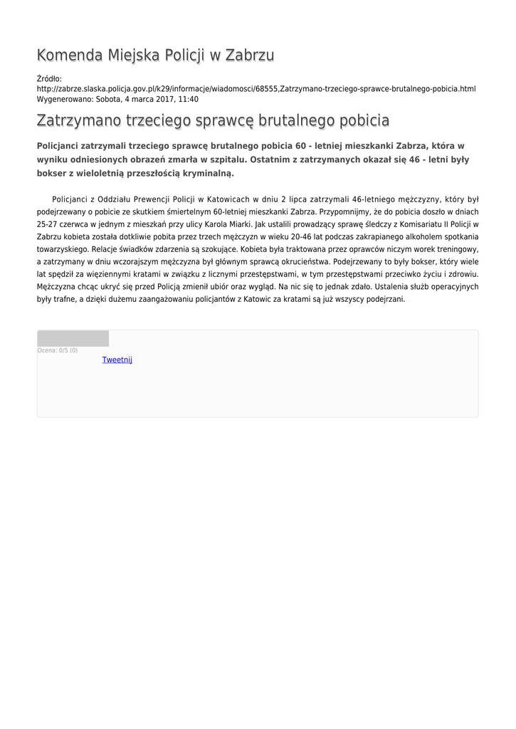 Komenda Miejska Policji w Zabrzu Źródło: http://zabrze.slaska.policja.gov.pl/k29/informacje/wiadomosci/68555,Zatrzymano-trzeciego-sprawce-brutalnego-pobicia.html Wygenerowano: Sobota, 4 marca 2017, 11:40 Zatrzymano trzeciego sprawcę brutalnego pobicia Policjanci zatrzymali trzeciego sprawcę brutalnego pobicia 60 - letniej mieszkanki Zabrza, która w wyniku odniesionych obrazeń zmarła w szpitalu. Ostatnim z zatrzymanych okazał się 46 - letni były bokser z wieloletnią przeszłością kryminalną. Policjanci z Oddziału Prewencji Policji w Katowicach w dniu 2 lipca zatrzymali 46-letniego mężczyzny, który był podejrzewany o pobicie ze skutkiem śmiertelnym 60-letniej mieszkanki Zabrza. Przypomnijmy, że do pobicia doszło w dniach 25-27 czerwca w jednym z mieszkań przy ulicy Karola Miarki. Jak ustalili prowadzący sprawę śledczy z Komisariatu II Policji w Zabrzu kobieta została dotkliwie pobita przez trzech mężczyzn w wieku 20-46 lat podczas zakrapianego alkoholem spotkania towarzyskiego. Relacje świadków zdarzenia są szokujące. Kobieta była traktowana przez oprawców niczym worek treningowy, a zatrzymany w dniu wczorajszym mężczyzna był głównym sprawcą okrucieństwa. Podejrzewany to były bokser, który wiele lat spędził za więziennymi kratami w związku z licznymi przestępstwami, w tym przestępstwami przeciwko życiu i zdrowiu. Mężczyzna chcąc ukryć się przed Policją zmienił ubiór oraz wygląd. Na nic się to jednak zdało. Ustalenia służb operacyjnych były trafne, a dzięki dużemu zaangażowaniu policjantów z Katowic za kratami są już wszyscy podejrzani. Ocena: 0/5 (0) Tweetnij