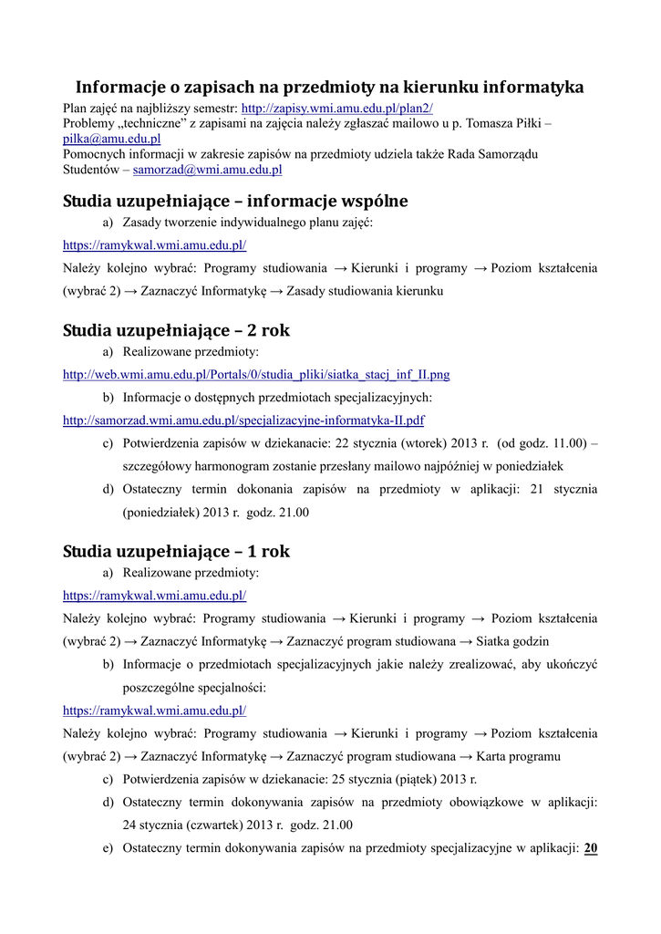 Informacje o zapisach na przedmioty na kierunku informatyka Plan zajęć na najbliższy semestr: http://zapisy.wmi.amu.edu.pl/plan2/ Problemy „techniczne” z zapisami na zajęcia należy zgłaszać mailowo u p. Tomasza Piłki – [email protected] Pomocnych informacji w zakresie zapisów na przedmioty udziela także Rada Samorządu Studentów – [email protected] Studia uzupełniające – informacje wspólne a) Zasady tworzenie indywidualnego planu zajęć: https://ramykwal.wmi.amu.edu.pl/ Należy kolejno wybrać: Programy studiowania → Kierunki i programy → Poziom kształcenia (wybrać 2) → Zaznaczyć Informatykę → Zasady studiowania kierunku Studia uzupełniające – 2 rok a) Realizowane przedmioty: http://web.wmi.amu.edu.pl/Portals/0/studia_pliki/siatka_stacj_inf_II.png b) Informacje o dostępnych przedmiotach specjalizacyjnych: http://samorzad.wmi.amu.edu.pl/specjalizacyjne-informatyka-II.pdf c) Potwierdzenia zapisów w dziekanacie: 22 stycznia (wtorek) 2013 r. (od godz. 11.00) – szczegółowy harmonogram zostanie przesłany mailowo najpóźniej w poniedziałek d) Ostateczny termin dokonania zapisów na przedmioty w aplikacji: 21 stycznia (poniedziałek) 2013 r. godz. 21.00 Studia uzupełniające – 1 rok a) Realizowane przedmioty: https://ramykwal.wmi.amu.edu.pl/ Należy kolejno wybrać: Programy studiowania → Kierunki i programy → Poziom kształcenia (wybrać 2) → Zaznaczyć Informatykę → Zaznaczyć program studiowana → Siatka godzin b) Informacje o przedmiotach specjalizacyjnych jakie należy zrealizować, aby ukończyć poszczególne specjalności: https://ramykwal.wmi.amu.edu.pl/ Należy kolejno wybrać: Programy studiowania → Kierunki i programy → Poziom kształcenia (wybrać 2) → Zaznaczyć Informatykę → Zaznaczyć program studiowana → Karta programu c) Potwierdzenia zapisów w dziekanacie: 25 stycznia (piątek) 2013 r. d) Ostateczny termin dokonywania zapisów na przedmioty obowiązkowe w aplikacji: 24 stycznia (czwartek) 2013 r. godz. 21.00 e) Ostateczny termin dokonywania zapisów na przedmioty specjalizacyjne w aplikacji: 20 stycznia (niedziela) 2013 r. godz. 20:00 Studia licencjackie – 2 oraz 3 rok a) Realizowane przedmioty: http://web.wmi.amu.edu.pl/Portals/0/studia_pliki/SiatkaINFORMATYKAdzienne.pdf b) Informacje o przedmiotach specjalizacyjnych jakie należy zrealizować, aby ukończyć poszczególne specjalności: http://web.wmi.amu.edu.pl/Default.aspx?tabid=540 c) Zasady tworzenia indywidualnego planu zajęć: https://ramykwal.wmi.amu.edu.pl/ Należy kolejno wybrać: Programy studiowania → Kierunki i programy → Poziom kształcenia (wybrać 1) → Zaznaczyć Informatykę → Zasady studiowania kierunku d) Potwierdzenia zapisów w dziekanacie dla III roku: 22 stycznia (wtorek) 2013 r. (od godz. 11.00) – szczegółowy harmonogram zostanie przesłany mailowo najpóźniej w poniedziałek e) Ostateczny termin dokonania zapisów na przedmioty obowiązkowe w aplikacji dla III roku: 21 stycznia (poniedziałek) 2013 r. godz. 21.00 f) Potwierdzenia zapisów w dziekanacie dla II roku: 25 stycznia (piątek) 2013 r. g) Ostateczny termin dokonania zapisów na przedmioty obowiązkowe w aplikacji dla II roku: 24 stycznia (czwartek) 2013 r. godz. 21.00 h) Ostateczny termin dokonania zapisów na przedmioty specjalizacyjne w aplikacji dla III oraz II roku: upłynął Studia licencjackie – 1 rok a) Realizowane przedmioty: https://ramykwal.wmi.amu.edu.pl/ Należy kolejno wybrać: Programy studiowania → Kierunki i programy → Poziom kształcenia (wybrać 1) → Zaznaczyć Informatykę → Zaznaczyć program studiowana → Siatka godzin b) Informacje o przedmiotach specjalizacyjnych jakie należy zrealizować, aby ukończyć poszczególne specjalności: https://ramykwal.wmi.amu.edu.pl/ Należy kolejno wybrać: Programy studiowania → Kierunki i programy → Poziom kształcenia (wybrać 1) → Zaznaczyć Informatykę → Zaznaczyć program studiowana → Karta programu c) Zasady tworzenia indywidualnego planu zajęć: https://ramykwal.wmi.amu.edu.pl/ Należy kolejno wybrać: Programy studiowania → Kierunki i programy → Poziom kształcenia (wybrać 1) → Zaznaczyć Informatykę → Zasady studiowania kierunku d) Potwierdzenia zapisów w dziekanacie dla I roku: 30 stycznia (środa) 2013 r. e) Ostateczny termin tworzenia planu zajęć w aplikacji: 29 stycznia (wtorek) 2013 r. godz. 21.00