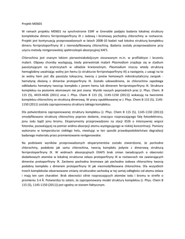Projekt MD601 W ramach projektu MD601 na synchrotronie ESRF w Grenoble podjęto badania lokalnej struktury kompleksów dimeru ferriprotoporfiryny IX z iodową i bromową pochodną chlorochiny w roztworze. Projekt jest kontynuacją przeprowadzonych w latach 2008-10 badao nad lokalna strukturą kompleksu dimeru ferriprotoporfiryny IX z niemodyfikowaną chlorochiną. Badania zostały przeprowadzone przy użyciu metody rentgenowskiej spektroskopii absorpcyjnej XAFS. Chlorochina jest znanym lekiem pierwotniakobójczym stosowanym m.in. w profilaktyce i leczeniu malarii. Objawy choroby występują, kiedy pierwotniak malarii Plasmodium znajduje się w stadium pasożytującym na erytrocytach w układzie krwionośnym. Plasmodium niszczy wtedy strukturę hemoglobiny uwalniając wolny jon hemu (o strukturze ferriprotoporfiryny IX) a następnie, z uwagi na to że wolny hem jest dla pasożyta toksyczny, tworzy z jonów hemowych mikrokrystaliczny związek hematynę złożoną z dimerów protoporfiryny IX. Zostało udowodnione, że chlorochina zapobiega odkładaniu hematyny tworząc kompleks z jonem hemu lub dimerem ferriprotoporfiryny IX. Struktura kompleksu na poziomie atomowym nie jest znana. Wyniki naszych poprzednich prac (J. Phys. Chem. B 115 (5), 4419-4426 (2011) oraz J. Phys. Chem B 115 (5), 1145-1150 (2011)) wskazują na tworzenie kompleksu chlorochiny ze strukturą dimerową. W pracy opublikowanej w J. Phys. Chem B 115 (5), 11451150 (2011) została zaproponowana struktura takiego kompleksu. Dla potwierdzenia zaproponowanej struktury kompleksu (J. Phys. Chem B 115 (5), 1145-1150 (2011)) zmodyfikowano strukturę chlorochiny poprzez dodanie, znacząco rozpraszającego falę fotoelektronu, jonu iodu bądź jonu bromu. Eksperymenty przeprowadzono na stacji ID26 o intensywnej wiązce fotonów, pozwalającej na pomiar widma absorpcji atomu występującego w niskiej koncentracji. Pomiary wykonano w temperaturze ciekłego helu, niwelując w ten sposób prawdopodobieostwo degradacji badanego materiału przez promieniowanie rentgenowskie. Na podstawie wyników przeprowadzonych eksperymentów zostało stwierdzone, że pochodne chlorochiny, podobnie jak sama chlorochina, tworzą kompleks jedynie z dimerową strukturą ferriprotoporfiryny IX. W widmach absorpcyjnych EXAFS brak zmian świadczących o obecności dodatkowych atomów w lokalnej strukturze żelaza protoporfiryny IX w roztworach nie zawierających dimerów protoporfiryny IX. Zarówno pochodna bromowa jak pochodna iodowa chlorochiny tworzą podobny kompleks z dimerem protoporfiryny IX jak niezmodyfikowana chlorochina. Dla wszystkich trzech kompleksów obserwowane zmiany strukturalne zachodzą w tej samej odległości od atomu żelaza i mają ten sam charakter. Brak obecności silnie rozpraszających atomów iodu i bromu w strefie o promieniu 3.4 Å. Potwierdza to zatem, że zaproponowany model struktury kompleksu (J. Phys. Chem B 115 (5), 1145-1150 (2011)) jest zgodny ze stanem faktycznym.