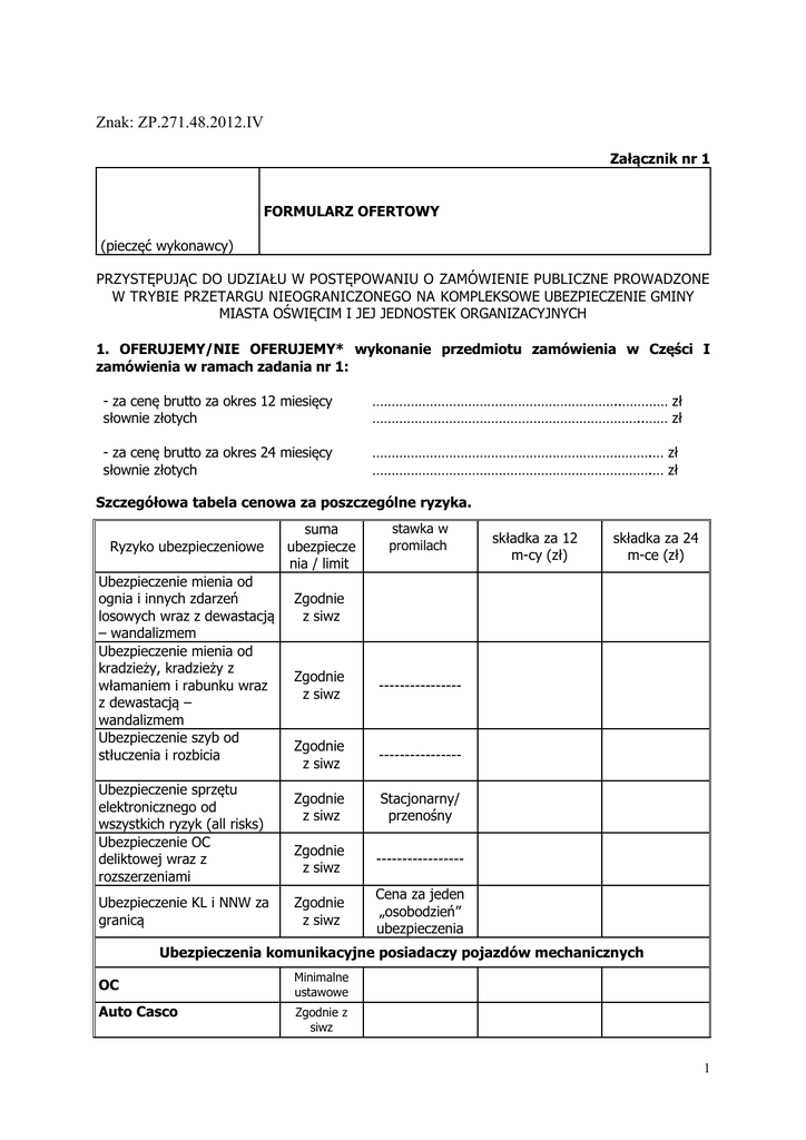 Znak: ZP.271.48.2012.IV Załącznik nr 1 FORMULARZ OFERTOWY (pieczęć wykonawcy) PRZYSTĘPUJĄC DO UDZIAŁU W POSTĘPOWANIU O ZAMÓWIENIE PUBLICZNE PROWADZONE W TRYBIE PRZETARGU NIEOGRANICZONEGO NA KOMPLEKSOWE UBEZPIECZENIE GMINY MIASTA OŚWIĘCIM I JEJ JEDNOSTEK ORGANIZACYJNYCH 1. OFERUJEMY/NIE OFERUJEMY* wykonanie przedmiotu zamówienia w Części I zamówienia w ramach zadania nr 1: - za cenę brutto za okres 12 miesięcy słownie złotych ………………………………………………………..………… zł ……………………………………………………………..…… zł - za cenę brutto za okres 24 miesięcy słownie złotych ……………………………………………………………….… zł ……………………………………………………………….… zł Szczegółowa tabela cenowa za poszczególne ryzyka. Ryzyko ubezpieczeniowe Ubezpieczenie mienia od ognia i innych zdarzeń losowych wraz z dewastacją – wandalizmem Ubezpieczenie mienia od kradzieży, kradzieży z włamaniem i rabunku wraz z dewastacją – wandalizmem Ubezpieczenie szyb od stłuczenia i rozbicia Ubezpieczenie sprzętu elektronicznego od wszystkich ryzyk (all risks) Ubezpieczenie OC deliktowej wraz z rozszerzeniami Ubezpieczenie KL i NNW za granicą suma ubezpiecze nia / limit stawka w promilach składka za 12 m-cy (zł) składka za 24 m-ce (zł) Zgodnie z siwz Zgodnie z siwz ---------------- Zgodnie z siwz ---------------- Zgodnie z siwz Stacjonarny/ przenośny Zgodnie z siwz ----------------- Zgodnie z siwz Cena za jeden „osobodzień” ubezpieczenia Ubezpieczenia komunikacyjne posiadaczy pojazdów mechanicznych OC Minimalne ustawowe Auto Casco Zgodnie z siwz 1 Znak: ZP.271.48.2012.IV Zgodnie z siwz Zgodnie z siwz NNW ASS Cena łączna za wszystkie ryzyka ------------------- * - „stawka” ma jedynie charakter orientacyjny, nie będzie brana pod uwagę na etapie oceny ofert. Przez stawkę rozumie się stawkę bazową dla rocznego okresu ubezpieczenia, dotyczącą poszczególnych rodzajów mienia bez wliczania ceny poszczególnych klauzul, limitów i rozszerzeń. Oferujemy następujące klauzule dodatkowe : Lp. Warunek fakultatywny ** Ubezpieczenie mienia od ognia i innych zdarzeń losowych A Dla mienia ubezpieczonego wg wartości księgowej brutto i odtworzeniowej, które nie będzie remontowane lub odtwarzane, wysokość odszkodowania zgodna z przyjętymi sumami bez potrącania stopnia zużycia technicznego Brak akceptacji B Włączenie odpowiedzialności za szkody powstałe podczas prac remontowo – budowlanych lub katastrofy budowlanej w limicie 5.000.000,00 zł Brak włączenia w limicie 5.000.000,00 zł. C W przypadku wyczerpania limitów odpowiedzialności określonych w systemie pierwszego ryzyka, w odniesieniu do każdego, rocznego okresu ubezpieczenia limity te ulegną automatycznemu odnowieniu do wysokości 25% wartości początkowej (nie dotyczy limitów określonych w zał. nr 5 do SIWZ, zadanie nr I, lit. A ust. 4 – tabela „zestawienie majątku do ubezpieczenia”. Brak włączenia D Włączenie odpowiedzialności z tytułu poniesionych kosztów tymczasowego zakwaterowania najemców (lokal zastępczy) wykwaterowanych na skutek szkody losowej lub awarii z limitem 20.000zł na wszystkie zdarzenia i 10.000zł na jedno zdarzenie – dla tego ryzyka wprowadza się udział własny 10% - dotyczy ZBM Brak włączenia Ubezpieczenie kradzieży z włamaniem, rabunku i dewastacji E Objęcie ochroną ubezpieczeniową urządzeń i wyposażenia zainstalowanego poza budynkami (z włączeniem: ogrodzeń, krat, kratek ściekowych, pokrywa, itp. za wyjątkiem kamer i urządzeń stanowiących zabezpieczenie, które objęte są ochroną w zakresie obligatoryjnym) z limitem w wysokości 100.000,00 zł na wszystkie lokalizacje 2 Znak: ZP.271.48.2012.IV Brak włączenia ochrony F Uznanie za wystarczające stosowanie jednego zamka bez dodatkowych zabezpieczeń Nie uznanie Podwyższenie limitu kradzieży zwykłej do wysokości 20.000,00 zł G Brak włączenia H W przypadku wyczerpania limitów odpowiedzialności w ramach rocznego okresu ubezpieczenia - ubezpieczający będzie miał prawo do uzupełnienie limitów na warunkach zawartej umowy Brak włączenia Ubezpieczenie sprzętu elektronicznego Franszyza redukcyjna w wysokości 300,00 zł I Brak franszyzy redukcyjnej Włączenie kradzieży zwykłej z limitem 10.000,00 zł J Brak włączenia K Objęcie ochroną szkód powstałych wskutek działania wirusów komputerowych oraz wskutek przestępstw komputerowych z limitem 50.000,00 zł Brak ochrony w powyższym zakresie Ubezpieczenie odpowiedzialności cywilnej Franszyza integralna równa zero L Franszyza integralna równa 200,00 zł Ł Limit odpowiedzialności ubezpieczyciela w zakresie odpowiedzialności cywilnej z tytułu zarządzania drogami w wysokości 1.000.000 zł Limit jak w SIWZ RAZEM: ** zaznaczyć „X” właściwe pole 3 Znak: ZP.271.48.2012.IV 2. OFERUJEMY/NIE OFERUJEMY* wykonanie przedmiotu zamówienia w Części II zamówienia w ramach zadania nr 2: - za cenę brutto za okres 12 miesięcy słownie złotych ………………………………………………………..………… zł ……………………………………………………………..…… zł - za cenę brutto za okres 24 miesiące słownie złotych ……………………………………………………………….… zł ……………………………………………………………….… zł Szczegółowa tabela cenowa za poszczególne ryzyka. Ryzyko ubezpieczeniowe suma ubezpieczenia / limit Ubezpieczenie obowiązkowe NNW członków ochotniczych straży pożarnych Ubezpieczenie dobrowolne NNW członków ochotniczych straży pożarnych Cena łączna za wszystkie ryzyka składka za 12 m-cy (zł) składka za 24 m-ce (zł) Zgodnie z siwz Zgodnie z siwz x 1. OŚWIADCZAMY, że zapoznaliśmy się ze Specyfikacją Istotnych Warunków Zamówienia i uznajem