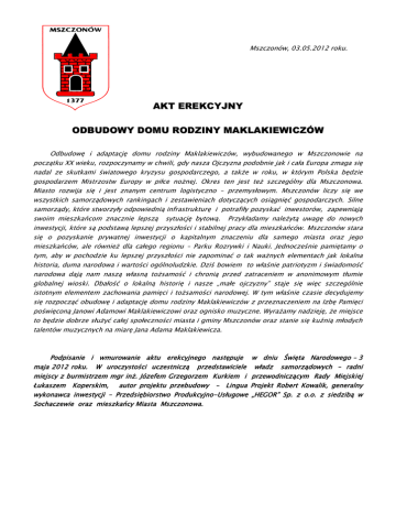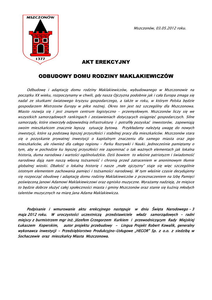 Mszczonów, 03.05.2012 roku. AKT EREKCYJNY ODBUDOWY DOMU RODZINY MAKLAKIEWICZÓW Odbudowę i adaptację domu rodziny Maklakiewiczów, wybudowanego w Mszczonowie na początku XX wieku, rozpoczynamy w chwili, gdy nasza Ojczyzna podobnie jak i cała Europa zmaga się nadal ze skutkami światowego kryzysu gospodarczego, a także w roku, w którym Polska będzie gospodarzem Mistrzostw Europy w piłce nożnej. Okres ten jest też szczególny dla Mszczonowa. Miasto rozwija się i jest znanym centrum logistyczno – przemysłowym. Mszczonów liczy się we wszystkich samorządowych rankingach i zestawieniach dotyczących osiągnięć gospodarczych. Silne samorządy, które stworzyły odpowiednią infrastrukturę i potrafiły pozyskać inwestorów, zapewniają swoim mieszkańcom znacznie lepszą sytuację bytową. Przykładamy należytą uwagę do nowych inwestycji, które są podstawą lepszej przyszłości i stabilnej pracy dla mieszkańców. Mszczonów stara się o pozyskanie prywatnej inwestycji o kapitalnym znaczeniu dla samego miasta oraz jego mieszkańców, ale również dla całego regionu – Parku Rozrywki i Nauki. Jednocześnie pamiętamy o tym, aby w pochodzie ku lepszej przyszłości nie zapominać o tak ważnych elementach jak lokalna historia, duma narodowa i wartości ogólnoludzkie. Dziś bowiem to właśnie patriotyzm i świadomość narodowa dają nam naszą własną tożsamość i chronią przed zatraceniem w anonimowym tłumie globalnej wioski. Dbałość o lokalną historię i nasze „małe ojczyzny” staje się więc szczególnie istotnym elementem zachowania pamięci i tożsamości narodowej. W tym właśnie czasie decydujemy się rozpocząć obudowę i adaptację domu rodziny Maklakiewiczów z przeznaczeniem na Izbę Pamięci poświęconą Janowi Adamowi Maklakiewiczowi oraz ognisko muzyczne. Wyrażamy nadzieję, że miejsce to będzie dobrze służyć całej społeczności miasta i gminy Mszczonów oraz stanie się kuźnią młodych talentów muzycznych na miarę Jana Adama Maklakiewicza. Podpisanie i wmurowanie aktu erekcyjnego następuje maja 2012 roku. W uroczystości uczestniczą przedstawiciele miejscy z burmistrzem mgr inż. Józefem Grzegorzem Kurkiem i Łukaszem Koperskim, autor projektu przebudowy – Lingua wykonawca inwestycji – Przedsiębiorstwo Produkcyjno-Usługowe Sochaczewie oraz mieszkańcy Miasta Mszczonowa. w dniu Święta Narodowego – 3 władz samorządowych – radni przewodniczącym Rady Miejskiej Projekt Robert Kowalik, generalny „HEGOR” Sp. z o.o. z siedzibą w