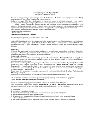 Trening Zastępowania Agresji (TZA) ( 90 godzin + 40 godzin praktyki ) Jest on adaptacją treningu opracowanego przez A. Goldsteina i B.Glicka oraz współpracowników (ART) z Instytutu Badań nad Agresją Uniwersytetu w Syracuse USA. Podstawą treningu TZA jest przekonanie, że agresywne dzieci i młodzież wykazują wiele braków w umiejętnościach interpersonalnych, planowaniu swoich sytuacji społecznych i radzeniu sobie z agresją. Ogólnie Trening Zastępowania Agresji zaliczany jest do grupy metod poznawczo-behawioralnych – to znaczy, wykorzystujących umiejętności i potrzebę poznawczej analizy sytuacji, w której znajdował lub znajduje się uczestnik treningu oraz znaczenie modelowania i pozytywnych wzmocnień przy zmianie zachowania. TZA jest trójetapową metodą szkoleniową, uczącą w trzech modułach: - umiejętności prospołecznych - kontroli złości - wnioskowania moralnego i empatii Jest metodą zaakceptowaną i rekomendowaną przez MEN Andrzej Kołodziejczyk, osoba prowadząca szkolenie, jest posiadaczem certyfikatu nadającego mu tytuł trenera Treningu TZA podpisali go - prof. Arnold Goldstein University of Syracuse NY i Trainer Mikael Kalt, Ungdomsalternativet ( Touth Alternatives) Training Director, European Center for Aggression Replacement Training. Uczestnicy: Warsztat dla nauczycieli, wychowawców, pedagogów, psychologów, pracowników socjalnych, kuratorów sądowych, policjantów, pracowników służb więziennych i innych osób zainteresowanych pracą z dziećmi i młodzieżą przejawiających wzmożony poziom agresywności. Organizacja szkolenia: Do uczestnictwa w warsztacie zapraszamy po dwóch pracowników z każdej instytucji, ze względu na wielokrotnie sprawdzoną konieczność prowadzenia zajęć z grupą we dwie osoby, dzięki czemu służą sobie nawzajem wsparciem i pomocą. Czas trwania warsztatu podstawowego obejmuje 50 godzin, realizowanych w module: 40 godzin (4 dni) oraz 10 godzin (1 dzień). Podczas pierwszego modułu prezentowane są Trening Kontroli Złości oraz Trening Umiejętności Prospołecznych. Część ta poświęcona jest także nabyciu przez uczestników umiejętności motywowania dzieci, młodzieży, dorosłych do udziału w zajęciach, ćwiczeniu umiejętności komunikacyjnych oraz radzenia sobie z oporem grupy. Druga część (20 godzin) poświęcona jest zapoznaniu się z założeniami i realizacją Treningu Wnioskowania Moralnego i Empatii. Uczestnicy otrzymują materiały (120 stron), niezbędne do samodzielnego prowadzenia zajęć. Po ukończeniu warsztatu podstawowego uczestnicy rozpoczynają pracę z własnymi grupami, która powinna trwać 15 tygodni (30 – 40 godzin). W trakcie prowadzenia grup przez uczestników odbędzie się spotkanie superwizyjne. Cykl warsztatowy zakończony zostanie dwudniowym (20 godzin) warsztatem podsumowującym pracę z grupami oraz złożenie na ręce prowadzących dokumentacji zajęć, które powinny zawierać: 1. 2. 3. 4. 5. opis grupy, scenariusze prowadzonych zajęć dokumentacja z realizacji zajęć zebrana od uczestników, w tym rysunki tematyczne, raporty z wykonywanych zadań domowych itp. kwestionariusze umiejętności społecznych (pretest i posttest) wypełnione przez uczestników zajęć lub /i ich opiekunów. 6. inne formy dokumentacji zajęć (fotografie, opracowania pisemne, zeszyty uczestników, nagrania) Przebieg warsztatu: W części pierwszej uczestnicy warsztatu zostaną zapoznani z: - podstawami wiedzy o mechanizmach grupowych, dynamice i fazach rozwoju grupy, zawierania kontaktu z grupą, motywowania uczestników do pracy w grupie, zjawiskach oporu grupowego i sposobów przeciwdziałania mu, mechanizmami powstawania i utrwalania zachowań agresywnych u dzieci i młodzieży oraz osób dorosłych, podstawami teoretycznymi, na których opiera się Trening Zastępowania Agresji, wynikami badań zachodnich, dotyczących sposobów ewaluacji oraz efektywności pracy metodą TZA w różnych ośrodkach i społecznościach lokalnych, metodyką prowadzenia treningu umiejętności prospołecznych, metodyką prowadzenia treningu kontroli złości, metodyką prowadzenia treningu wnioskowania moralnego, różnymi sposobami powstawania transferu umiejętności na sytuacje codziennego życia. Część druga poświęcona jest: - superwizji zajęć prowadzonych przez uczestników warsztatu W części trzeciej nastąpi : podsumowanie pracy wszystkich uczestników szkolenia na podstawie: - relacji z przebiegu całości zajęć, analizy napotkanych trudności, sukcesów oraz sytuacji nietypowych które miały miejsce w trakcie prowadzenia grupy, - analizy dokumentacji z przeprowadzonych zajęć, - analizy ewaluacji zajęć w postaci kwestionariusza umiejętności społecznych (dla uczestników i opiekunów) oraz ankiety ewaluacyjnej, - prezentacji dowolnych fragmentów swoich zajęć z grupą pod superwizją trenerów w gronie uczestników treningu. Przedstawienie pozytywnie ocenionego sprawozdania i dokumentacji z prowadzenia grupy metodą TZA oraz ocenionej pozytywnie powyższej prezentacji, zapewni uczestnikom otrzymanie zaświadczenia, uprawniającego do prowadzenia zajęć z dziećmi i młodzieżą metodą Treningu Zastępowania Agresji. Podsumowanie : Czas trwania: - 90 godzin I część – 5 dni w module 4 dni + 1 dni (50 godzin) II część – superwizja – 2 dni (20 godzin) III część - 2 dni (20 godzin) Liczebność grupy: od 14 do 18 osób. Koszt warsztatu: 1500 złotych od osoby, z możliwością wpłat w trzech ratach.