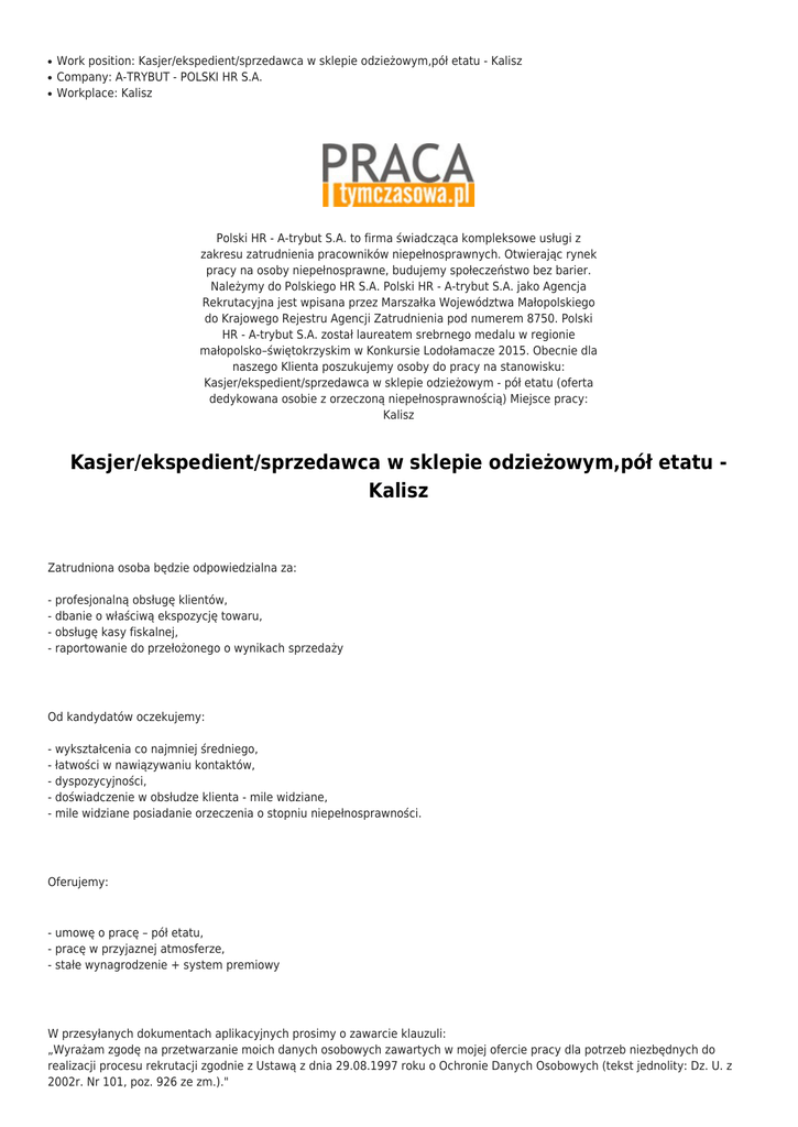 ● ● ● Work position: Kasjer/ekspedient/sprzedawca w sklepie odzieżowym,pół etatu - Kalisz Company: A-TRYBUT - POLSKI HR S.A. Workplace: Kalisz Polski HR - A-trybut S.A. to firma świadcząca kompleksowe usługi z zakresu zatrudnienia pracowników niepełnosprawnych. Otwierając rynek pracy na osoby niepełnosprawne, budujemy społeczeństwo bez barier. Należymy do Polskiego HR S.A. Polski HR - A-trybut S.A. jako Agencja Rekrutacyjna jest wpisana przez Marszałka Województwa Małopolskiego do Krajowego Rejestru Agencji Zatrudnienia pod numerem 8750. Polski HR - A-trybut S.A. został laureatem srebrnego medalu w regionie małopolsko–świętokrzyskim w Konkursie Lodołamacze 2015. Obecnie dla naszego Klienta poszukujemy osoby do pracy na stanowisku: Kasjer/ekspedient/sprzedawca w sklepie odzieżowym - pół etatu (oferta dedykowana osobie z orzeczoną niepełnosprawnością) Miejsce pracy: Kalisz Kasjer/ekspedient/sprzedawca w sklepie odzieżowym,pół etatu Kalisz Zatrudniona osoba będzie odpowiedzialna za: - profesjonalną obsługę klientów, - dbanie o właściwą ekspozycję towaru, - obsługę kasy fiskalnej, - raportowanie do przełożonego o wynikach sprzedaży Od kandydatów oczekujemy: - wykształcenia co najmniej średniego, - łatwości w nawiązywaniu kontaktów, - dyspozycyjności, - doświadczenie w obsłudze klienta - mile widziane, - mile widziane posiadanie orzeczenia o stopniu niepełnosprawności. Oferujemy: - umowę o pracę – pół etatu, - pracę w przyjaznej atmosferze, - stałe wynagrodzenie + system premiowy W przesyłanych dokumentach aplikacyjnych prosimy o zawarcie klauzuli: „Wyrażam zgodę na przetwarzanie moich danych osobowych zawartych w mojej ofercie pracy dla potrzeb niezbędnych do realizacji procesu rekrutacji zgodnie z Ustawą z dnia 29.08.1997 roku o Ochronie Danych Osobowych (tekst jednolity: Dz. U. z 2002r. Nr 101, poz. 926 ze zm.)." Zastrzegamy sobie prawo kontaktu z wybranymi kandydatami. Aplikuj Dane kontaktowe: A-TRYBUT - POLSKI HR S.A. Send Save Print Tweet