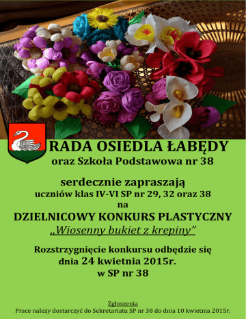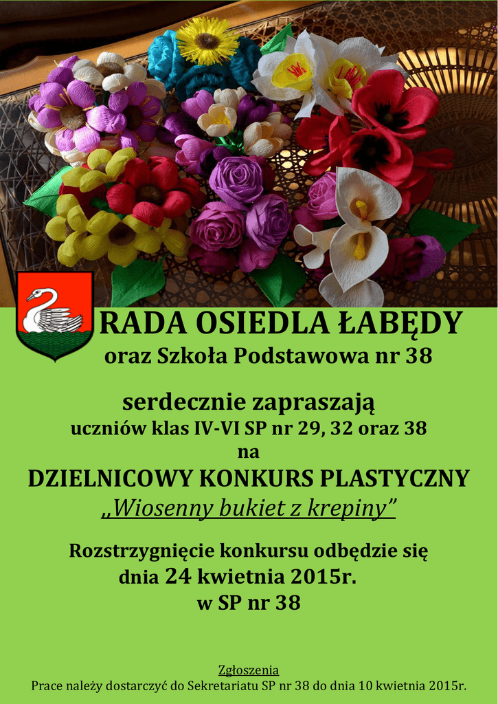 RADA OSIEDLA ŁABĘDY oraz Szkoła Podstawowa nr 38 serdecznie zapraszają uczniów klas IV-VI SP nr 29, 32 oraz 38 na DZIELNICOWY KONKURS PLASTYCZNY ,,Wiosenny bukiet z krepiny” Rozstrzygnięcie konkursu odbędzie się dnia 24 kwietnia 2015r. w SP nr 38 Zgłoszenia Prace należy dostarczyć do Sekretariatu SP nr 38 do dnia 10 kwietnia 2015r.