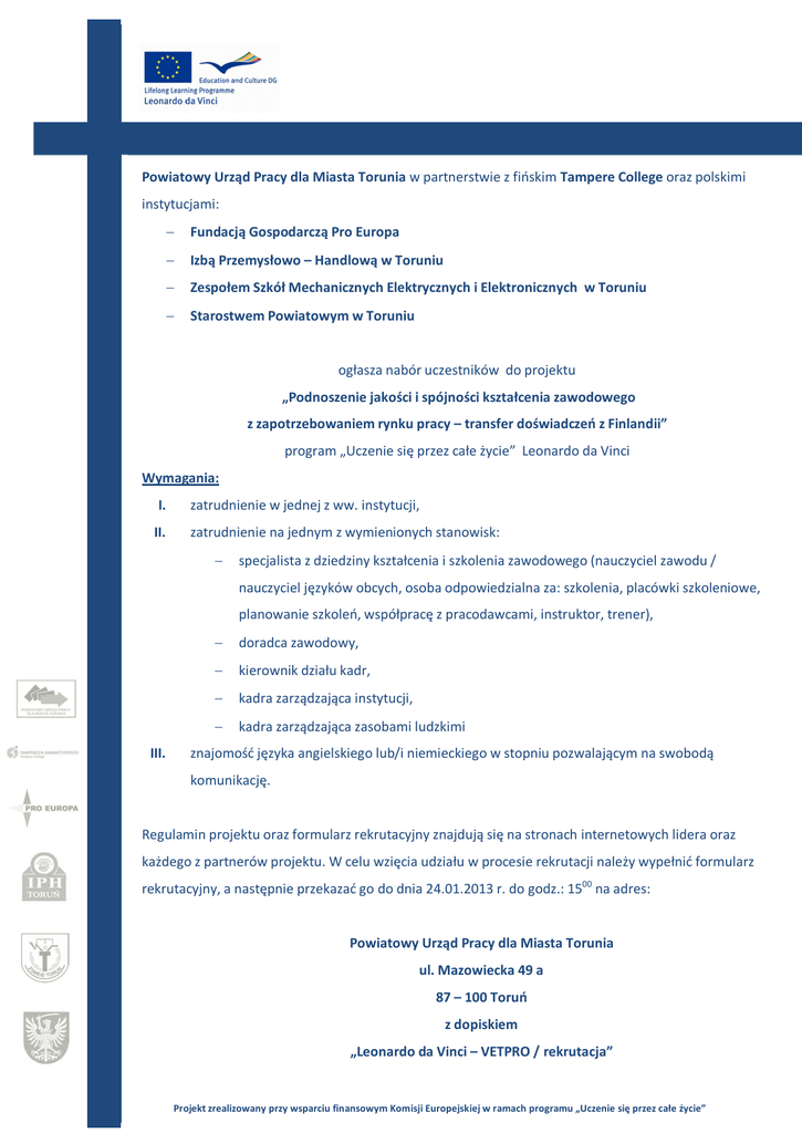 Powiatowy Urząd Pracy dla Miasta Torunia w partnerstwie z fińskim Tampere College oraz polskimi instytucjami: - Fundacją Gospodarczą Pro Europa - Izbą Przemysłowo – Handlową w Toruniu - Zespołem Szkół Mechanicznych Elektrycznych i Elektronicznych w Toruniu - Starostwem Powiatowym w Toruniu ogłasza nabór uczestników do projektu „Podnoszenie jakości i spójności kształcenia zawodowego z zapotrzebowaniem rynku pracy – transfer doświadczeń z Finlandii” program „Uczenie się przez całe życie” Leonardo da Vinci Wymagania: I. zatrudnienie w jednej z ww. instytucji, II. zatrudnienie na jednym z wymienionych stanowisk: - specjalista z dziedziny kształcenia i szkolenia zawodowego (nauczyciel zawodu / nauczyciel języków obcych, osoba odpowiedzialna za: szkolenia, placówki szkoleniowe, planowanie szkoleń, współpracę z pracodawcami, instruktor, trener), III. - doradca zawodowy, - kierownik działu kadr, - kadra zarządzająca instytucji, - kadra zarządzająca zasobami ludzkimi znajomość języka angielskiego lub/i niemieckiego w stopniu pozwalającym na swobodą komunikację. Regulamin projektu oraz formularz rekrutacyjny znajdują się na stronach internetowych lidera oraz każdego z partnerów projektu. W celu wzięcia udziału w procesie rekrutacji należy wypełnić formularz rekrutacyjny, a następnie przekazać go do dnia 24.01.2013 r. do godz.: 1500 na adres: Powiatowy Urząd Pracy dla Miasta Torunia ul. Mazowiecka 49 a 87 – 100 Toruń z dopiskiem „Leonardo da Vinci – VETPRO / rekrutacja” Projekt zrealizowany przy wsparciu finansowym Komisji Europejskiej w ramach programu „Uczenie się przez całe życie”