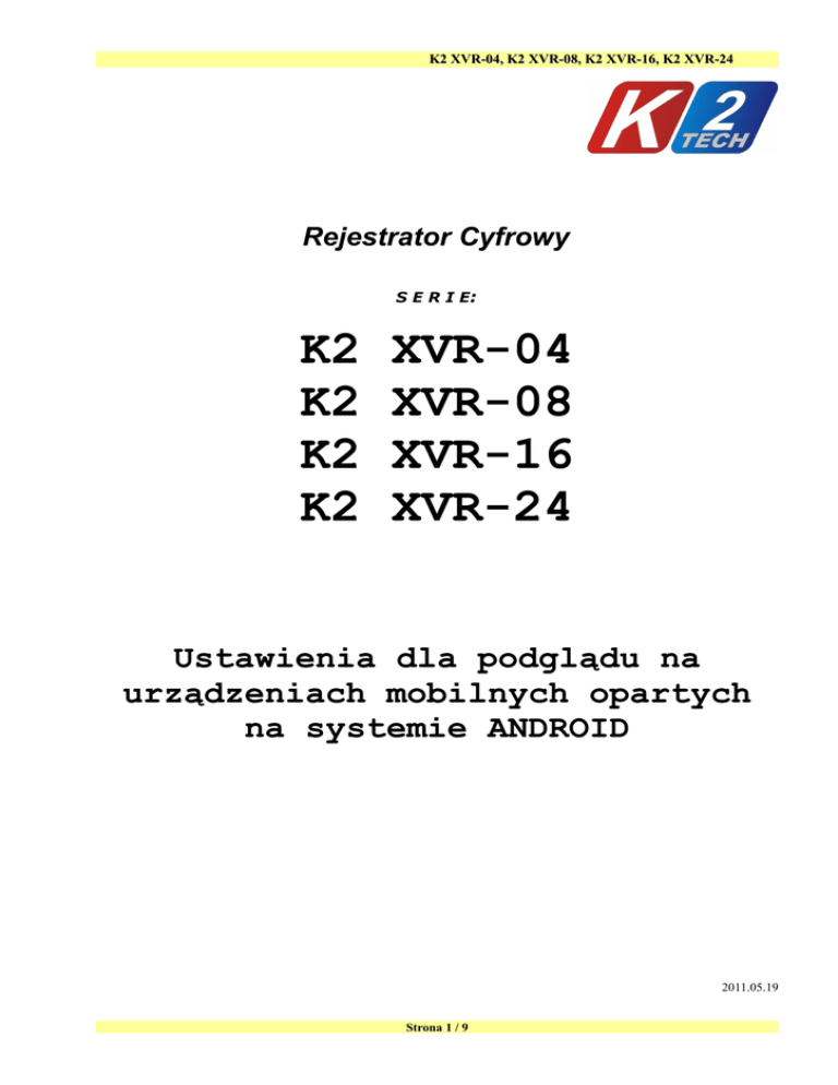 K2 XVR-04, K2 XVR-08, K2 XVR-16, K2 XVR-24 Rejestrator Cyfrowy S E R I E: K2 K2 K2 K2 XVR-04 XVR-08 XVR-16 XVR-24 Ustawienia dla podglądu na urządzeniach mobilnych opartych na systemie ANDROID 2011.05.19 Strona 1 / 9 K2 XVR-04, K2 XVR-08, K2 XVR-16, K2 XVR-24 SPIS TREŚCI 1. Komunikacja................................................................................................................................................................3 2. Urządzenia mobilne.....................................................................................................................................................3 3. Ustawienia w rejestratorze..........................................................................................................................................3 3.1 Sieci LAN..............................................................................................................................................................3 3.2 DDNS.....................................................................................................................................................................4 3.3 PPPOE....................................................................................................................................................................4 3.4 Serwer - (Platform server)......................................................................................................................................5 3.5 Ustawienia strumienia danych...............................................................................................................................6 4. Ustawienia routera.......................................................................................................................................................7 5. Ustawienia w urządzeniu mobilnym dla systemu ANDROID.................................................................................8 Strona 2 / 9 K2 XVR-04, K2 XVR-08, K2 XVR-16, K2 XVR-24 1. Komunikacja 2. Urządzenia mobilne Podgląd kamer poprzez rejestratory XVR powinna być możliwa na wszystkich urządzeniach opartych na systemie Android mających dostęp do sieci. Dla lepszej jakości połączeń zaleca się stosowanie łącz 3G lub WiFi. Producent przetestował działanie na na następujących urządzeniach: Google Nexus one HTC Desire HTC Hero HTC Magic SHARP SH8128U Lenovo LePhone Sony Ericsson X10i 3. Ustawienia w rejestratorze Aby rejestrator mógł wystawiać obrazy dla urządzeń mobilnych musi być dołączony do sieci Internet. Aby wejść do tych ustawień wchodzimy w Menu rejestratora> Ustaw sieci ....... 3.1 Sieci LAN W tej zakładce ustawiamy wszystkie parametry dotyczące pracy urządzenia w sieci komputerowej (kolumna Ustaw domyślne). Zaleca się aby nie wpisywać ustawień sieci i skorzystać z funkcji DHCP, jeżeli rejestrator będzie pracował w sieci komputerowej w której znajduje się np. router z serwerem DHCP. W takim przypadku wszystkie parametry sieci zostaną uzupełnione automatyczne. Strona 3 / 9 K2 XVR-04, K2 XVR-08, K2 XVR-16, K2 XVR-24 ◦ ◦ ◦ ◦ ◦ ◦ ◦ ◦ ◦ IP – to niepowtarzalny adres urządzenia w sieci. Jeżeli urządzenie pracuje w sieci lokalnej wszystkie parametry sieci powinniśmy uzyskać od administratora . Jeżeli sami chcemy zdefiniować parametry sieci, a nie mamy w tym temacie doświadczenia, polecamy zapoznać się z tematem umieszczonym pod tym adresem http://pl.wikipedia.org/wiki/Adres_prywatny Maska podsieci – jest ściśle związana z adresem IP, parametry powinniśmy uzyskać od administratora sieci. Główny DNS - parametry powinniśmy uzyskać od administratora sieci. Zapasowy DNS - parametry powinniśmy uzyskać od administratora sieci. Port poleceń – port ustawiony domyślnie przez producenta służy do komunikacji z dvrem w sieci komputerowej (jeżeli nie ma konieczności, proszę nie zmieniać tego parametru). Port HTTP – port do komunikacji za pomocą przeglądarki internetowej. Ze względu na to, że producent urządzenia wykorzystał technologię ActiveX (której właścicielem jest firma Microsoft) poprawny dostęp jest możliwy tylko za pomocą przeglądarki Internet Explorer. Port aktualizacji – port ustawiony przez producenta, proszę nie zmieniać tego parametru. Multicast – na dzień dzisiejszy funkcja nie do wykorzystania. Konfiguracja alternatywna - tu można ustawić alternatywne parametry sieci które zostaną zastosowane, jeżeli rejestrator nie skomunikuje się z serwerem DHCP. 3.2 DDNS Zakładka służy do zdefiniowania parametrów serwera DDNS. Funkcja ta umożliwia udostępnić zasoby rejestratora w Internecie jeżeli adresy IP są nadawane dynamicznie. Więcej informacji na ten temat można przeczytać pod tym adresem http://pl.wikipedia.org/wiki/DDNS 3.3 PPPOE Jest protokołem połączeniowym używanym w technologii ADSL. Wszelkie dane odnośnie konfiguracji dla tego protokołu powinniśmy uzyskać od usługodawcy internetowego. Strona 4 / 9 K2 XVR-04, K2 XVR-08, K2 XVR-16, K2 XVR-24 3.4 Serwer - (Platform server) Ustawienia portów urządzeń mobilnych Podświetlamy w oknie "HuaKe" i naciskamy "Load". Username - wpisujemy dowolną nazwę użytkownika Password - wpisujemy dowolne hasło którym będziemy się posługiwać w trakcie logowania poprzez urządzenie mobilne. Listen port - port nasłuchu, możliwe ustawienia w zakresie 1~65535. Fabryczna wartość 15966. Video ch. - wybieramy kanały video które będziemy przeglądać na urządzeniu mobilnym. Fabrycznie wszystkie włączone. Audio ch. - wybieramy kanały audio które chcemy nasłuchiwać. Fabrycznie wszystkie wyłączone. Strona 5 / 9 K2 XVR-04, K2 XVR-08, K2 XVR-16, K2 XVR-24 UWAGA! Pozostałe pola proszę zostawić na wartościach domyślnych. Aby zapamiętać ustawienia wybieramy przycisk "Connect" 3.5 Ustawienia strumienia danych Dla poprawnego oglądania obrazów z kamer na urządzeniach mobilnych należy odpowiednio ustawi