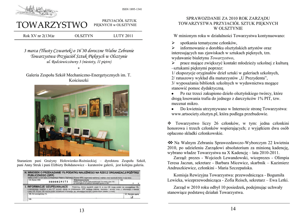 ISSN 1895-1341 TOWARZYSTWO Rok XV nr 2(136)e PRZYJACIÓŁ SZTUK PIĘKNYCH w OLSZTYNIE OLSZTYN LUTY 2011 3 marca (Tłusty Czwartek) o 16’30 doroczne Walne Zebranie Towarzystwa Przyjaciół Sztuk Pięknych w Olsztynie ul. Rodziewiczówny 3 (niestety, II piętro) Galeria Zespołu Szkół Mechaniczno-Energetycznych im. T. Kościuszki SPRAWOZDANIE ZA 2010 ROK ZARZĄDU TOWARZYSTWA PRZYJACIÓŁ SZTUK PIĘKNYCH W OLSZTYNIE W minionym roku w działalności Towarzystwa kontynuowano: spotkania tematyczne członków, informowanie o dorobku olsztyńskich artystów oraz interesujących nas zjawiskach w sztukach pięknych, tzn. wydawanie biuletynu Towarzystwo, prace mające zwiększyć kontakt młodzieży szkolnej z kulturą –sztukami pięknymi poprzez: 1/ ekspozycje oryginałów dzieł sztuki w galeriach szkolnych, 2/ ratuszowy wykład dla maturzystów „U Prezydenta”, 3/ wyposażania bibliotek szkolnych w wydawnictwa mogące stanowić pomoc dydaktyczną. Po raz trzeci zakupiono dzieło olsztyńskiego twórcy, które drogą losowania trafia do jednego z darczyńców 1% PIT, tzw. mecenat mikro. Do kwietnia utrzymywano w Internecie stronę Towarzystwa: www.artsociety.olsztyn.pl, która podlega przebudowie. Towarzystwo liczy 26 członków, w tym: jedna członkini honorowa i trzech członków wspierających; z wyjątkiem dwu osób opłacono składki członkowskie. Staraniem pani Grażyny Hołowienko-Rożnieckiej – dyrektora Zespołu Szkół, pani Anny Struk i pani Elżbiety Bohdanowicz – kuratorów galerii, jest kolejna galeria. Na Walnym Zebraniu Sprawozdawczo-Wyborczym 22 kwietnia 2010, po udzieleniu Zarządowi absolutorium za minioną kadencję, wybrano władze Towarzystwa na X Kadencję – lata 2010-2011. Zarząd: prezes - Wojciech Lewandowski, wiceprezes - Olimpia Teresa Jaczun, sekretarz - Barbara Micewicz, skarbnik – Kazimierz Andruszkiewicz, członkini - Maria Szczepańska. Komisja Rewizyjna Towarzystwa: przewodnicząca - Bogumiła Lewicka, wiceprzewodnicząca - Zofia Reisch, sekretarz – Ewa Letki. Zarząd w 2010 roku odbył 10 posiedzeń, podejmując uchwały stanowiące podstawę działań Towarzystwa. 13 14 Działalność statutowa Realizowano przyjęty plan roczny, zgodny z kierunkami uchwalonymi przez Walne Zgromadzenie Sprawozdawczo-Wyborcze. 1. Spotkania - walne zebrania, których w roku sprawozdawczym było siedem, miały miejsce w lokalu Towarzystwa: Centrum Szkolnych Galerii Sztuki TPSP, a dwa z nich poza nim. Tematy spotkań: 16 lutego – Twórczość Aleksandra Gierymskiego - Bogumiła Lewicka 22 kwietnia - Walne Zgromadzenie Sprawozdawczo-Wyborcze TPSP 22 maja – wyjazd do Muzeum w Lidzbarku Warmińskim (wystawy: Malarstwo polskie XX w., Malarstwo religijne ze zbiorów Muzeum, Portrety rodziny hrabiów z Siecina Krasickich) 17 czerwca – Towarzystwa spotkanie herbaciane – (towarzyskie) 21 października – spotkanie z Ireną Bernatowicz oraz pokaz jej filmów z Hieronimem Skurpskim. 16 listopada - w Ratuszu wykład prof. Piotra Obarka Przybliżyć literę oraz wystawa Ewy Plichta-Lubienieckiej – Pejzaż. 9 grudnia – spotkanie opłatkowe z prezentacją prac członków. W spotkaniach uczestniczyło 7 do 12 członków, a na ratuszowym wykładzie „U Prezydenta” były 124 osoby. Tematy spotkań staraliśmy się dokumentować w biuletynach. 2. Wydawnictwa – trzy rodzaje: biuletyn, karnety z reprodukcjami, Internet i zapis cyfrowy (CDR). A. Biuletyn Towarzystwo Przyjaciół Sztuk Pięknych w Olsztynie – numerów 10 (trzy podwójne); łącznie 68 stron, nakład 100 egzemplarzy oraz wersja Internetowa rozsyłana na 80 adresów (e-mail). Biuletyn Towarzystwo otrzymywało 180 adresatów: członkowie, darczyńcy 1% i sympatycy, instytucje, w tym biblioteki: Narodowa, Wojewódzka, Ośrodka Badań Naukowych, Muzeum Warmii i Mazur, uczestniczący w wykładzie i 18 bibliotek szkolnych. Grudniowy numer - w nowej szacie graficznej – był drukowany na własnej kolorowej drukarce laserowej. B. Nasze Miasto Olsztyn – miniaturowe reprodukcje, karnety w obwolucie – zeszyt 9. pt. Wykładowcy Pracowni Projektowania Graficznego w Instytucie Sztuk Pięknych Uniwersytetu WarmińskoMazurskiego (nakład 600 egz.). 15 C. Strona internetowa Towarzystwa działała do maja, obecnie wymaga przebudowy i opłacenia domeny. - Przygotowano cyfrowe prezentacje ekspozycji w galeriach szkolnych na płytach CDR, część z nich przekazano do szkół i władzom miasta. 3. Działania na rzecz zwiększania kontaktu młodzieży szkolnej z kulturą – sztukami pięknymi rozwijano kontynuując dotychczasowe prace. A. Doskonalono program Galeria Sztuki w Szkole, będący realizacją idei Towarzystwa, zakładającej towarzyszenie dzieł sztuki w trakcie zajęć szkolnych, min. pozyskano, do ekspozycji w szkolnych galeriach sztuki obraz Jana Przełomca Ulica Piastowska z wieżą Ratusza, a także pastele Marii Szczepańskiej. W sześciu szkolnych galeriach sztuki eksponowano siedem tytułów w dziesięciu wystawach: - Z Katedry Sztuk Pięknych Uniwersytetu Warmińsko-Mazurskiego (Pracownia Malarstwa i Rysunku - prof. Aleksandra Simińska: absolwenci i dyplomanci 2005) - Warsztat graficzny Katedry Sztuk Pięknych Uniwersytetu WarmińskoMazurskiego (Pracownia Grafiki Warsztatowej - prof. Małgorzata Chomicz: wykładowcy, absolwenci, studenci 2006-07). - Ewa Plichta-Lubieniecka – Pejzaż - collage. - Piotr Obarek - Rysunki piórkiem – rysunek. - Maria Szczepańska – Z mojego ogrodu – malarstwo. - Alexander Jagelowitz - Aleksandra Jagelowitz–Kaźmierczaka prace z lat 1970-72 i 2007 - rysunek, malarstwo. - Portret pokolenia twórców olsztyńskich – malarstwo, grafika, fotografia, poezja. Po wykładzie „U Prezydenta” w Sali Obrad Rady Miasta w Ratuszu do 15 grudnia była czynna wystawa pani Ewy Plichta-Lubienieckiej – Pejzaż, którą poza słuchaczami wykładu adresowano do działaczy samorządu, gremiów zbierających się tam w okresie ekspozycji oraz pracowników Urzędu Miasta. 
