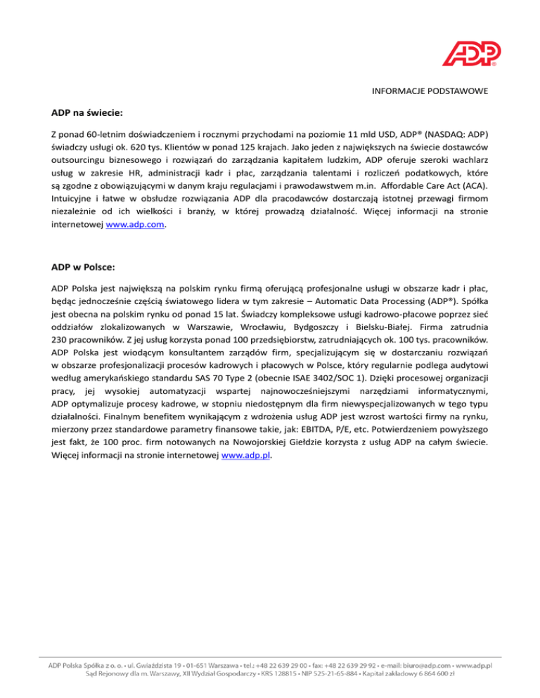 INFORMACJE PODSTAWOWE ADP na świecie: Z ponad 60-letnim doświadczeniem i rocznymi przychodami na poziomie 11 mld USD, ADP® (NASDAQ: ADP) świadczy usługi ok. 620 tys. Klientów w ponad 125 krajach. Jako jeden z największych na świecie dostawców outsourcingu biznesowego i rozwiązań do zarządzania kapitałem ludzkim, ADP oferuje szeroki wachlarz usług w zakresie HR, administracji kadr i płac, zarządzania talentami i rozliczeń podatkowych, które są zgodne z obowiązującymi w danym kraju regulacjami i prawodawstwem m.in. Affordable Care Act (ACA). Intuicyjne i łatwe w obsłudze rozwiązania ADP dla pracodawców dostarczają istotnej przewagi firmom niezależnie od ich wielkości i branży, w której prowadzą działalność. Więcej informacji na stronie internetowej www.adp.com. ADP w Polsce: ADP Polska jest największą na polskim rynku firmą oferującą profesjonalne usługi w obszarze kadr i płac, będąc jednocześnie częścią światowego lidera w tym zakresie – Automatic Data Processing (ADP®). Spółka jest obecna na polskim rynku od ponad 15 lat. Świadczy kompleksowe usługi kadrowo-płacowe poprzez sieć oddziałów zlokalizowanych w Warszawie, Wrocławiu, Bydgoszczy i Bielsku-Białej. Firma zatrudnia 230 pracowników. Z jej usług korzysta ponad 100 przedsiębiorstw, zatrudniających ok. 100 tys. pracowników. ADP Polska jest wiodącym konsultantem zarządów firm, specjalizującym się w dostarczaniu rozwiązań w obszarze profesjonalizacji procesów kadrowych i płacowych w Polsce, który regularnie podlega audytowi według amerykańskiego standardu SAS 70 Type 2 (obecnie ISAE 3402/SOC 1). Dzięki procesowej organizacji pracy, jej wysokiej automatyzacji wspartej najnowocześniejszymi narzędziami informatycznymi, ADP optymalizuje procesy kadrowe, w stopniu niedostępnym dla firm niewyspecjalizowanych w tego typu działalności. Finalnym benefitem wynikającym z wdrożenia usług ADP jest wzrost wartości firmy na rynku, mierzony przez standardowe parametry finansowe takie, jak: EBITDA, P/E, etc. Potwierdzeniem powyższego jest fakt, że 100 proc. firm notowanych na Nowojorskiej Giełdzie korzysta z usług ADP na całym świecie. Więcej informacji na stronie internetowej www.adp.pl.