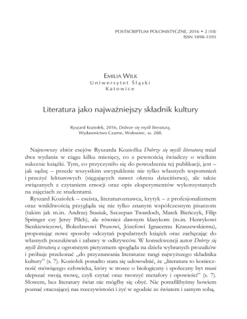 POSTSCRIPTUM POLONISTYCZNE, 2016 • 2 (18) ISSN 1898-1593 EMILIA WILK Uniwersytet klski Katowice Literatura jako najwaniejszy skadnik kultury Ryszard Kozioek, 2016, Dobrze siÆ myyli literatur, Wydawnictwo Czarne, Woowiec, ss. 288. Najnowszy zbiór esejów Ryszarda Kozioâka Dobrze się myœli literaturĊ miaâ dwa wydania w ciĊgu kilku miesięcy, co z pewnoœciĊ œwiadczy o wielkim sukcesie ksiĊůki. Tym, co przyczyniâo się do powodzenia tej publikacji, jest – jak sĊdzę – przede wszystkim uwypuklenie nie tylko wâasnych wspomnieľ i przeůyý lekturowych (sięgajĊcych nawet okresu dzieciľstwa), ale takůe zwiĊzanych z czytaniem emocji oraz opis eksperymentów wykorzystanych na zajęciach ze studentami. Ryszard Kozioâek – eseista, literaturoznawca, krytyk – z profesjonalizmem oraz wnikliwoœciĊ przyglĊda się nie tylko znanym wspóâczesnym pisarzom (takim jak m.in. Andrzej Stasiuk, Szczepan Twardoch, Marek Bieľczyk, Filip Springer czy Jerzy Pilch), ale równieů dawnym klasykom (m.in. Henrykowi Sienkiewiczowi, Bolesâawowi Prusowi, Józefowi Ignacemu Kraszewskiemu), proponujĊc nowe sposoby odczytaľ popularnych ksiĊůek oraz zachęcajĊc do wâasnych poszukiwaľ i zabawy w odkrywców. W konsekwencji autor Dobrze się myœli literaturĊ z ogromnym pietyzmem spoglĊda na dzieâa wybranych prozaików i próbuje przekonaý „do przyznawania literaturze rangi najwyůszego skâadnika kultury” (s. 7). Kozioâek ponadto stara się udowodniý, ůe „literatura to koniecznoœý mówiĊcego czâowieka, który w trosce o biologiczny i spoâeczny byt musi ulepszaý swojĊ mowę, czyli czytaý oraz tworzyý metafory i opowieœci” (s. 7). Sâowem, bez literatury œwiat nie mógâby się obyý. Nie potrafilibyœmy bowiem poznaý otaczajĊcej nas rzeczywistoœci i ůyý w zgodzie ze œwiatem i samym sobĊ. 236 POSTSCRIPTUM POLONISTYCZNE, 2016 • 2 (18) Literatura staje się zatem przestrzeniĊ godnĊ zaufania i poznania. PojawiajĊ się tu jednakůe dwa kontrastowe spojrzenia. Z jednej strony, choý coraz mniej osób sięga po ksiĊůki, Kozioâek przekonuje, ůe literaturze nie grozi znalezienie się na przegranej pozycji wœród wszechobecnych propozycji kulturowych, gdyů do tej pory nic nie byâo w stanie zastĊpiý ůywej lektury – ani kino i telewizja, ani prasa czy internet. Media bowiem nie potrafiĊ dostarczyý tyle dobra, ile język wyâuskany z literatury. Aczkolwiek aby œwiat nie pozostaâ bez moůliwoœci porozumiewania się, coraz częœciej lekturę moůna odnaleŭý w formie adaptacji – zarówno kinowej, teatralnej, jak i muzycznej. To gwarantuje podstawy spoâecznej komunikacji. Po drugie, gdyby lektury pochâonęây nas caâkowicie, więcej wynikâoby z tego szkody niů poůytku. To dzięki literackiej fikcji potrafimy abstrakcyjnie myœleý oraz zauwaůaý poâĊczenie rzeczywistoœci z opowieœciĊ, a takůe oddzielaý opisywany obszar od realnego œwiata. Jednoczeœnie eseista zwraca uwagę na to, ůe ubóstwo sâownikowe jest konsekwencjĊ nieczytania. Wszak, jak przekonuje, „Mamy tylko literaturę, by doskonaliý myœlenie, czyli œwiadome nazywanie i porozumiewanie się” (s. 11). Czytelnicy oczekujĊ zwykle od literatury tego, by pokazywaâa nowoœci, œwiat do tej pory niepoznany, niespotykany. PoůĊdajĊ równieů codziennoœci, która powinna staý się nadzwyczajna. Aby uwznioœliý codziennoœý, literaturoznawca zagâębia się we wâasne doœwiadczenia czytelnicze, a zarazem obrazuje emocje towarzyszĊce czytaniu. PojawiajĊ się zarówno wspomnienia z okresu dzieciľstwa, jak i czasu, gdy Kozioâek byâ nastolatkiem. Autor przywoâuje Ukâad Elii Kazana, który odnalazâ na strychu bez okâadki i czytaâ wielokrotnie bez œwiadomoœci tytuâu, czy Grę w klasy Julio Cortázara oraz Lassie, wróý! i Sam Small lata znowu. Niezwykâe przygody latajĊcego Jorkszyrczyka Erica Knighta. Przypomina takůe takie tytuây jak O psie, który jeŭdziâ kolejĊ Romana Pisarskiego czy Œmierý pięknych saren Oty Pavla, podkreœlajĊc, ůe dobra lektura powinna wzbudzaý skrajne emocje w czytelniku – nie tylko te pozytywne, ale równieů graniczne („w lekturze bywamy sadystami, szowinistami, wydajemy niesprawiedliwe sĊdy, stajemy się stronnikami zbrodniarzy, poniewaů literatura wâaœnie to, między innymi, chce z nami robiý – wydobyý naszĊ emocjonalnoœý” s. 9). Zadaniem literatury jest więc skupienie się na naszych ukrytych emocjach oraz ukazanie odczuý do tej pory nieznanych. Bogactwo przeůyý czytelniczych pozwala przygotowaý się do realnych doznaľ, które mogĊ nas (bĊdŭ naszych bliskich) spotkaý. Mamy moůliwoœý przeůycia tych samych emocji dzięki ksiĊůce oraz w rzeczywistoœci. To coœ w rodzaju déjà vu, dzięki któremu poznawany œwiat stanie się nam bliůszy i lepiej znany. EMILIA WILK: Literatura jako najwaniejszy skadnik kultury… 237 Autor Dobrze się myœli literaturĊ przedstawia propozycje lektur. Podpowiada, ůe czytelnik powinien pozwoliý na pojawienie się uczuciowoœci, a w następnej kolejnoœci postaraý się o „wyzwolenie się spod wâadzy emocjonalnej, jakĊ ma nad nami tekst” (s. 9). Kozioâek napisaâ ksiĊůkę o nieprofesjonalnym czytaniu, dlatego teů jest ona przeznaczona dla kaůdego. Moůliwe, ůe jednym z zamiarów eseisty byâa chęý uwypuklenia, iů to wâaœnie literatura jest nadrzędnym dyskursem, oferujĊcym ponadpokoleniowe porozumienie. Badacz dokonaâ bardzo ciekawego zestawienia lektur, nie tylko dzieli się z innymi wâasnymi fascynacjami literackimi, ale takůe nawiĊzuje z nimi niý porozumienia, gdyů mówi o pisarzach funkcjonujĊcych w œwiadomoœci czytelniczej. Ale Dobrze się myœli literaturĊ to coœ więcej. Zamiarem Kozioâka byâo przedstawienie krótkiej historii literatury polskiej od XIX wieku po lata wspóâczesne. Szkice bowiem zostaây uâoůone tak, by poprowadziý czytelnika przez chronologicznĊ opowieœý. Kozioâek prezentuje tematy, kt