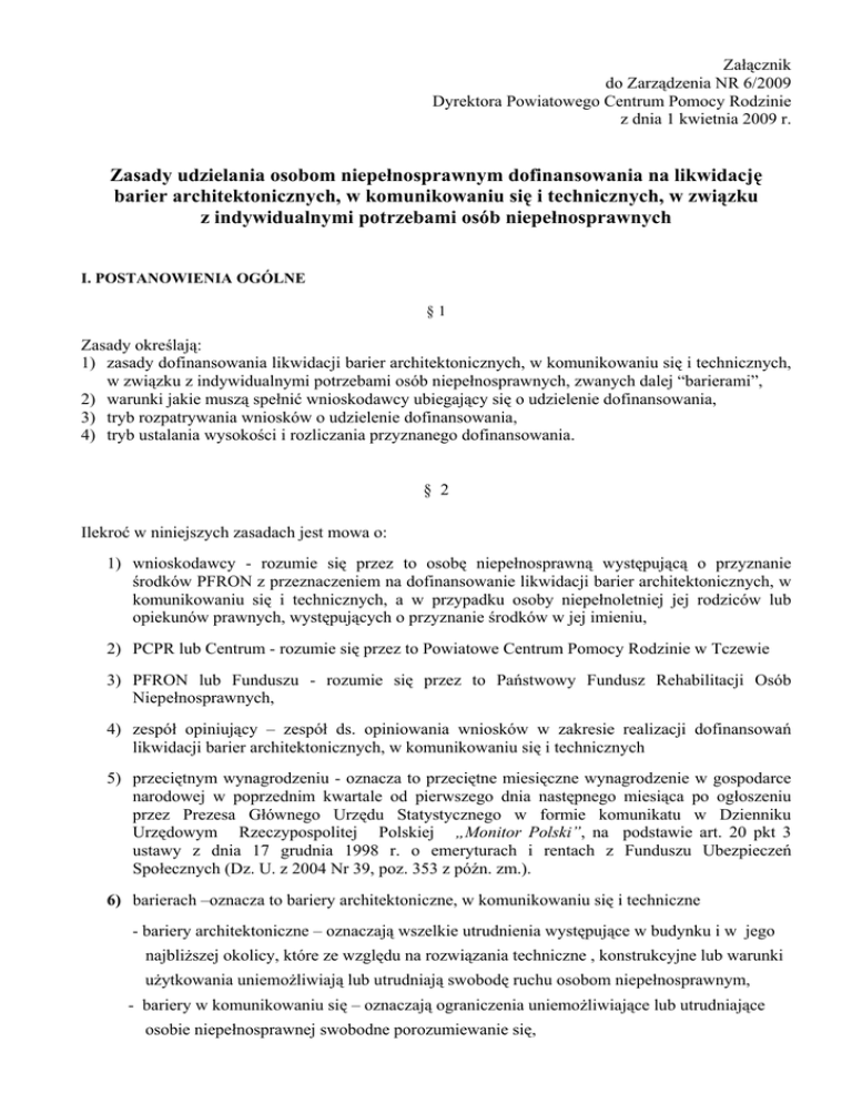 Załącznik do Zarządzenia NR 6/2009 Dyrektora Powiatowego Centrum Pomocy Rodzinie z dnia 1 kwietnia 2009 r. Zasady udzielania osobom niepełnosprawnym dofinansowania na likwidację barier architektonicznych, w komunikowaniu się i technicznych, w związku z indywidualnymi potrzebami osób niepełnosprawnych I. POSTANOWIENIA OGÓLNE §1 Zasady określają: 1) zasady dofinansowania likwidacji barier architektonicznych, w komunikowaniu się i technicznych, w związku z indywidualnymi potrzebami osób niepełnosprawnych, zwanych dalej “barierami”, 2) warunki jakie muszą spełnić wnioskodawcy ubiegający się o udzielenie dofinansowania, 3) tryb rozpatrywania wniosków o udzielenie dofinansowania, 4) tryb ustalania wysokości i rozliczania przyznanego dofinansowania. § 2 Ilekroć w niniejszych zasadach jest mowa o: 1) wnioskodawcy - rozumie się przez to osobę niepełnosprawną występującą o przyznanie środków PFRON z przeznaczeniem na dofinansowanie likwidacji barier architektonicznych, w komunikowaniu się i technicznych, a w przypadku osoby niepełnoletniej jej rodziców lub opiekunów prawnych, występujących o przyznanie środków w jej imieniu, 2) PCPR lub Centrum - rozumie się przez to Powiatowe Centrum Pomocy Rodzinie w Tczewie 3) PFRON lub Funduszu - rozumie się przez to Państwowy Fundusz Rehabilitacji Osób Niepełnosprawnych, 4) zespół opiniujący – zespół ds. opiniowania wniosków w zakresie realizacji dofinansowań likwidacji barier architektonicznych, w komunikowaniu się i technicznych 5) przeciętnym wynagrodzeniu - oznacza to przeciętne miesięczne wynagrodzenie w gospodarce narodowej w poprzednim kwartale od pierwszego dnia następnego miesiąca po ogłoszeniu przez Prezesa Głównego Urzędu Statystycznego w formie komunikatu w Dzienniku Urzędowym Rzeczypospolitej Polskiej „Monitor Polski”, na podstawie art. 20 pkt 3 ustawy z dnia 17 grudnia 1998 r. o emeryturach i rentach z Funduszu Ubezpieczeń Społecznych (Dz. U. z 2004 Nr 39, poz. 353 z późn. zm.). 6) barierach –oznacza to bariery architektoniczne, w komunikowaniu się i techniczne - bariery architektoniczne – oznaczają wszelkie utrudnienia występujące w budynku i w jego najbliższej okolicy, które ze względu na rozwiązania techniczne , konstrukcyjne lub warunki użytkowania uniemożliwiają lub utrudniają swobodę ruchu osobom niepełnosprawnym, - bariery w komunikowaniu się – oznaczają ograniczenia uniemożliwiające lub utrudniające osobie niepełnosprawnej swobodne porozumiewanie się, - bariery techniczne - oznaczają bariery utrudniające lub uniemożliwiające osobie niepełnosprawnej funkcjonowanie społeczne; likwidacja tej bariery powinna powodować sprawniejsze działanie tej osoby w społeczeństwie i umożliwić jej funkcjonowanie w życiu codziennym . II. ZASADY DOFINANSOWANIA LIKWIDACJI BARIER §3 1. O zakwalifikowaniu wniosku do realizacji w danym roku budżetowym oraz o wysokości dofinansowania decyduje zespól opiniujący w ramach środków określonych corocznie w uchwale Rady Powiatu Tczewskiego. 2. Przyznanie dofinansowania na likwidację barier i jego wysokość uzależnione są od posiadanych środków finansowych przeznaczonych na ten cel. 3. Przyznanie dofinansowania następuje na podstawie umowy zawartej pomiędzy wnioskodawcą a Dyrektorem PCPR działającym z upoważnienia Starosty. 4. Wysokość dofinansowania wynosi do 80% kosztów przedsięwzięcia, nie więcej jednak niż do wysokości piętnastokrotnego przeciętnego wynagrodzenia. 5. Dofinansowanie likwidacji barier w komunikowaniu się i technicznych nie przysługuje osobom niepełnosprawnym, które w ciągu ostatnich trzech lat od daty złożenia wniosku uzyskały odpowiednio na te cele dofinansowanie z Funduszu ( trzy lata liczy się od daty ostatniego przelewu środków finansowych będących rozliczeniem zadania ). 6. W przypadku dofinansowania likwidacji barier architektonicznych nie jest możliwe dofinansowanie powtórnie takiego samego zakresu prac, chyba że nastąpiło istotne pogorszenie stanu zdrowia osoby niepełnosprawnej, potwierdzone odpowiednią dokumentacją lekarską. Dofinansowanie takie może być udzielone nie wcześniej niż po upływie trzech lat. 7. Dofinansowanie likwidacji barier nie przysługuje osobom, które w ciągu trzech lat od daty złożenia wniosku były stroną umowy o dofinansowanie ze środków Funduszu, rozwiązanej z przyczyn leżących po stronie osoby niepełnosprawnej. 8. Dofinansowaniem ze środków Funduszu może być objęta likwidacja barier architektonicznych i technicznych w budynkach już istniejących - bariery muszą zaistnieć, aby mogły być zlikwidowane. Dofinansowaniem nie może być objęte dostosowanie nowo wybudowanego budynku lub będącego w trakcie prac wykończeniowych – do potrzeb osób niepełnosprawnych. 9. Wydatki na likwidację barier powinny być dokonane w sposób celowy i oszczędny, z zachowaniem zasady uzyskania najlepszych efektów. 10. Dofinansowanie nie może obejmować kosztów realizacji zadania poniesionych przed przyznaniem środków finansowych i zawarciem umowy o dofinansowanie ze środków Funduszu. 11. Wnioskodawca, może złożyć wniosek o dofinansowanie likwidacji barier w każdym czasie. 12. Realizacja zadania następuje w roku budżetowym, w którym przyznano dofinansowanie, zgodnie z zawarta umową. 13. Jeżeli wnioskodawca zmarł przed rozpatrzeniem wniosku, nie podlega on dalszemu rozpatrywaniu. Jeżeli zmarł po podpisaniu umowy, a przed jej realizacją, dofinansowanie może być wypłacone tylko za usługi wykonane i urządzenia zakupione przed zgonem Wnioskodawcy. 14. W przypadku nagłego pogorszenia stanu zdrowia wymagającego likwidacji barier architektonicznych wniosek może zostać rozpatrzony poza kolejnością. 15. O przyznaniu bądź odmowie przyznania środków Funduszu Centrum powiadamia Wnioskodawcę pisemnie. Od rozstrzygnięcia Centrum nie przysługuje odwołanie w myśl kodeks