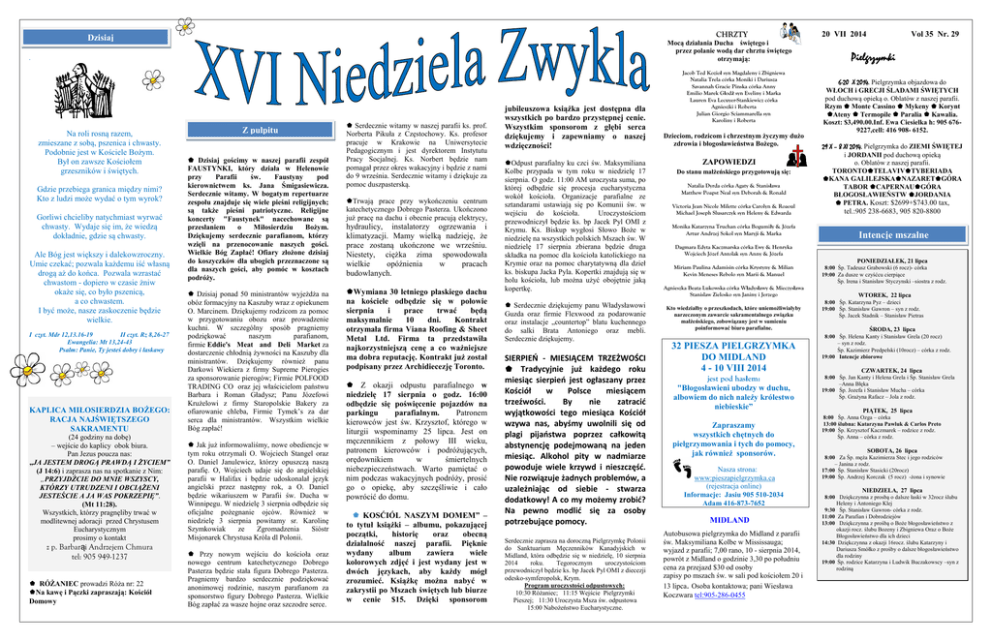 CHRZTY Dzisiaj Mocą działania Ducha świętego i przez polanie wodą dar chrztu świętego otrzymają: . Na roli rosną razem, zmieszane z sobą, pszenica i chwasty. Podobnie jest w Kościele Bożym. Był on zawsze Kościołem grzeszników i świętych. Gdzie przebiega granica między nimi? Kto z ludzi może wydać o tym wyrok? Gorliwi chcieliby natychmiast wyrwać chwasty. Wydaje się im, że wiedzą dokładnie, gdzie są chwasty. Ale Bóg jest większy i dalekowzroczny. Umie czekać; pozwala każdemu iść własną drogą aż do końca. Pozwala wzrastać chwastom - dopiero w czasie żniw okaże się, co było pszenicą, a co chwastem. I być może, nasze zaskoczenie będzie wielkie. Z pulpitu Dzisiaj gościmy w naszej parafii zespół FAUSTYNKI, który działa w Helenowie przy Parafii św. Faustyny pod kierownictwem ks. Jana Śmigasiewicza. Serdecznie witamy. W bogatym repertuarze zespołu znajduje się wiele pieśni religijnych; są także pieśni patriotyczne. Religijne koncerty "Faustynek" nacechowane są przesłaniem o Miłosierdziu Bożym. Dziękujemy serdecznie parafianom, którzy wzięli na przenocowanie naszych gości. Wielkie Bóg Zapłać! Ofiary złożone dzisiaj do koszyczków dla ubogich przeznaczone są dla naszych gości, aby pomóc w kosztach podróży. KAPLICA MIŁOSIERDZIA BOŻEGO: RACJA NAJŚWIĘTSZEGO SAKRAMENTU Dzisiaj ponad 50 ministrantów wyjeżdża na obóz formacyjny na Kaszuby wraz z opiekunem O. Marcinem. Dziękujemy rodzicom za pomoc w przygotowaniu obozu oraz prowadzenie kuchni. W szczególny sposób pragniemy podziękować naszym parafianom, firmie Eddie's Meat and Deli Market za dostarczenie chłodnią żywności na Kaszuby dla ministrantów. Dziękujemy również panu Darkowi Wiekiera z firmy Supreme Pierogies za sponsorowanie pierogów; Firmie POLFOOD TRADING CO oraz jej właścicielom państwu Barbara i Roman Gładysz; Panu Józefowi Krużelowi z firmy Staropolskie Bakery za ofiarowanie chleba, Firmie Tymek’s za dar serca dla ministrantów. Wszystkim wielkie Bóg zapłać! (24 godziny na dobę) – wejście do kaplicy obok biura. Pan Jezus poucza nas: „JA JESTEM DROGĄ PRAWDĄ I ŻYCIEM” (J 14:6) i zaprasza nas na spotkanie z Nim: „PRZYJDŹCIE DO MNIE WSZYSCY, KTÓRZY UTRUDZENI I OBCIĄŻENI JESTEŚCIE A JA WAS POKRZEPIĘ”. (Mt 11:28). Wszystkich, którzy pragnęliby trwać w modlitewnej adoracji przed Chrystusem Eucharystycznym prosimy o kontakt Jak już informowaliśmy, nowe obediencje w tym roku otrzymali O. Wojciech Stangel oraz O. Daniel Janulewicz, którzy opuszczą naszą parafię. O, Wojciech udaje się do angielskiej parafii w Halifax i będzie udoskonalał język angielski przez następny rok, a O. Daniel będzie wikariuszem w Parafii św. Ducha w Winnipegu. W niedzielę 3 sierpnia odbędzie się oficjalne pożegnanie ojców. Również w niedzielę 3 sierpnia powitamy sr. Karolinę Szymkowiak ze Zgromadzenia Sióstr Misjonarek Chrystusa Króla dl Polonii. I czyt. Mdr 12,13.16-19 II czyt. Rz 8,26-27 Ewangelia: Mt 13,24-43 Psalm: Panie, Ty jesteś dobry i łaskawy z p. Barbarąi Andrzejem Chmura tel: 905 949-1237 RÓŻANIEC prowadzi Róża nr: 22 Na kawę i Pączki zapraszają: Kościół Domowy Przy nowym wejściu do kościoła oraz nowego centrum katechetycznego Dobrego Pasterza będzie stała figura Dobrego Pasterza. Pragniemy bardzo serdecznie podziękować anonimowej rodzinie, naszym parafianom za sponsorstwo figury Dobrego Pasterza. Wielkie Bóg zapłać za wasze hojne oraz szczodre serce. Serdecznie witamy w naszej parafii ks. prof. Norberta Pikuła z Częstochowy. Ks. profesor pracuje w Krakowie na Uniwersytecie Pedagogicznym i jest dyrektorem Instytutu Pracy Socjalnej. Ks. Norbert będzie nam pomagał przez okres wakacyjny i będzie z nami do 9 września. Serdecznie witamy i dziękuje za pomoc duszpasterską. Trwają prace przy wykończeniu centrum katechetycznego Dobrego Pasterza. Ukończono już pracę na dachu i obecnie pracują elektrycy, hydraulicy, instalatorzy ogrzewania i klimatyzacji. Mamy wielką nadzieję, że prace zostaną ukończone we wrześniu. Niestety, ciężka zima spowodowała wielkie opóźnienia w pracach budowlanych. Wymiana 30 letniego płaskiego dachu na kościele odbędzie się w połowie sierpnia i prace trwać będą maksymalnie 10 dni. Kontrakt otrzymała firma Viana Roofing & Sheet Metal Ltd. Firma ta przedstawiła najkorzystniejszą cenę a co ważniejsze ma dobra reputację. Kontrakt już został podpisany przez Archidiecezję Toronto. Z okazji odpustu parafialnego w niedzielę 17 sierpnia o godz. 16:00 odbędzie się poświęcenie pojazdów na parkingu parafialnym. Patronem kierowców jest św. Krzysztof, którego w liturgii wspominamy 25 lipca. Jest on męczennikiem z połowy III wieku, patronem kierowców i podróżujących, orędownikiem w śmiertelnych niebezpieczeństwach. Warto pamiętać o nim podczas wakacyjnych podróży, prosić go o opiekę, aby szczęśliwie i cało powrócić do domu. KOSĆIÓL NASZYM DOMEM” – to tytuł książki – albumu, pokazującej początki, historię oraz obecną działalność naszej parafii. Pięknie wydany album zawiera wiele kolorowych zdjęć i jest wydany jest w dwóch językach, aby każdy mógł zrozumieć. Książkę można nabyć w zakrystii po Mszach świętych lub biurze w cenie $15. Dzięki sponsorom jubileuszowa książka jest dostępna dla wszystkich po bardzo przystępnej cenie. Wszystkim sponsorom z głębi serca dziękujemy i zapewniamy o naszej wdzięczności! Odpust parafialny ku czci św. Maksymiliana Kolbe przypada w tym roku w niedzielę 17 sierpnia. O godz. 11:00 AM uroczysta suma, po której odbędzie się procesja eucharystyczna wokół kościoła. Organizacje parafialne ze sztandarami ustawiają się po Komunii św. w wejściu do kościoła. Uroczystościom przewodniczył będzie ks. bp Jacek Pyl OMI z Krymu. Ks. Biskup wygłosi Słowo Boże w niedzielę na wszystkich polskich Mszach św. W niedzielę 17 sierpnia zbierana 