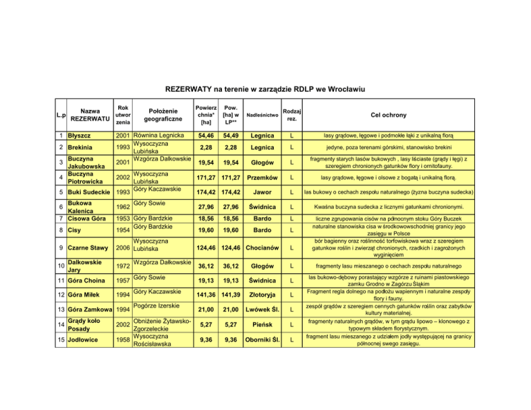 REZERWATY na terenie w zarządzie RDLP we Wrocławiu Rok L.p Nazwa utwor REZERWATU zenia 1 Błyszcz 2 Brekinia Buczyna Jakubowska Buczyna 4 Piotrowicka 3 2001 Równina Legnicka Wysoczyzna 1993 Lubińska Wzgórza Dalkowskie 2001 2002 5 Buki Sudeckie 1993 Bukowa Kalenica 7 Cisowa Góra Położenie geograficzne Wysoczyzna Lubińska Góry Kaczawskie Góry Sowie Powierz chnia* [ha] Pow. [ha] w LP** Nadleśnictwo Rodzaj rez. Cel ochrony 54,46 54,49 Legnica L lasy grądowe, łęgowe i podmokłe łąki z unikalną florą 2,28 2,28 Legnica L jedyne, poza terenami górskimi, stanowisko brekini 19,54 19,54 Głogów L fragmenty starych lasów bukowych , lasy liściaste (grądy i łęgi) z szeregiem chronionych gatunków flory i ornitofauny. 171,27 171,27 Przemków L lasy grądowe, łęgowe i olsowe z bogatą i unikalną florą. 174,42 174,42 Jawor L las bukowy o cechach zespołu naturalnego (żyzna buczyna sudecka) 27,96 27,96 Świdnica L Kwaśna buczyna sudecka z licznymi gatunkami chronionymi. 18,56 18,56 Bardo L 19,60 19,60 Bardo L liczne zgrupowania cisów na północnym stoku Góry Buczek naturalne stanowiska cisa w środkowowschodniej granicy jego zasięgu w Polsce bór bagienny oraz roślinność torfowiskowa wraz z szeregiem gatunkow roślin i zwierząt chronionych, rzadkich i zagrożonych wyginięciem 6 1962 8 Cisy 1953 Góry Bardzkie Góry Bardzkie 1954 9 Czarne Stawy Wysoczyzna 2006 Lubińska 124,46 124,46 Chocianów L 36,12 36,12 Głogów L 19,13 19,13 Świdnica L 141,36 141,39 Złotoryja L 10 Dalkowskie Jary 1972 11 Góra Choina 1957 12 Góra Miłek 1994 13 Góra Zamkowa 1994 14 Grądy koło Posady 15 Jodłowice Wzgórza Dałkowskie Góry Sowie Góry Kaczawskie Pogórze Izerskie Obniżenie ŻytawskoZgorzeleckie Wysoczyzna 1958 Rościsławska 2002 21,00 21,00 Lwówek Śl. L 5,27 5,27 Pieńsk L 9,36 9,36 Oborniki Śl. L fragmenty lasu mieszanego o cechach zespołu naturalnego las bukowo-dębowy porastający wzgórze z ruinami piastowskiego zamku Grodno w Zagórzu Śląkim Fragment regla dolnego na podłożu wapiennym i naturalne zespoły flory i fauny. zespół grądów z szeregiem cennych gatunków roślin oraz zabytków kultury materialnej. fragmenty naturalnych grądów, w tym grądu lipowo – klonowego z typowym składem florystycznym. fragment lasu mieszanego z udziałem jodły występującej na granicy północnej swego zasięgu. REZERWATY na terenie w zarządzie RDLP we Wrocławiu Rok L.p Nazwa utwor REZERWATU zenia 16 Kanigóra 17 18 19 20 21 22 Położenie geograficzne Pradolina 1958 Wrocławska Pow. [ha] w LP** Nadleśnictwo Rodzaj rez. Cel ochrony 5,40 5,40 Oława L fragment dobrze zachowanego wielogatunkowego lasu łęgowego o cechach zespołu naturalnego, charakterystyczny dla doliny Odry. L fragment naturalnego lasu bukowego. Las Bukowy w Wzgórza Trzebnickie 1980 23,70 23,70 Oborniki Śl. Skarszynie Pradolina Leśna Woda 1958 20,94 4,79 Oława Wrocławska Obniżenie 2001 Łęg Korea 79,29 79,29 Legnica Ścinawskie Łęgi Wysoczyzna 140,22 140,22 Przemków źródliskowe k. 2002 Lubińska Przemkowa Wzgórza Muszkowicki 1966 Niemczańsko16,43 16,43 Henryków Las Bukowy Strzelińskie Góry Kaczawskie Nad Groblą 2001 87,84 87,84 Jawor 23 Nowa Morawa Olszyny 24 Niezgodzkie 1971 Góry Złote Kotlina Żmigrodzka 1987 25 Ponikwa Wysoczyzna 2001 Lubińska Przełomy pod 26 Książem k. Wałbrzycha 27 Powierz chnia* [ha] L L L kompleks lasów łęgowych oraz grądów i olsów z dużą ilością źródlisk, wysięków i gęstą siecią strumieni, będący siedliskiem roślin chronionych oraz rzadkich gatunków ptaków. L fragment lasu bukowego o cechach zespołu naturalnego, grąd dębowo-grabowy oraz bogata flora runa leśnego. 22,16 22,16 Lądek L jedno z największych w Polsce skupień drzewiastych form brekinii na naturalnych stanowiskach z licznymi gatunkami roślin chronionych, położone na różnego typu skałach wulkanicznych. stanowisko cennej odmiany świerka rodzimego 74,28 74,28 Żmigród L naturalne lasy bagienne w zasięgu rzeki Ługi. 8,32 8.32 Legnica L naturalne lasy grądowe, łęgowe i olsowe z licznymi źródliskami i strumieniami będące miejscem występowania unikalnych gatunków roślin i zwierząt. 231,41 225,00 Wałbrzych L przełomowe odcinki rzeki Pełcznicy i strumyka Szczawnik wraz z całą różnorodnością flory i fauny. 124,68 124,69 Lądek L L Pogórze Wałbrzyskie 2000 Puszcza 1963 Śnieżnej Białki buczyna niżowa i grądy, pomniki przyrody oraz zespół okazałych przestoi bukowych, konwalia majowa,lilia złotogłów łęg jesionowo – wiązowy będący siedliskiem unikatowej awifauny oraz wielu gatunków roślin chronionych Góry Złote fragment pierwotnego lasu naturalnego o charakterze puszczańskim w piętrze reglowym. REZERWATY na terenie w zarządzie RDLP we Wrocławiu Rok L.p Nazwa utwor REZERWATU zenia 28 Radziądz 1954 Położenie geograficzne Kotlina Żmigrodzka Powierz chnia* [ha] Pow. [ha] w LP** Nadleśnictwo Rodzaj rez. 8,26 8,26 Żmigród L 65,17 65,51 Lubin L fragment lasów liściastych ze stanowiskami chronionych i rzadkich gatunków roślin. 6,28 6,28 Głogów L fragmenty lasu mieszanego o cechach zespołu naturalnego. 101,00 101,00 Jawor L zróżnicowane fitocenozy leśne z licznymi gatunkami chronionymi, wychodnie skalne, liczna populacja salamandry plamistej. 68,00 68,00 Jawor L zbiorowiska roślinne, lasy dębowe, olszyny, łąki trzęślicowe, fragmenty ziołorośli i turzycowisk oraz fitocenozy naskalne, szczelinowe i suchych zboczy a także interesujące formy geologiczne 34,72 34,72 Miękinia L las łęgowy o bogatym składzie gatunkowym. 59,82 59,82 Legnica L 8,96 8,65 Oława L 8,76 8,76 Złotoryja L-F Miękinia L-K Oława L-A Wzgórza Dałkowskie 29 Skarpa Storczyków 1993 30 Uroczysko Obiszów 1972 Wzgórza Dałkowskie Pogórze Kaczawskie 31 Wąwóz Lipa 1996 Pogórze Kaczawskie Wąwóz 32 Siedmicki 2001 33 Zabór 1959 34 Zimna Woda 1987 35 Zwierzyniec 1958 Buczyna Storczykowa 36 na Białych Skałach 2001 37 Góra 