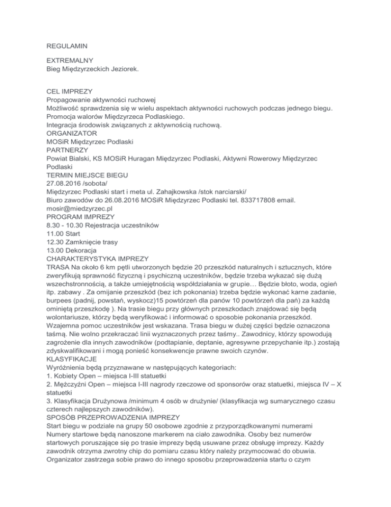 REGULAMIN EXTREMALNY Bieg Międzyrzeckich Jeziorek. CEL IMPREZY Propagowanie aktywności ruchowej Możliwość sprawdzenia się w wielu aspektach aktywności ruchowych podczas jednego biegu. Promocja walorów Międzyrzeca Podlaskiego. Integracja środowisk związanych z aktywnością ruchową. ORGANIZATOR MOSiR Międzyrzec Podlaski PARTNERZY Powiat Bialski, KS MOSiR Huragan Międzyrzec Podlaski, Aktywni Rowerowy Międzyrzec Podlaski TERMIN MIEJSCE BIEGU 27.08.2016 /sobota/ Międzyrzec Podlaski start i meta ul. Zahajkowska /stok narciarski/ Biuro zawodów do 26.08.2016 MOSiR Międzyrzec Podlaski tel. 833717808 email. [email protected] PROGRAM IMPREZY 8.30 - 10.30 Rejestracja uczestników 11.00 Start 12.30 Zamknięcie trasy 13.00 Dekoracja CHARAKTERYSTYKA IMPREZY TRASA Na około 6 km pętli utworzonych będzie 20 przeszkód naturalnych i sztucznych, które zweryfikują sprawność fizyczną i psychiczną uczestników, będzie trzeba wykazać się dużą wszechstronnością, a także umiejętnością współdziałania w grupie… Będzie błoto, woda, ogień itp. zabawy . Za omijanie przeszkód (bez ich pokonania) trzeba będzie wykonać karne zadanie, burpees (padnij, powstań, wyskocz)15 powtórzeń dla panów 10 powtórzeń dla pań) za każdą ominiętą przeszkodę ). Na trasie biegu przy głównych przeszkodach znajdować się będą wolontariusze, którzy będą weryfikować i informować o sposobie pokonania przeszkód. Wzajemna pomoc uczestników jest wskazana. Trasa biegu w dużej części będzie oznaczona taśmą. Nie wolno przekraczać linii wyznaczonych przez taśmy.. Zawodnicy, którzy spowodują zagrożenie dla innych zawodników (podtapianie, deptanie, agresywne przepychanie itp.) zostają zdyskwalifikowani i mogą ponieść konsekwencje prawne swoich czynów. KLASYFIKACJE Wyróżnienia będą przyznawane w następujących kategoriach: 1. Kobiety Open – miejsca I-III statuetki 2. Mężczyźni Open – miejsca I-III nagrody rzeczowe od sponsorów oraz statuetki, miejsca IV – X statuetki 3. Klasyfikacja Drużynowa /minimum 4 osób w drużynie/ (klasyfikacja wg sumarycznego czasu czterech najlepszych zawodników). SPOSÓB PRZEPROWADZENIA IMPREZY Start biegu w podziale na grupy 50 osobowe zgodnie z przyporządkowanymi numerami Numery startowe będą nanoszone markerem na ciało zawodnika. Osoby bez numerów startowych poruszające się po trasie imprezy będą usuwane przez obsługę imprezy. Każdy zawodnik otrzyma zwrotny chip do pomiaru czasu który należy przymocować do obuwia. Organizator zastrzega sobie prawo do innego sposobu przeprowadzenia startu o czym poinformuje uczestników na odprawie technicznej w dniu rozgrywania zawodów. Trasa podczas zawodów będzie zabezpieczona przez ratowników medycznych oraz obsługę techniczną. Limit czasu na pokonanie trasy dotyczy tylko ostatniej fali i wynosi 60 minut. Wycofanie zawodnika w trakcie wyścigu. Zawodnicy rezygnujący z udziału w zawodach w trakcie trwania zawodów, niezależnie od przyczyny wycofania się, zobowiązani są do niezwłocznego poinformowania o tym fakcie biuro zawodów celem uniknięcia rozpoczęcia akcji ratowniczej. UCZESTNICTWO - W zawodach mogą brać udział wszystkie osoby, które w dniu zawodów będą miały ukończone 18 lat; dopuszczamy również uczestników w wieku 16-18 lat. Z pisemną zgodą rodziców - Dokonają zgłoszenia poprzez formularz na stronie www.time2go.pl i uiszczą opłatę startową, podpiszą wymagane oświadczenia ZASADY ZAPISÓW 1. limit uczestników 100 osób 2. aby zapisać się na bieg, należy wypełnić elektroniczny formularz znajdujący się na stronie internetowej www.time2go.pl OPŁATA STARTOWA 1. wysokość wpisowego wynosi 60zł, którą należy uiścić do 21.08.2016 Po tym terminie można uiścić opłatę w dniu imprezy jednak opłata rośnie do 120zł. O wysokości wpisowego decyduje data dokonania wpłaty, a nie data wypełnienia formularza rejestracyjnego. 2. Wpisowe należy wpłacać na Nr konta: 06 2030 0045 1110 0000 0200 1010 BGŻ SA. Oddział w Międzyrzecu Podlaskim 3. Opłata startowa nie może być przeniesiona na innego zawodnika oraz nie można dokonać zamiany danych w zgłoszeniu po opłaceniu wpisowego. ŚWIADCZENIA. W ramach wpisowego uczestnicy otrzymują: 1. możliwość wzięcia udziału w biegu, 2. pakiet startowy /pamiątkowy medal bądź inny upominek poświadczający fakt ukończenia biegu, ciepły posiłek i coś do picia, możliwość skorzystania ze stoku narciarskiego, pola biwakowego BEZPIECZEŃSTWO Ze względu na wyjątkowy charakter zawodów, każdy z uczestników musi liczyć się z ewentualnymi zadrapaniami, otarciami i kontuzjami spowodowanymi pokonywaniem ustawionych na trasie przeszkód.. Jako organizatorzy dołożymy wszelkich starań, aby zostały zachowane wszelkie zasady bezpieczeństwa, niemniej jednak odpowiedzialność za powstałe urazy i konsekwencje pozostaje po stronie zawodników. Niezależnie od powyższego, Organizator zastrzega sobie prawo do ściągnięcia z trasy zawodników w stanie, który uzna za wymagający interwencji medycznej bądź innej opieki. Ze względu na bezpieczeństwo własne oraz innych uczestników, jak i w trosce o stan przeszkód na trasie ZAKAZANE jest startowanie w butach kolcach w butach z kolcami lub nakładkach na butach. W przypadku złamania powyższego zakazu Organizator wyciągnie konsekwencje prawne w stosunku do Uczestnika. DANE OSOBOWE Wszyscy uczestnicy startując w zawodach wyrażają zgodę na przetwarzanie danych osobowych do celów związanych z realizacją imprezy. POSTANOWIENIA KOŃCOWE Zawodnicy podczas wyścigu zobowiązani są do przestrzegania niniejszego regulaminu oraz odnoszenia się z należytym szacunkiem do innych uczestników zawodów, sędziów, organizatorów, służb porządkowych oraz medycznych. Zawody zostaną rozegrane bez względu na warunki atmosferyczne. Organizator zapewnia opiekę lekarską podczas trwania imprezy . Uczestnicy ubezpieczaj