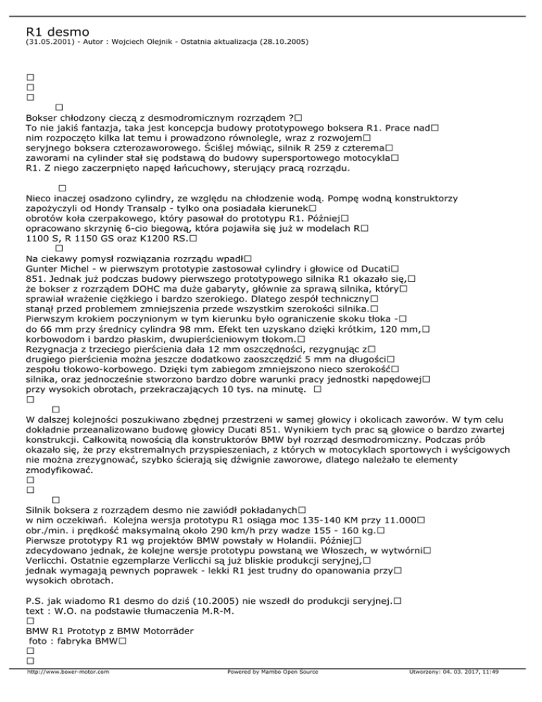 R1 desmo (31.05.2001) - Autor : Wojciech Olejnik - Ostatnia aktualizacja (28.10.2005) Bokser chłodzony cieczą z desmodromicznym rozrządem ? To nie jakiś fantazja, taka jest koncepcja budowy prototypowego boksera R1. Prace nad nim rozpoczęto kilka lat temu i prowadzono równolegle, wraz z rozwojem seryjnego boksera czterozaworowego. Ściślej mówiąc, silnik R 259 z czterema zaworami na cylinder stał się podstawą do budowy supersportowego motocykla R1. Z niego zaczerpnięto napęd łańcuchowy, sterujący pracą rozrządu. Nieco inaczej osadzono cylindry, ze względu na chłodzenie wodą. Pompę wodną konstruktorzy zapożyczyli od Hondy Transalp - tylko ona posiadała kierunek obrotów koła czerpakowego, który pasował do prototypu R1. Później opracowano skrzynię 6-cio biegową, która pojawiła się już w modelach R 1100 S, R 1150 GS oraz K1200 RS. Na ciekawy pomysł rozwiązania rozrządu wpadł Gunter Michel - w pierwszym prototypie zastosował cylindry i głowice od Ducati 851. Jednak już podczas budowy pierwszego prototypowego silnika R1 okazało się, że bokser z rozrządem DOHC ma duże gabaryty, głównie za sprawą silnika, który sprawiał wrażenie ciężkiego i bardzo szerokiego. Dlatego zespół techniczny stanął przed problemem zmniejszenia przede wszystkim szerokości silnika. Pierwszym krokiem poczynionym w tym kierunku było ograniczenie skoku tłoka - do 66 mm przy średnicy cylindra 98 mm. Efekt ten uzyskano dzięki krótkim, 120 mm, korbowodom i bardzo płaskim, dwupierścieniowym tłokom. Rezygnacja z trzeciego pierścienia dała 12 mm oszczędności, rezygnując z drugiego pierścienia można jeszcze dodatkowo zaoszczędzić 5 mm na długości zespołu tłokowo-korbowego. Dzięki tym zabiegom zmniejszono nieco szerokość silnika, oraz jednocześnie stworzono bardzo dobre warunki pracy jednostki napędowej przy wysokich obrotach, przekraczających 10 tys. na minutę. W dalszej kolejności poszukiwano zbędnej przestrzeni w samej głowicy i okolicach zaworów. W tym celu dokładnie przeanalizowano budowę głowicy Ducati 851. Wynikiem tych prac są głowice o bardzo zwartej konstrukcji. Całkowitą nowością dla konstruktorów BMW był rozrząd desmodromiczny. Podczas prób okazało się, że przy ekstremalnych przyspieszeniach, z których w motocyklach sportowych i wyścigowych nie można zrezygnować, szybko ścierają się dźwignie zaworowe, dlatego należało te elementy zmodyfikować. Silnik boksera z rozrządem desmo nie zawiódł pokładanych w nim oczekiwań. Kolejna wersja prototypu R1 osiąga moc 135-140 KM przy 11.000 obr./min. i prędkość maksymalną około 290 km/h przy wadze 155 - 160 kg. Pierwsze prototypy R1 wg projektów BMW powstały w Holandii. Później zdecydowano jednak, że kolejne wersje prototypu powstaną we Włoszech, w wytwórni Verlicchi. Ostatnie egzemplarze Verlicchi są już bliskie produkcji seryjnej, jednak wymagają pewnych poprawek - lekki R1 jest trudny do opanowania przy wysokich obrotach. P.S. jak wiadomo R1 desmo do dziś (10.2005) nie wszedł do produkcji seryjnej. text : W.O. na podstawie tłumaczenia M.R-M. BMW R1 Prototyp z BMW Motorräder foto : fabryka BMW http://www.boxer-motor.com Powered by Mambo Open Source Utworzony: 04. 03. 2017, 11:49 http://www.boxer-motor.com Powered by Mambo Open Source Utworzony: 04. 03. 2017, 11:49