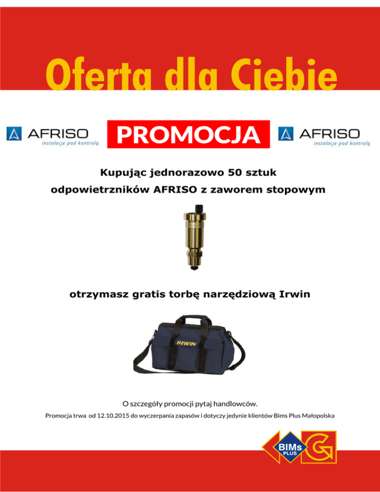 PROMOCJA Kupując jednorazowo 50 sztuk odpowietrzników AFRISO z zaworem stopowym otrzymasz gratis torbę narzędziową Irwin O szczegóły promocji pytaj handlowców. Promocja trwa od 12.10.2015 do wyczerpania zapasów i dotyczy jedynie klientów Bims Plus Małopolska