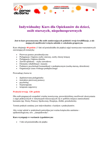 Indywidualny Kurs dla Opiekunów do dzieci, osób starszych, niepełnosprawnych Jest to kurs przeznaczony dla osób zamierzających podnieść swoje kwalifikacje, a nie mających możliwości wzięcia udziału w szkoleniu grupowym. Kurs obejmuje 40 godzin ( 5 dni od poniedziałku do piątku) zajęć teoretyczno-warsztatowych zawierających tematykę: Pierwsza pomoc przedmedyczna Pielęgnacja i higiena osoby starszej, osoby chorej leżącej Pielęgnacja i higiena dziecka Zawód opiekuna – etyka zawodowa Elementy rehabilitacji i masażu Podstawy psychologii komunikacji z podopiecznym (osobą starszą, dzieckiem) Organizacja czasu wolnego podopiecznego Prowadzący kursu to: dyplomowana pielęgniarka instruktor pierwszej pomocy psycholog fizjoterapeuta terapeuta zajęciowy Praktyki trwają 120- godzin Dla osób pragnących uzupełnić wiedzę teoretyczną, przewidzieliśmy możliwość skorzystania z zajęć praktycznych w instytucjach mieszczących się w pobliżu miejsca zamieszkania kursanta (np. Domy Pomocy Społecznej, Hospicja, żłobki, przedszkola). Termin praktyk ustalany jest indywidualnie z każdym z praktykantów. Aby wziąć udział w praktykach potrzebna jest ważna książeczka sanitarno – epidemiologiczna, tzw. „sanepidowska”. Kurs występuje w wariancie tygodniowym: 5 dni od poniedziałku do piątku Kurs zawiera: materiały szkoleniowe starannie przygotowaną wiedzę merytoryczną przerwy na kawę, herbatę, mały poczęstunek moduły szkoleniowe, m.in.: o pierwsza pomoc – o wartości 500zł, o pielęgnacja i higiena podopiecznego – o wartości 500zł o etyka zawodowa, podstawy komunikacji i współpracy z podopiecznym oraz jego rodziną – o wartości 500zł o organizacja czasu wolnego podopiecznym/rozwój dziecka poprzez zabawę „Zabawy w nauce i wychowaniu” – wartość 600 zł o elementy rehabilitacji, zawód opiekuna – moduł o wartości 600 zł o zajęcia praktyczne w instytucjach (DPS, przedszkole lub żłobek) – moduł o wartości 900 zł moduły o łącznej wartości 3600 zł, jednak w pakiecie, cena jest niższa – zobacz poniżej jaką cenę ustaliłam dla tego specjalnego pakietu dla opiekunów dodatkowo otrzymasz zaświadczenia w języku angielskim, zaoszczędzisz 200zł na tłumaczeniu przysięgłym zaświadczenie o ukończeniu kursu honorowane w Polsce jak i za granicą. zaświadczenie o ukończeniu szkolenia z pierwszej pomocy ważne przez 2 lata (według wytycznych UE), honorowane na całym świecie Zaświadczenia mogą być też wydane w języku niemieckim – dopłata 70 zł, w włoskim oraz czeskim – dopłata 200 zł za jeden język (jeśli chciałabyś zaświadczenia w innym języku zadzwoń, uzgodnimy szczegóły). Terminy kursu są ustalane indywidualnie. Zapraszam Cię serdecznie do udziału w kursie Kurs odbywa się w godzinach od 9.00 do 17.00 Cena kursu to: 2000 zł (wersja podstawowa) 2500 zł (wersja podstawowa + praktyki) Zapisy oraz więcej informacji na temat kursu, uzyskasz pod numerem tel. kom. 783 340 941 Miejsca rezerwujemy tylko po wcześniejszym zapisaniu się i wpłacie zaliczki. Informacje o nr konta przesyłamy na maila po zgłoszeniu! Zajęcia teoretyczne odbywają się w siedzibie firmy Agencja Pomoc Dla Domu przy ul. Przyjemnej 11 w Bielsku-Białej Dane do przekazu pocztowego: Agencja „Pomoc dla domu” Wanda Urbańczyk ul. Przyjemna 11 43-300 Bielsko-Biała W pierwszym dniu kursu weź ze sobą potwierdzenie wpłaty.
