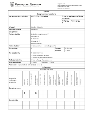 Załącznik nr 5 do Uchwały Senatu Uniwersytetu Medycznego we Wrocławiu nr 1630 z dnia 30 marca 2016 r. Sylabus Nazwa modułu/przedmiotu Opis przedmiotu kształcenia FIZJOLOGIA CZŁOWIEKA Wydział Kierunek studiów Specjalności Poziom studiów Nauk o Zdrowiu Dietetyka Forma studiów Rok studiów stacjonarne I Typ przedmiotu X obowiązkowy ograniczonego wyboru wolny wybór/ fakultatywny kierunkowy X podstawowy polski angielski inny Grupa szczegółowych efektów kształcenia Kod grupy Nazwa grupy A jednolite magisterskie * I stopnia X II stopnia III stopnia podyplomowe Rodzaj przedmiotu Język wykładowy niestacjonarne Semestr studiów: X zimowy letni * zaznaczyć odpowiednio, zamieniając na X Semestr letni 20 30 Semestr zimowy: E-learning (EL) Samokształcenie (Czas pracy własnej studenta) Praktyki zawodowe (PZ) Zajęcia wychowania fizycznego-obowiązkowe (WF) Lektoraty (LE) Ćwiczenia specjalistyczne magisterskie (CM) Zajęcia praktyczne przy pacjencie (PP) Ćwiczenia w warunkach symulowanych (CS) Ćwiczenia laboratoryjne (CL) Ćwiczenia kliniczne (CK) Ćwiczenia kierunkowe niekliniczne (CN) Ćwiczenia audytoryjne (CA) Seminaria (SE) Jednostka realizująca przedmiot Wykłady (WY) Liczba godzin Forma kształcenia Załącznik nr 5 do Uchwały Senatu Uniwersytetu Medycznego we Wrocławiu nr 1630 z dnia 30 marca 2016 r. Razem w roku: 50 Cele kształcenia : Celem przedmiotu jest: C1. poznanie przez studentów mechanizmów regulacji funkcji organizmu człowieka C2. opanowanie umiejętności posługiwania się pojęciami fizjologicznymi C3. nabycie umiejętności wnioskowania, interpretacji wiedzy fizjologicznej oraz jej wykorzystania Macierz efektów kształcenia dla modułu/przedmiotu w odniesieniu do metod weryfikacji zamierzonych efektów kształcenia oraz formy realizacji zajęć: Numer efektu kształcenia przedmiotowego W 01 Numer efektu kształcenia kierunkowego A.W 14 A.W 6 W 02 A.W 6 W 03 A.W 3 Student, który zaliczy moduł/przedmiot wie/umie/potrafi Metody weryfikacji osiągnięcia zamierzonych efektów kształcenia (formujące i podsumowujące) Forma zajęć dydaktycznych ** wpisz symbol Wykazuje znajomość pojęcia i znaczenia homeostazy oraz funkcjonowania somatycznego układu nerwowego i narządów zmysłów (zna: klasyfikację receptorów i sposoby ich pobudzania, klasyfikację łuków odruchowych, przebieg wybranych odruchów własnych rdzenia kręgowego, fizjologiczny podział kory mózgowej i jej udział w wytwarzaniu odruchów warunkowych) Zna funkcje i różnice w budowie obu części autonomicznego układu nerwowego (AUN), potrafi określić znaczenie antagonistycznego i synergistycznego działania części współczulnej i przywspółczulnej AUN. WY, CN Zna budowę i klasyfikację hormonów. Potrafi przedstawić typy regulacji wydzielania hormonów (regulacja nerwowa, metaboliczna i hormonalna). WY, CN WY Załącznik nr 5 do Uchwały Senatu Uniwersytetu Medycznego we Wrocławiu nr 1630 z dnia 30 marca 2016 r. W 04 A.W 3 W 05 A.W 6 A.W 1 A.W 18 W 06 A.W 6 A.W 1 A.W 18 W 07 A.W 5 W 08 A.W 12 W 09 A.W 28 Zna mechanizmy regulacji temperatury ciała. Potrafi opisać znaczenie dla prawidłowej funkcji organizmu układu oddechowego- procesy zachodzące w układzie oddechowym i mechanizmy ich regulacji (znaczenie przestrzeni nieużytecznej, czynniki wpływające na dyfuzję gazów w płucach, obwodową i ośrodkową regulację oddychania) Potrafi opisać funkcje trawienne poszczególnych części układu pokarmowego (skład i znaczenie śliny, soku żołądkowego, soku trzustkowego i jelitowego). Zna mechanizmy regulacji nerwowej i hormonalnej wydzielania poszczególnych soków trawiennych i motoryki przewodu pokarmowego. Potrafi obliczyć podstawową i całkowitą przemianę materii, zapotrzebowanie kaloryczne dla poszczególnych stanów fizjologicznych oraz ułożyć stosowny jadłospis. Zna funkcje witamin w procesach metabolicznych. Zna mechanizmy odpowiedzialne za utrzymanie równowagi wodnej organizmu (udział hormonów, nerek). Potrafi opisać mechanizmy związane z produkcją moczu. Zna udział nerek w utrzymaniu równowagi kwasowo- zasadowej oraz ich funkcję dokrewną. Potrafi wskazać właściwości swoiste dla mięśnia sercowego. Zna zmiany zachodzące w sercu w WY WY, CN WY, CN WY, CN WY WY Załącznik nr 5 do Uchwały Senatu Uniwersytetu Medycznego we Wrocławiu nr 1630 z dnia 30 marca 2016 r. trakcie jego pracy oraz udział serca i naczyń układu krwionośnego w odruchowej regulacji ciśnienia tętniczego krwi. Opisuje powiązania pomiędzy poszczególnymi układami regulacyjnymi (nerwowym i hormonalnym) w utrzymywaniu poszczególnych parametrów w organizmie: ciśnienia osmotycznego i tętniczego, stanu nawodnienia, stężenia poszczególnych substancji i gazów w osoczu, pH płynów ustrojowych, poziomu hormonów. U 01 A.U 5 U 02 A.U 5 U 03 A.U 5 Rozpoznaje nieprawidłowości w funkcjonowaniu somatycznego i autonomicznego układu nerwowego. U 04 A.U 3 Potrafi określić prawidłową masę pacjenta i wskazać jej ewentualne odchylenia. Potrafi ułożyć dla zdrowego człowieka podstawową dietę uwzględniającą zapotrzebowanie kaloryczne. Potrafi rozpoznać objawy awitaminozy. U 05 A.U 5 Wskazuje ewentualne przyczyny zaburzeń w wielkości tych parametrów i wynikające z tych zaburzeń zmiany funkcjonowania organizmu. Rozwiązuje problemy fizjologiczne w oparciu o fachową literaturę Dyskusja pozwalająca na sprawdzenie zdolności interpretacji procesów fizjologicznych w zmieniających się warunkach otoczenia WY, CN WY, CN WY WY, CN WY Załącznik nr 5 do Uchwały Senatu Uniwersytetu Medycznego we Wrocławiu nr 1630 z dnia 30 marca 2016 r. K 01 D.K1 D.K8 K 02 D.K2 K 03 D.K1 Zdaje sobie sprawę z konieczności konsultowania się z innymi specjalistami. Rozumie potrzebę pogłębiania wiedzy korzystając ze specjalistycznych konferencji oraz fachowego piśmiennictwa. Potrafi nawiązać kontakt z pacjentem. WY, CN WY, CN WY, CN ** WY - wykład; SE - se