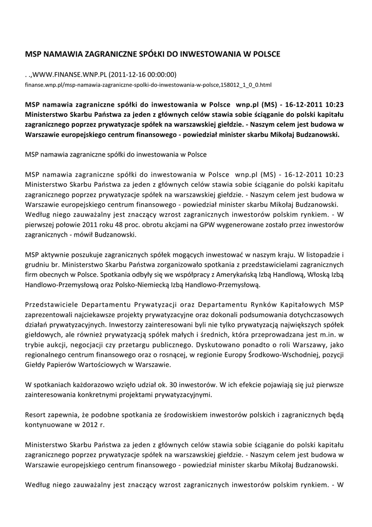 MSP NAMAWIA ZAGRANICZNE SPÓŁKI DO INWESTOWANIA W POLSCE . .,WWW.FINANSE.WNP.PL (2011-12-16 00:00:00) finanse.wnp.pl/msp-namawia-zagraniczne-spolki-do-inwestowania-w-polsce,158012_1_0_0.html MSP namawia zagraniczne spółki do inwestowania w Polsce wnp.pl (MS) - 16-12-2011 10:23 Ministerstwo Skarbu Państwa za jeden z głównych celów stawia sobie ściąganie do polski kapitału zagranicznego poprzez prywatyzacje spółek na warszawskiej giełdzie. - Naszym celem jest budowa w Warszawie europejskiego centrum finansowego - powiedział minister skarbu Mikołaj Budzanowski. MSP namawia zagraniczne spółki do inwestowania w Polsce MSP namawia zagraniczne spółki do inwestowania w Polsce wnp.pl (MS) - 16-12-2011 10:23 Ministerstwo Skarbu Państwa za jeden z głównych celów stawia sobie ściąganie do polski kapitału zagranicznego poprzez prywatyzacje spółek na warszawskiej giełdzie. - Naszym celem jest budowa w Warszawie europejskiego centrum finansowego - powiedział minister skarbu Mikołaj Budzanowski. Według niego zauważalny jest znaczący wzrost zagranicznych inwestorów polskim rynkiem. - W pierwszej połowie 2011 roku 48 proc. obrotu akcjami na GPW wygenerowane zostało przez inwestorów zagranicznych - mówił Budzanowski. MSP aktywnie poszukuje zagranicznych spółek mogących inwestować w naszym kraju. W listopadzie i grudniu br. Ministerstwo Skarbu Państwa zorganizowało spotkania z przedstawicielami zagranicznych firm obecnych w Polsce. Spotkania odbyły się we współpracy z Amerykańską Izbą Handlową, Włoską Izbą Handlowo-Przemysłową oraz Polsko-Niemiecką Izbą Handlowo-Przemysłową. Przedstawiciele Departamentu Prywatyzacji oraz Departamentu Rynków Kapitałowych MSP zaprezentowali najciekawsze projekty prywatyzacyjne oraz dokonali podsumowania dotychczasowych działań prywatyzacyjnych. Inwestorzy zainteresowani byli nie tylko prywatyzacją największych spółek giełdowych, ale również prywatyzacją spółek małych i średnich, która przeprowadzana jest m.in. w trybie aukcji, negocjacji czy przetargu publicznego. Dyskutowano ponadto o roli Warszawy, jako regionalnego centrum finansowego oraz o rosnącej, w regionie Europy Środkowo-Wschodniej, pozycji Giełdy Papierów Wartościowych w Warszawie. W spotkaniach każdorazowo wzięło udział ok. 30 inwestorów. W ich efekcie pojawiają się już pierwsze zainteresowania konkretnymi projektami prywatyzacyjnymi. Resort zapewnia, że podobne spotkania ze środowiskiem inwestorów polskich i zagranicznych będą kontynuowane w 2012 r. Ministerstwo Skarbu Państwa za jeden z głównych celów stawia sobie ściąganie do polski kapitału zagranicznego poprzez prywatyzacje spółek na warszawskiej giełdzie. - Naszym celem jest budowa w Warszawie europejskiego centrum finansowego - powiedział minister skarbu Mikołaj Budzanowski. Według niego zauważalny jest znaczący wzrost zagranicznych inwestorów polskim rynkiem. - W pierwszej połowie 2011 roku 48 proc. obrotu akcjami na GPW wygenerowane zostało przez inwestorów zagranicznych - mówił Budzanowski. MSP aktywnie poszukuje zagranicznych spółek mogących inwestować w naszym kraju. W listopadzie i grudniu br. Ministerstwo Skarbu Państwa zorganizowało spotkania z przedstawicielami zagranicznych firm obecnych w Polsce. Spotkania odbyły się we współpracy z Amerykańską Izbą Handlową, Włoską Izbą Handlowo-Przemysłową oraz Polsko-Niemiecką Izbą Handlowo-Przemysłową. Przedstawiciele Departamentu Prywatyzacji oraz Departamentu Rynków Kapitałowych MSP zaprezentowali najciekawsze projekty prywatyzacyjne oraz dokonali podsumowania dotychczasowych działań prywatyzacyjnych. Inwestorzy zainteresowani byli nie tylko prywatyzacją największych spółek giełdowych, ale również prywatyzacją spółek małych i średnich, która przeprowadzana jest m.in. w trybie aukcji, negocjacji czy przetargu publicznego. Dyskutowano ponadto o roli Warszawy, jako regionalnego centrum finansowego oraz o rosnącej, w regionie Europy Środkowo-Wschodniej, pozycji Giełdy Papierów Wartościowych w Warszawie. W spotkaniach każdorazowo wzięło udział ok. 30 inwestorów. W ich efekcie pojawiają się już pierwsze zainteresowania konkretnymi projektami prywatyzacyjnymi. Resort zapewnia, że podobne spotkania ze środowiskiem inwestorów polskich i zagranicznych będą kontynuowane w 2012 r.