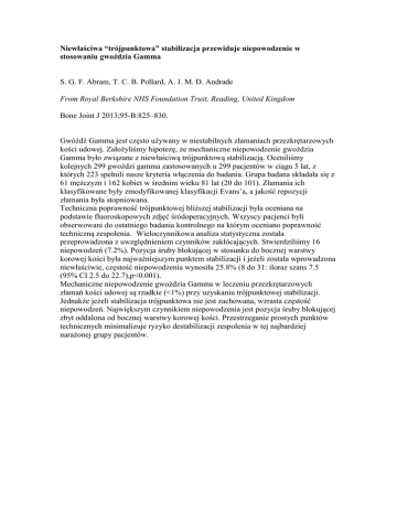 Niewłaściwa “trójpunktowa” stabilizacja przewiduje niepowodzenie w stosowaniu gwoździa Gamma S. G. F. Abram, T. C. B. Pollard, A. J. M. D. Andrade From Royal Berkshire NHS Foundation Trust, Reading, United Kingdom Bone Joint J 2013;95-B:825–830. Gwóźdź Gamma jest często używany w niestabilnych złamaniach przezkrętarzowych kości udowej. Założyliśmy hipotezę, ze mechaniczne niepowodzenie gwoździa Gamma było związane z niewłaściwą trójpunktową stabilizacją. Oceniliśmy kolejnych 299 gwoździ gamma zastosowanych u 299 pacjentów w ciągu 5 lat, z których 223 spełnili nasze kryteria włączenia do badania. Grupa badana składała się z 61 mężczyzn i 162 kobiet w średnim wieku 81 lat (20 do 101). Złamania ich klasyfikowane były zmodyfikowanej klasyfikacji Evans’a, a jakość repozycji złamania była stopniowana. Techniczna poprawność trójpunktowej bliższej stabilizacji była oceniana na podstawie fluoroskopowych zdjęć śródoperacyjnych. Wszyscy pacjenci byli obserwowani do ostatniego badania kontrolnego na którym oceniano poprawność techniczną zespolenia. Wieloczynnikowa analiza statystyczna została przeprowadzona z uwzględnieniem czynników zakłócających. Stwierdziliśmy 16 niepowodzeń (7.2%). Pozycja śruby blokującej w stosunku do bocznej warstwy korowej kości była najważniejszym punktem stabilizacji i jeżeli została wprowadzona niewłaściwie, częstość niepowodzenia wynosiła 25.8% (8 do 31: iloraz szans 7.5 (95% CI 2.5 do 22.7),p<0.001). Mechaniczne niepowodzenie gwoździa Gamma w leczeniu przezkrętarzowych złamań kości udowej są rzadkie (<1%) przy uzyskaniu trójpunktowej stabilizacji. Jednakże jeżeli stabilizacja trójpunktowa nie jest zachowana, wzrasta częstość niepowodzeń. Największym czynnikiem niepowodzenia jest pozycja śruby blokującej zbyt oddalona od bocznej warstwy korowej kości. Przestrzeganie prostych punktów technicznych minimalizuje ryzyko destabilizacji zespolenia w tej najbardziej narażonej grupy pacjentów.