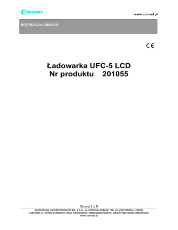 www.conrad.pl INSTRUKCJA OBSŁUGI Ładowarka UFC-5 LCD Nr produktu 201055 Strona 1 z 5 Dystrybucja Conrad Electronic Sp. z o.o., ul. Królowej Jadwigi 146, 30-212 Kraków, Polska Copyright © Conrad Electronic 2012, Kopiowanie, rozpowszechnianie, zmiany bez zgody zabronione. www.conrad.pl www.conrad.pl Wstęp Szanowni klienci, Kupując produkt Voltcraft® podjęliście Państwo bardzo dobrą decyzję, za którą chcielibyśmy Państwu podziękować. Nabyliście Państwo produkt ponadprzeciętnej jakości należący do rodziny marki znanej na polu technologii pomiarowych, ładowania i sieciowych dzięki szczególnym kompetencjom oraz ciągłym innowacjom. Dzięki produktom firmy Voltcraft®, będziecie Państwo mogli z łatwością sprostać trudnym zadaniom jako ambitni hobbiści w stopniu równie dobrym co profesjonalny użytkownik. Voltcraft® oferuje niezawodną technologię przy niezwykle przyjaznej cenie. Jesteśmy przekonani, że nawiżanie znajomości z produktami Voltcraft stanie się początkiem długiej i owocnej współpracy. Życzymy Państwu satysfakcji z korzystania z nowego produktu firmy Voltcraft®! Ładowarka UFC-5 LCD została zaprojektowana przy zastosowaniu najlepszych technologii. Produkt spełnia wymagania aktualnych wskazówek europejskich i danego kraju. Zgodność została potwierdzona a odpowiednie dokumenty i oświadczenia znajdują się u producenta. Zwracamy się z uprzejmą prośbą do użytkownika o przestrzeganie instrukcji obsługi w celu zapewnienia jakości produktu i bezpieczeństwa jego użytkowania. Strona 2 z 5 Dystrybucja Conrad Electronic Sp. z o.o., ul. Królowej Jadwigi 146, 30-212 Kraków, Polska Copyright © Conrad Electronic 2012, Kopiowanie, rozpowszechnianie, zmiany bez zgody zabronione. www.conrad.pl www.conrad.pl Działanie Zasilanie Wybierz wymagane zasilanie. Jako zasilanie posłużyć może zasilacz sieciowy dla gniazd 100 do 240 VAC lub kabel przejściówka dla gniazda zapalniczki 12V w pojazdach kempingowych, samochodach itp. Wtyczka zasilacza sieciowego: aby obsługiwać UFC-5 LCD za pomocą zasilacza sieciowego, podłącz wtyczkę zasilacza sieciowego do gniazda (100 do 240V 50/60Hz) . Przewód z przejściówką 12V: podłącz kabel z przejściówką 12V do wejścia zapalniczki. Jeśli UFC-5 LCD nie pracuje z wyjściem zapalniczki 12V sprawdź wtyk zapalniczki lub bezpiecznik wtyczki połączeniowej (automatyczny bezpiecznik 2A). Teraz podłącz wklęsłą wtyczkę zasilacza lub kabla z przejściówką 12V do wejścia DC typu „jack” u góry z przodu ładowarki. Ładowanie akumulatorków Umieść akumulatorki, które chcesz naładować w ładowarce. Przestrzegaj prawidłowej biegunowości. Biegun ujemny akumulatorka musi być skierowany w stronę emitujących światło diod ładowarki. • Dzięki monitorowaniu poszczególnych kieszeni ładowania, można ładować jednocześnie od 1 do 4 akumulatorków rozmiarów Mignon lub Micro. Można także ładować mieszane akumulatorki NiMh i NiCd o różnych pojemnościach i stanach naładowania, ponieważ każda kieszeń ładowania traktowana jest i ładowana indywidualnie dzięki monitorowaniu poszczególnych kieszeni. Tym samym jest niemal niemożliwe, aby zniszczyć akumulatorki lub ładowarkę. • UFC-5 LCD wykonuje teraz automatyczny test akumulatorka. Jeśli akumulatorek nie może być więcej naładowany w UFC-5 LCD lub, jeśli włożyłeś przypadkowo zwykłą baterię, dioda statusu zacznie migać na czerwono u góry odpowiedniej kieszeni a na ekranie wyświetli się komunikat „BAD". Wyjmij wadliwy akumulatorek z UFC-5 LCD i usuń do odpadów zgodnie z obowiązującymi przepisami. • Jeśli akumulatorek jest prawidłowy, ładowarka automatycznie przełącza się w tryb szybkiego ładowania. Sygnalizowane jest to indywidualnie dla każdej kieszeni ładowania migającą na czerwono diodą statusu oraz wzrostem ilości pasków na wyświetlaczu paskowym. Po każdym pełnym cyklu wyświetlacza paskowego zatrzymuje się on na chwilę sygnalizując aktualny status naładowania akumulatorka. Podczas procesu ładowania na ekranie LCD wyświetli się „CHARGING". • Po całkowitym naładowaniu akumulatorka, ładowarka automatycznie przełącza odpowiednią kieszeń ładowania w tryb podładowania małym prądem. Sygnalizowane jest to migającą na zielono diodą statusu. Po całkowitym naładowaniu wszystkich akumulatorków, na ekranie wyświetli się „FULL". Po procesie podładowania małym prądem nie ma potrzeby wyjmowania akumulatorków z ładowarki. Akumulatorki są zabezpieczone przed przeładowaniem dzięki funkcji odcięcia Minus Delta U, zegarowi bezpieczeństwa oraz funkcji podładowania małym prądem. Wbudowany czujnik temperatury zapobiega przegrzaniu baterii. Funkcja odświeżania/rozładowania Funkcja ta przywraca „akumulację” akumulatorków za pomocą rozładowania. Zaleca się wykonywanie tej procedury, jeśli akumulatorki przestały działać prawidłowo. W szczególności Strona 3 z 5 Dystrybucja Conrad Electronic Sp. z o.o., ul. Królowej Jadwigi 146, 30-212 Kraków, Polska Copyright © Conrad Electronic 2012, Kopiowanie, rozpowszechnianie, zmiany bez zgody zabronione. www.conrad.pl www.conrad.pl zaleca się ją dla akumulatorków NiCd,aby zapobiec efektowi „zapamiętywania”. Aby uruchomić funkcję rozładowania, postępuj następująco: • Po wożeniu akumulatorków do ładowarki (patrz Ładowanie akumulatorków) przyciśnij przycisk „DISCHARGING". Funkcję rozładowania można uruchomić do jednej minuty po włożeniu akumulatorków do ładowarki. • Rozpoczyna się proces odświeżania/rozładowania. Sygnalizowane jest to migającą na zielono dioda statusu oraz biegnącymi w dół paskami wyświetlacza paskowego. Po każdym pełnym cyklu wyświetlacza paskowego zatrzymuje się on na chwilę sygnalizując aktualny status rozładowania akumulatorka. Podczas procesu rozładowania na ekranie LCD wyświetli się „DISCHARGING". • Po całkowity