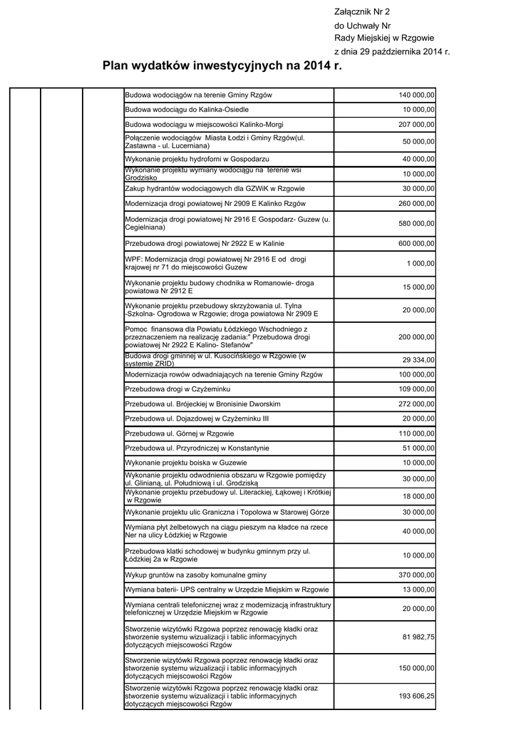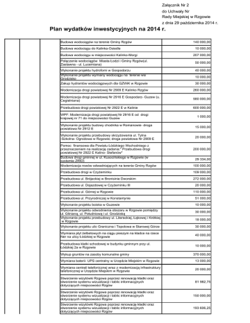 Załącznik Nr 2 do Uchwały Nr Rady Miejskiej w Rzgowie z dnia 29 października 2014 r. Plan wydatków inwestycyjnych na 2014 r. Budowa wodociągów na terenie Gminy Rzgów Budowa wodociągu do Kalinka-Osiedle Budowa wodociągu w miejscowości Kalinko-Morgi 140 000,00 10 000,00 207 000,00 Połączenie wodociągów Miasta Łodzi i Gminy Rzgów(ul. Zastawna - ul. Lucerniana) 50 000,00 Wykonanie projektu hydroforni w Gospodarzu 40 000,00 Wykonanie projektu wymiany wodociągu na terenie wsi Grodzisko 10 000,00 Zakup hydrantów wodociągowych dla GZWiK w Rzgowie 30 000,00 Modernizacja drogi powiatowej Nr 2909 E Kalinko Rzgów 260 000,00 Modernizacja drogi powiatowej Nr 2916 E Gospodarz- Guzew (u. Cegielniana) 580 000,00 Przebudowa drogi powiatowej Nr 2922 E w Kalinie 600 000,00 WPF: Modernizacja drogi powiatowej Nr 2916 E od drogi krajowej nr 71 do miejscowości Guzew 1 000,00 Wykonanie projektu budowy chodnika w Romanowie- droga powiatowa Nr 2912 E 15 000,00 Wykonanie projektu przebudowy skrzyżowania ul. Tylna -Szkolna- Ogrodowa w Rzgowie; droga powiatowa Nr 2909 E 20 000,00 Pomoc finansowa dla Powiatu Łódzkiego Wschodniego z przeznaczeniem na realizację zadania:" Przebudowa drogi powiatowej Nr 2922 E Kalino- Stefanów" 200 000,00 Budowa drogi gminnej w ul. Kusocińskiego w Rzgowie (w systemie ZRID) 29 334,00 Modernizacja rowów odwadniających na terenie Gminy Rzgów 100 000,00 Przebudowa drogi w Czyżeminku 109 000,00 Przebudowa ul. Brójeckiej w Bronisinie Dworskim 272 000,00 Przebudowa ul. Dojazdowej w Czyżeminku III Przebudowa ul. Górnej w Rzgowie 20 000,00 110 000,00 Przebudowa ul. Przyrodniczej w Konstantynie 51 000,00 Wykonanie projektu boiska w Guzewie 10 000,00 Wykonanie projektu odwodnienia obszaru w Rzgowie pomiędzy ul. Glinianą, ul. Południową i ul. Grodziską Wykonanie projektu przebudowy ul. Literackiej, Łąkowej i Krótkiej w Rzgowie 30 000,00 18 000,00 Wykonanie projektu ulic Graniczna i Topolowa w Starowej Górze 30 000,00 Wymiana płyt żelbetowych na ciągu pieszym na kładce na rzece Ner na ulicy Łódzkiej w Rzgowie 40 000,00 Przebudowa klatki schodowej w budynku gminnym przy ul. Łódzkiej 2a w Rzgowie 10 000,00 Wykup gruntów na zasoby komunalne gminy 370 000,00 Wymiana baterii- UPS centralny w Urzędzie Miejskim w Rzgowie 13 000,00 Wymiana centrali telefonicznej wraz z modernizacją infrastruktury telefonicznej w Urzędzie Miejskim w Rzgowie 20 000,00 Stworzenie wizytówki Rzgowa poprzez renowację kładki oraz stworzenie systemu wizualizacji i tablic informacyjnych dotyczących miejscowości Rzgów 81 982,75 Stworzenie wizytówki Rzgowa poprzez renowację kładki oraz stworzenie systemu wizualizacji i tablic informacyjnych dotyczących miejscowości Rzgów 150 000,00 Stworzenie wizytówki Rzgowa poprzez renowację kładki oraz stworzenie systemu wizualizacji i tablic informacyjnych dotyczących miejscowości Rzgów 193 606,25 Pomoc finansowa dla Powiatu Łódzkiego Wschodniego na dofinansowanie zakupu samochodu lekkiego ratownictwa ekologicznego dla PSP Koluszki 10 000,00 F.S.:Wyposażenie i modernizacja strażnicy OSP w Starej Gadce 31 401,84 Modernizacja budynku strażnicy OSP Grodzisko 40 000,00 modernizacja budynku strażnicy OSP Prawda 50 000,00 Modernizacja budynku strażnicy OSP Romanów 26 000,98 Modernizacja pomieszczeń kuchni w budynku OSP Rzgów 60 000,00 Zakup samochodu ratowniczego dla OSP w Starowej Górze 69 000,00 Budowa placu zabaw przy Szkole Podstawowej im. J. Długosza w Rzgowie 16 754,80 Przebudowa Szkoły Podstawowej im. J. Długosza w Rzgowie 42 025,00 Wykonanie przyobiektowej oczyszczalni ścieków dla Szkoły Podstawowej im. K. Makuszyńskiego w Guzewie wraz z projektem 21 000,00 Wzmocnienie drewnianej konstrukcji dachu w Szkole Podstawowej w Guzewie 15 000,00 Budowa placu zabaw przy Szkole Podstawowej im. J. Długosza w Rzgowie Budowa placu zabaw przy Szkole Podstawowej im. J. Długosza w Rzgowie Zakup nagłośnienia dla Szkoły Podstawowej w Guzewie 58 276,00 14 570,20 5 000,00 Modernizacja budynku Przedszkola Publicznego w Rzgowie 0,00 Termomodernizacja Przedszkola w Rzgowie 0,00 WPF:Rozbudowa przedszkola w Rzgowie- adaptacja hydroforni 209 000,00 WPF:Termomodernizacja budynku przedszkola w Rzgowie 36 975,00 Wykonanie projektu adaptacji budynku starej hydroforni dla potrzeb Przedszkola w Rzgowie 30 000,00 Adaptacja pomieszczeń na potrzeby Gminnej Przychodni Zdrowia w Rzgowie Budowa podjazdów dla osób niepełnosprawnych przy budynku terapii Gminnej Przychodni Zdrowia w Rzgowie Budowa kanalizacji sanitarnej wraz z przyłączami w ul. Ks. Załuski w Rzgowie Przyłączenie dodatkowych studzienek kanalizacyjnych do kanalizacji podciśnieniowej w Starowej Górze i Starej Gadce W.P.F.Wykonanie projektu kanalizacji dla Starowej Góry, Starej Gadki, Gospodarza i Rzgowa W.P.F.Wykonanie projektu rozbudowy oczyszczalni ścieków dla Gminy Rzgów Wykonanie projektu kanalizacji dla ul. Hetmańskiej i ul. Stropowej w Starowej Górze Zakup zatapialnej pompy wraz ze sterowanikami dla GZWiK w Rzgowie Wniesienie wkładów do Miejskiego Przedsiębiorstwa Gospodarki Komunalnej Społki z ograniczoną odpowiedzialnością w Rzgowie Budowa instalacji oświetleniowej na terenie Gminy Rzgów Doposażenie placu zabaw dla dzieci w Guzewie Doposażenie placu zabaw w Grodzisku Doposażenie placu zabaw w Guzewie 20 000,00 39 745,46 100 000,00 40 000,00 261 375,00 147 416,00 23 625,00 24 000,00 100 000,00 132 000,00 3 848,00 16 000,00 0,00 F.S.:Budowa placu zabaw w Kalinku 22 004,45 Doposażenie placu zabaw dla dzieci w Guzewie 13 384,00 Doposażenie placu zabaw dla dzieci w Guzewie 3 346,00 Zakup Zintegrowanego Systemu Informatycznego dla GZWiK w Rzgowie 28 290,00 Wykonanie projektu Domu Kultury w Rzgowie 98 000,00 F.S.:Modernizacja budynku świetlicy w Starowej Górze 33 089,40 F.S.:Modernizacja budynku świetlicy wiejskiej w Gospodarzu 20 482,33 Modernizacja budynku gospodarczego i terenu przy budynku świetlicy w Czyżeminku Modernizacja budynku gosp