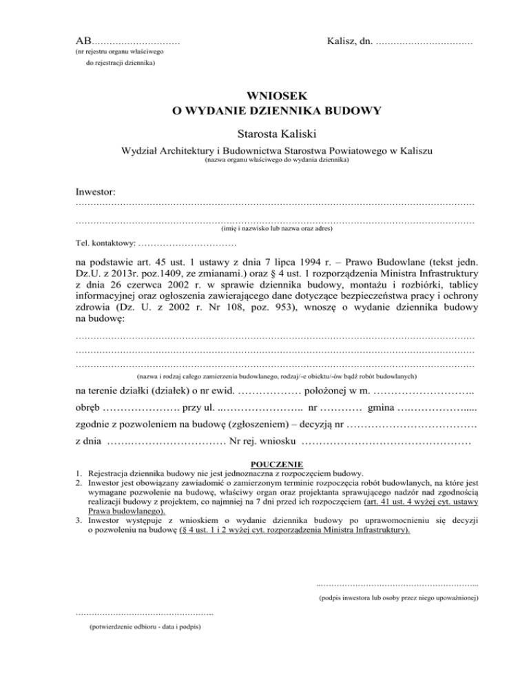 AB………………………… Kalisz, dn. …………………………… (nr rejestru organu właściwego do rejestracji dziennika) WNIOSEK O WYDANIE DZIENNIKA BUDOWY Starosta Kaliski Wydział Architektury i Budownictwa Starostwa Powiatowego w Kaliszu (nazwa organu właściwego do wydania dziennika) Inwestor: ……………………………………………………………………………………………………………………… ……………………………………………………………………………………………………………………… (imię i nazwisko lub nazwa oraz adres) Tel. kontaktowy: . .. .... ...... . ........ ...... .... na podstawie art. 45 ust. 1 ustawy z dnia 7 lipca 1994 r. – Prawo Budowlane (tekst jedn. Dz.U. z 2013r. poz.1409, ze zmianami.) oraz § 4 ust. 1 rozporządzenia Ministra Infrastruktury z dnia 26 czerwca 2002 r. w sprawie dziennika budowy, montażu i rozbiórki, tablicy informacyjnej oraz ogłoszenia zawierającego dane dotyczące bezpieczeństwa pracy i ochrony zdrowia (Dz. U. z 2002 r. Nr 108, poz. 953), wnoszę o wydanie dziennika budowy na budowę: ……………………………………………………………………………………………………………………… ……………………………………………………………………………………………………………………… ……………………………………………………………………………………………………………………… (nazwa i rodzaj całego zamierzenia budowlanego, rodzaj/-e obiektu/-ów bądź robót budowlanych) na terenie działki (działek) o nr ewid. ……………… położonej w m. ……………………….. obręb …………………. przy ul. ..………………….. nr ………… gmina ….……………..... zgodnie z pozwoleniem na budowę (zgłoszeniem) – decyzją nr ………………………………. z dnia …….……………………… Nr rej. wniosku ………………………………………… POUCZENIE 1. Rejestracja dziennika budowy nie jest jednoznaczna z rozpoczęciem budowy. 2. Inwestor jest obowiązany zawiadomić o zamierzonym terminie rozpoczęcia robót budowlanych, na które jest wymagane pozwolenie na budowę, właściwy organ oraz projektanta sprawującego nadzór nad zgodnością realizacji budowy z projektem, co najmniej na 7 dni przed ich rozpoczęciem (art. 41 ust. 4 wyżej cyt. ustawy Prawa budowlanego). 3. Inwestor występuje z wnioskiem o wydanie dziennika budowy po uprawomocnieniu się decyzji o pozwoleniu na budowę (§ 4 ust. 1 i 2 wyżej cyt. rozporządzenia Ministra Infrastruktury). ..…………………………………………………... (podpis inwestora lub osoby przez niego upoważnionej) ……………………………………………. (potwierdzenie odbioru - data i podpis)