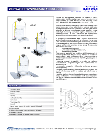 ZESTAW DO WYZNACZANIA GĘSTOŚCI data wyd. 15-06-2015 Zestaw do wyznaczania gęstości ciał stałych i cieczy przeznaczony jest do współpracy z wagami laboratoryjnymi zaopatrzonymi w szalkę ø85 i ø100 mm [KIT 85], szalkę 128×128 mm [KIT 128] i szalkę 195×195 mm [KIT 195]. KIT 85 KIT 128 KIT 195 Wyznaczanie gęstości ciał stałych i cieczy jest nieodłącznym elementem pracy wielu laboratoriów. Metoda tradycyjna wymaga od operatora wielu pomiarów i nie mniej żmudnych obliczeń. W efekcie otrzymywany wynik gęstości próbki może być obarczony szeregiem błędów obliczeniowych i systematycznych, a czas potrzebny na wyznaczenie gęstości ciała stałego lub cieczy jest stosunkowo długi. W przypadku zastosowania wag z funkcją wyznaczania gęstości można znacznie uprościć i przyśpieszyć ten proces. Czas potrzebny na otrzymanie wyniku końcowego jest krótki ze względu na to, iż wszystkie obliczenia wykonuje program wagi, a użytkownik ogranicza swoją pracę do czynności manualnych takich jak: − obsługa klawiatury wagi, − umieszczenie próbek na szalkach, − zawieszanie pływaka. Wyznaczanie gęstości jest możliwe dzięki zestawowi do pomiaru gęstości ciał stałych i cieczy. Stanowi on dodatkowe wyposażenie wag laboratoryjnych. Oprogramowanie umożliwiające określanie gęstości charakteryzuje się przede wszystkim: −prostotą obsługi (wszystkie czynności są opisane komunikatami eksponowanymi dla użytkownika na wyświetlaczu), −pewnością (wszystkie obliczenia wykonuje program automatycznie), −szybkim przetwarzaniem danych (wynik otrzymywany jest po określeniu masy próbki w wodzie lub też pływaka w cieczy), −rzetelną obróbką danych ( przed każdorazowym pomiarem masy wskazanie wyświetlacza jest automatycznie zerowane; dzięki temu wyniki są rzetelne i odzwierciedlają stan faktyczny). Specyfikacja: 1-podstawa zlewki 2-wieszak szalek 3-nurnik 4-zlewka 5-uchwyt termometru 6-termometr 7-cięgno pływaka 8-haczyk 9-górna szalka zestawu do pomiaru gęstości ciał stałych 10-cięgno szalek 11-dolna szalka zestawu do pomiaru gęstości ciał stałych 12-dodatkowy ciężarek 13-dodatkowy mieszak dla zestawu szalek lub nurnik • 26-600 Radom ul. Bracka 28 • tel. +48 48 3848800 • fax. +48 48 3850010 • www.radwag.pl • e-mail:[email protected]