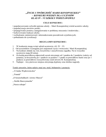 „śYCIE I TWÓRCZOŚĆ MARII KONOPNICKIEJ” – KONKURS WIEDZY DLA UCZNIÓW KLAS IV– VI SZKOŁY PODSTAWOWEJ CELE KONKURSU: • popularyzowanie sylwetki patrona szkoły – Marii Konopnickiej wśród uczniów szkoły; • popularyzacja utworów poetki; • propagowanie postawy zaangaŜowania w problemy otoczenia i środowiska ; • kultywowanie tradycji szkoły; • rozbudzanie zainteresowań i ukierunkowanie poszukiwań czytelniczych; • pobudzanie do rywalizacji. REGULAMIN KONKURSU: 1. W konkursie mogą wziąć udział uczniowie z kl. IV - VI. 2. Od uczestników wymagana jest znajomość Ŝycia i twórczości Marii Konopnickiej. 3. Na konkurs składa się: test, krzyŜówka i zaszyfrowana zagadka. Na to wszystko uczniowie mają 60 minut. 4. Za kaŜdą prawidłową odpowiedź uczeń otrzymuje od 1 punktu do 3 punktów (zaleŜy od pytania), za krzyŜówkę po 1 punkcie za pytanie i 1 punkt za prawidłowe hasło oraz po 1 punkcie za prawidłowo rozszyfrowany tytuł utworu M. Konopnickiej. 5. Najlepsi – trzy pierwsze miejsca otrzymają dyplomy oraz drobne nagrody. Tytuły utworów, które naleŜy znać tzn. treść, bohaterów i postacie: „ O Janku Wędrowniczku” „ Franek” „O krasnoludkach i sirotce Marysi” „ Stefek Burczymucha” „Nasza szkapa” … ............................................... (imię i nazwisko ucznia) (klasa) „śYCIE I TWÓRCZOŚĆ MARII KONOPNICKIEJ” – KONKURS WIEDZY O PATRONIE SZKOŁY DLA UCZNIÓW KLAS IV– VI SZKOŁY PODSTAWOWEJ 1. Gdzie i kiedy urodziła się Maria Konopnicka?(0-2p) … .................................................................................................................................................. 2. Ile lat Ŝyła poetka oraz gdzie została pochowana?(0-2p) … .................................................................................................................................................. 3. Gdzie Konopnicka spędziła dzieciństwo i młodość?(0-1p) … .................................................................................................................................................. 4. Jaki utwór Marii Konopnickiej był hymnem polskich harcerzy i kto napisał do niego muzykę?(0-2p) … ................................................................................................................................................. 5. W jaki sposób poetka zarabiała na Ŝycie w Warszawie?(0-1p) … ................................................................................................................................................ 6. Ile lat miała Maria, kiedy zmarła jej matka?(0-1p) … ................................................................................................................................................. 7. Gdzie Konopnicka poznała Elizę Pawłowską?(0-1p) … ................................................................................................................................................ 8. Jak nazywał się mąŜ Marii Konopnickiej?(0-1p) … ................................................................................................................................................ 9. Z jakiej okazji i od kogo otrzymała Konopnicka dworek w śarnowcu koło Krosna?(0-2p) … ................................................................................................................................................ 10. Gdzie Maria Konopnicka zamieszkała wraz z dziećmi w latach 1877– 1890?(0-1p) ...................................................................................................................................................... 11. Jaki tytuł nosi pierwszy utwór M. Konopnickiej?(0-1p) a)„Memu miastu” b)„Zimowy poranek” c)„Dym” 12. Podaj tytuł pisma dla kobiet redagowanego przez Marię Konopnicką w latach 1884– 1886.(0-1p) … ................................................................................................................................................ 13. W jakich krajach Europy Zachodniej przebywała Maria od 1890 r. ? (Wymień trzy).(0-3p) … ................................................................................................................................................. 14. Jak nazywał się jeden z bohaterów opowiadania „Nasza szkapa”(0-1p) a) Jasiek, b) Felek, c) Maciek 15. W którym roku Konopnicka debiutowała jako poetka?(0-1p) … ................................................................................................................................................. 16. Którego z pseudonimów nie uŜywała Konopnicka?(0-1p) a) Jan Sawa b) Jan Marko c) Jan WaręŜ 17. Podaj tytuł ostatniego utworu Marii Konopnickiej.(0-1p) … .............................................................................................................................................. 18. Z jakiego utworu M. Konopnickiej pochodzą postacie: królowa Tatra, Skrobek, Pietrzyk?(0-1p) … ............................................................................................................................................. 19. Wymień 3 najbardziej znane utwory Konopnickiej.(0-3p) … ............................................................................................................................................. 20. Napisz tytuł wiersza, z którego pochodzi poniŜszczy fragment. (0-1p) „ … Ja nikogo się nie boję! Choćby niedźwiedź... to dostoję! Wilki?... Ja ich całą zgraję Pozabijam i pokraję! Te hieny, te lamparty To są dla mnie czyste Ŝarty!...” ..................................................................................................................................................... RozwiąŜ krzyŜówkę: 1. 2. 3. 4. 5. 6. 7. 8. Pytania: 1. „A co tam za hałas? — To Franek wrzeszczy! — CóŜ mu się stało? — A nic. Tak, z rozpusty! — A kto tę szybę wybił? — To Franek kami