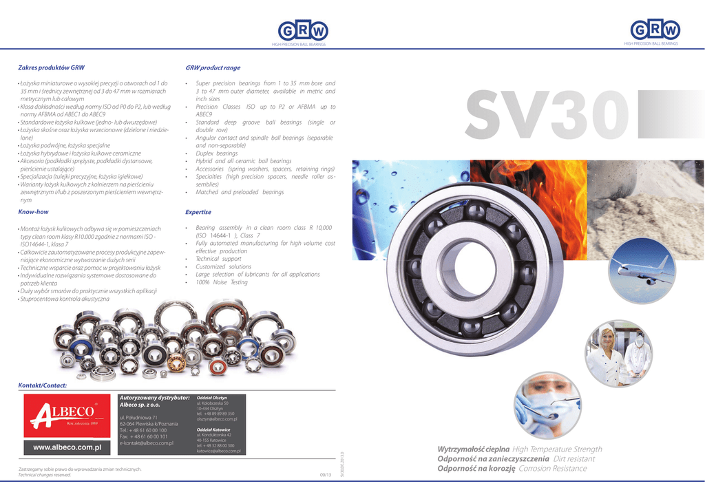 HIGH PRECISION BALL BEARINGS HIGH PRECISION BALL BEARINGS Zakres produktów GRW GRW product range • Łożyska miniaturowe o wysokiej precyzji o otworach od 1 do 35 mm i średnicy zewnętrznej od 3 do 47 mm w rozmiarach metrycznym lub calowym • Klasa dokładności według normy ISO od P0 do P2, lub według normy AFBMA od ABEC1 do ABEC9 • Standardowe łożyska kulkowe (jedno- lub dwurzędowe) • Łożyska skośne oraz łożyska wrzecionowe (dzielone i niedzielone) • Łożyska podwójne, łożyska specjalne • Łożyska hybrydowe i łożyska kulkowe ceramiczne • Akcesoria (podkładki sprężyste, podkładki dystansowe, pierścienie ustalające) • Specjalizacja (tulejki precyzyjne, łożyska igiełkowe) • Warianty łożysk kulkowych z kołnierzem na pierścieniu zewnętrznym i/lub z poszerzonym pierścieniem wewnętrznym • • • • • • • • • Super precision bearings from 1 to 35 mm bore and 3 to 47 mm outer diameter, available in metric and inch sizes Precision Classes ISO up to P2 or AFBMA up to ABEC9 Standard deep groove ball bearings (single or double row) Angular contact and spindle ball bearings (separable and non-separable) Duplex bearings Hybrid and all ceramic ball bearings Accessories (spring washers, spacers, retaining rings) Specialties (high precision spacers, needle roller assemblies) Matched and preloaded bearings Know-how Expertise • Montaż łożysk kulkowych odbywa się w pomieszczeniach typy clean room klasy R10.000 zgodnie z normami ISO ISO14644-1, klasa 7 • Całkowicie zautomatyzowane procesy produkcyjne zapewniające ekonomiczne wytwarzanie dużych serii • Techniczne wsparcie oraz pomoc w projektowaniu łożysk • Indywidualne rozwiązania systemowe dostosowane do potrzeb klienta • Duży wybór smarów do praktycznie wszystkich aplikacji • Stuprocentowa kontrola akustyczna • • • • • • Bearing assembly in a clean room class R 10,000 (ISO 14644-1 ), Class 7 Fully automated manufacturing for high volume cost effective production Technical support Customized solutions Large selection of lubricants for all applications 100% Noise Testing Kontakt/Contact: ul. Południowa 71 62-064 Plewiska k/Poznania Tel.: + 48 61 60 00 100 Fax: + 48 61 60 00 101 [email protected] Zastrzegamy sobie prawo do wprowadzania zmian technicznych. Technical changes reserved. Oddział Olsztyn ul. Kołobrzeska 50 10-434 Olsztyn tel. +48 89 89 89 350 [email protected] Oddział Katowice ul. Konduktorska 42 40-155 Katowice tel. + 48 32 88 00 300 [email protected] 09/13 SV30.DE.2013.0 Autoryzowany dystrybutor: Albeco sp. z o.o. Wytrzymałość cieplna High Temperature Strength Odporność na zanieczyszczenia Dirt resistant Odporność na korozję Corrosion Resistance HIGH PRECISION BALL BEARINGS SV30 - NOWY WYMIAR STALI ŁOŻYSKOWEJ SV30 - THE NEW DIMENSION IN BEARING STEELS HIGH PRECISION BALL BEARINGS High standards for small dimensions Doskonała jakość przy najmniejszej wielkości produktu - GRW produkuje łożyska kulkowe o wymiarach otworu od 1mm oraz średnicy zewnętrznej od 3mm. Staranny dobór niezbędnych do produkcji surowców zapewnia stałą i powtarzalną wysoką jakość wyrobów. Naszą podstawową zasadą jest stosowanie najbardziej zaawansowanych technicznie materiałów - na przykład stop SV 30. Ten innowacyjny materiał jest nowoczesnym połączeniem sprawdzonych składników stopu - azotu, węgla, chromu oraz molibdenu. Materiał SV30 charakteryzuje się większą wytrzymałością zmęczeniową na zginanie, wydłużeniem przy zerwaniu, twardością w podwyższonych temperaturach, odpornością na obciążenia dynamiczne oraz odpornością chemiczną. Biorąc pod uwagę te kryteria stop SV 30 jest zdecydowanie lepszy niż dotychczas stosowane rodzaje stali łożyskowej. Jego zastosowanie daje istotną przewagę naszych miniaturowych łożysk kulkowych poprzez: • wyższą odporność na korozję • dłuższą żywotność przy eksploatacji w wyższych temperaturach, w zanieczyszczonym środowisku roboczym, przy niedostatecznym smarowaniu, bądź bez smarowania • stabilność kształtu przy wysokich temperaturach Perfect performance even in smallest product dimen sions: GRW manufactures bearings starting with 1mm bore diameter and 3mm outer diameter. The professional selection of raw materials, parts and com ponents enables us to constantly provide our quality. customers with consistently high qualit It has always been our policy to choose the most advanced material available - for example the alloy SV30. It uses the constituents nitrogen, carbon, chrome and molybdenum in a new type of alloy composition. Prawdopodobieństwo awarii/ Failure Propability Wysokie standardy dla małych rozmiarów Odporność na korozję/ Corrosion Resistance Wyniki badania testu w komorze solnej według DIN 50021 / ASTM B117-73 100Cr6 SV30 Czas/ Time SV 30 stands out by its improved alternating bending strength, elongation at rupture, high temperature resistance, toughness and chemical resistance. SV 30 is well ahead of all ball-bearing steels used in production to date. This all results in considerable advantages for our miniature ball-bearings: • • • Higher resistance to corrosion Longer life time at high temperatures, in aggressive environments, with reduced lubrication or dry running Shape stability at high temperature Przykłady zastosowania Examples of Applications • Medycyna urządzenia chirurgiczne, pompy do przetaczania krwi, wiertarki dentystyczne Przemysł lotniczy oraz kosmiczny systemy pomiarowe i transportowe • Medical Surgical Equipment, Blood Pumps, Dental Turbines • Aviation and Aerospace Industry Measurement and Transport Systems • Przemysł spożywczy mieszadła, przetwórstwo mięsa, kwaśne produkty spożywcze • Food Industry Stirrers, meat processing, acidic foods • Przemysł chemiczny przepływomierze, aplikacje w środowiskach o agresywnym działaniu • Chemical Industry Flow Meters, Applications in Hostil