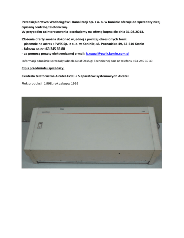 Przedsiębiorstwo Wodociągów i Kanalizacji Sp. z o. o. w Koninie oferuje do sprzedaży niżej opisaną centralę telefoniczną. W przypadku zainteresowania oczekujemy na ofertę kupna do dnia 31.08.2013. Złożenia oferty można dokonać w jednej z poniżej określonych form: - pisemnie na adres : PWiK Sp. z o. o. w Koninie, ul. Poznańska 49, 62-510 Konin - faksem na nr: 63 245 83 80 - za pomocą poczty elektronicznej e-mail: [email protected] Informacji odnośnie sprzedaży udziela Dział Obsługi Technicznej pod nr telefonu : 63 240 39 39. Opis przedmiotu sprzedaży: Centrala telefoniczna Alcatel 4200 + 5 aparatów systemowych Alcatel Rok produkcji 1998, rok zakupu 1999