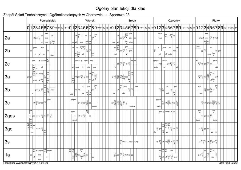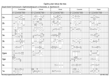Ogólny plan lekcji dla klas Zespół Szkół Technicznych i Ogólnokształcących w Chorzowie, ul. Sportowa 23 Poniedziałek 2a 2b jpol ir wiai jan r_ gza m w so kw z pe tec hog pe wf rel jan f-r g epz wf jnie jan m g utk jan jan gza utk g w jan gza w jnie m u_ hist plsk jan i sp g pipśr jan tim pei rel g e e uc jnie pgi m gp r_ wo m s pspiur gr pipśr wf psso jnie m ue gr wf r_ m jan ma dsr dsr g t jpol pp wf dg ppi wb bw inf g g jan g sk r_ gz jpol m w wf u_hi st. i sp. wf plsk jan gza wf miug w r_ jpol gr m jan miug wf g ir ue rel gr ppripm 3s 1a peie wf miug wf piur 3c 3ge psso peie ua r_ rel jpol m 3b 2ges Środa Czwartek Piątek 0 1 2 3 4 5 6 7 8 9 10 11 12 13 14 0 1 2 3 4 5 6 7 8 9 10 11 12 13 14 0 1 2 3 4 5 6 7 8 9 10 11 12 13 14 0 1 2 3 4 5 6 7 8 9 10 11 12 13 14 0 1 2 3 4 5 6 7 8 9 10 11 12 13 14 2c 3a Wtorek ir eie wo e s jnie m wiai pe-p utk plsk jan g ppi ma r_ rel jpol epz bw t m jan g jan gza wf g w wf rel wf plsk ppripm ir pai pai jan jnie g m kpi gr rel dsr op jpol mz ppez pe rel wf rystech ma t pg p jan peie gza ma w jpol peie pp t kw epz wf ptikm z jan jan wf gza g w ma jpol plsk t jpol wf wf jpol ma jan gz rel t g w wf wf pai wf jan wiai g jpol wf peie peie uc Plan lekcji wygenerowany:2016-05-09 putk sk ppripm hist so wf pspiur so putk jpol hist jan wo g s rel jpol wiue wf sbd kpi u_ jan gz r_ dsr op hist g w m mz i sp plsk ma r_ t m ppripm ppripm pipśr pai pbd rel pbd jan g pmiug pmiug pt pt ele ge ch biol rel f jnie ogr jan em ue m g wd ma r_ jpol hist rel pp żwr t m pp ma t sk jan g psso rel jpol pe-p jnie ma rel jpol pp m t tunip rel jan pd jan wo wf rel gza inf g g s w wf sbd wiai jan u_ jnie wf gza jpol rel hist m w i sp jan ppi pp gza bw ez w g wo gz ma jpol wf w s t dg ele wb pe e jnie m plsk wf wf kw jan z g ma gz hist t w wiai jan wf dg g ma ma rel wb jpol t t g jnie wf m ma ma t t jan mw wf tunip g pip pip dg dg ir putk jan g jan gza w eip jan wf pspiur ppripm wr g wiue gz w wiue jnie jan f-r wf m g jan jan gz g u_ aw gz pgi ptik gr hist epz w gp m i sp jan g jan g ppripm wiue wf jan eip g wr jan jnie ma r_ wf gr jpol gza m t m w ppib wg wf jpol hist tunip gz w kw z tunip wf jan pp rel g pp twemui gz ma wf jpol n w t piur jan tim mei inf wf eiee g e e jan g u_ dg jpolhist. wf wbi i sp. jpol ed b wf wf wo k pe eip inf wr eiee inf gz w aSc Plan Lekcji Zespół Szkół Technicznych i Ogólnokształcących w Chorzowie, ul. Sportowa 23 Poniedziałek 1b 1c 1se Wtorek Środa Czwartek Piątek 0 1 2 3 4 5 6 7 8 9 10 11 12 13 14 0 1 2 3 4 5 6 7 8 9 10 11 12 13 14 0 1 2 3 4 5 6 7 8 9 10 11 12 13 14 0 1 2 3 4 5 6 7 8 9 10 11 12 13 14 0 1 2 3 4 5 6 7 8 9 10 11 12 13 14 putk jpol wf pss o wd ed ge jpol żwr b ogr gz r_ hist w m jan g jan g r_ m sk jan g eip wr so gz wd ma ed ge wf w żwr t b ogr Plan lekcji wygenerowany:2016-05-09 jan g jnie m inf biol pspiur utk so jnie wf m biol biol jpol wf che rel m pipdg f jnie wf m jnie jan inf wf m g ryst ech tim e rel hist ma t ma t putk so che jpol f m putk jpol jan che f g m jpol ed b wf putk piur putk tec ho g pei e so sk eip wr pss o utk jpol rel rel wf wf ge ogr jan g wf ma hist t wo k utk jan inf g so putk wf gz w wf inf pss o so jan g eip wr sk wo k wf wf wd jpol pp żwr rel pp ppripm wf rel aSc Plan Lekcji