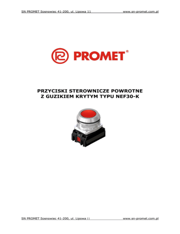 SN PROMET Sosnowiec 41-200, ul. Lipowa 11 www.sn-promet.com.pl PRZYCISKI STEROWNICZE POWROTNE Z GUZIKIEM KRYTYM TYPU NEF30-K SN PROMET Sosnowiec 41-200, ul. Lipowa 11 www.sn-promet.com.pl SN PROMET Sosnowiec 41-200, ul. Lipowa 11 www.sn-promet.com.pl PRZEZNACZENIE, BUDOWA, MONTAś Przyciski sterownicze z guzikiem krytym typu NEF30-K, z korpusami metalowymi, są przeznaczone do wbudowania w znormalizowane otwory Ø30,5 mm wykonane w pulpitach, tablicach sterowniczo-sygnalizacyjnych lub bezpośrednio w korpusach maszyn i urządzeń. Są one produkowane w dwóch wersjach klimatycznych N/2 oraz W/3. Przyciski sterownicze z guzikiem krytym typu NEF30-K mają budowę członową. KaŜdy przycisk składa się z: Członu napędowego zwanego napędem przycisku, Członu łączeniowego składającego się z jednego, dwóch lub trzech łączników przymocowanych do napędu. MontaŜ przycisków typu NEF30-K odbywa się za pomocą nakrętek mocujących, bez konieczności rozdzielenia napędu i łączników: Korpus przycisku (1) wkłada się do otworu montaŜowego od spodu pulpitu (3), Zakłada się pierścień uszczelniający (4), Nakręca się do oporu ozdobną, niklowaną nakrętkę oporową (5), Dokręca się nakrętkę mocującą (2) pod pulpitem. SN PROMET Sosnowiec 41-200, ul. Lipowa 11 www.sn-promet.com.pl SN PROMET Sosnowiec 41-200, ul. Lipowa 11 www.sn-promet.com.pl DANE TECHNICZNE PARAMETR WARTOŚĆ Znamionowe napięcie izolacji Ui 500V Znamionowy prąd cieplny Ith 10A Znamionowe prądy łączeniowe w kategoriach uŜytkowania Ie AC 15 – Ue 230V / 400V DC 13 – Ue 110V / 220V 6A / 4A 1A / 0,25A Napięcie znamionowe udarowe wytrzymywane 2500V Prąd organiczny wytrzymywany 1000A Stopień zanieczyszczenia środowiska 2 Stopień ochrony napędów przycisków IP 55 Stopień ochrony części podpulpitowej IP 20 Trwałość mechaniczna 3 x 106 Znamionowa częstość łączeń 600 ł/h Przekroje przewodów przyłączeniowych 1x lub 2x LY 0,75 – 1,5 mm2 1x lub 2x DY 1 – 1,5 mm2 PołoŜenie pracy Dowolne Temperatura pracy dla wykonania N/2 W/3 -15°C...+30°C -30°C...+50°C Wyrób zgodny z normą PN-EN 60947-1 RODZAJE PRZYCISKÓW NEF30-K Rodzaj Z guzikiem krytym IP Oznaczenie przycisku1) Kolor guzika 55 NEF30-Kc... NEF30-Kz... NEF30-Kg... NEF30-Ks... NEF30-Kn... NEF30-Kb... Czerwony Zielony śółty Czarny Niebieski Biały Masa (kg)2) 0,08 1) Przy zamówieniu przycisku typu NEF30-K naleŜy podać rodzaj elementu łączeniowego. Istnieje moŜliwość skompletowania przycisku z maks. 6 torami prądowymi - dowolna konfiguracja X (NO) i Y (NC), np. NEF30-Kc 2X2Y. 2) W tabeli podano masę napędu przycisku wraz z korpusem pośrednim, bez elementów łączeniowych. SN PROMET Sosnowiec 41-200, ul. Lipowa 11 www.sn-promet.com.pl SN PROMET Sosnowiec 41-200, ul. Lipowa 11 www.sn-promet.com.pl ELEMENT ŁĄCZENIOWY EF30 Rodzaj EF30 X – zwierny NO Y – rozwierny NC XY – zwierny i rozwierny NO i NC 2X – dwa zwierne 2 NO 2Y – dwa rozwierne 2 NC Masa (kg) 0,0185 0,0185 0,0245 0,0245 0,0245 WYMIARY GABARYTOWE SN PROMET Sosnowiec 41-200, ul. Lipowa 11 www.sn-promet.com.pl