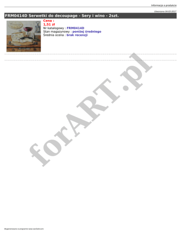 Informacje o produkcie Utworzono 04-03-2017 FRM0414D Serwetki do decoupage - Sery i wino - 2szt. Cena : 1,51 zł fo rA R T. pl Nr katalogowy : FRM0414D Stan magazynowy : poniżej średniego Średnia ocena : brak recenzji Wygenerowano w programie www.oscGold.com