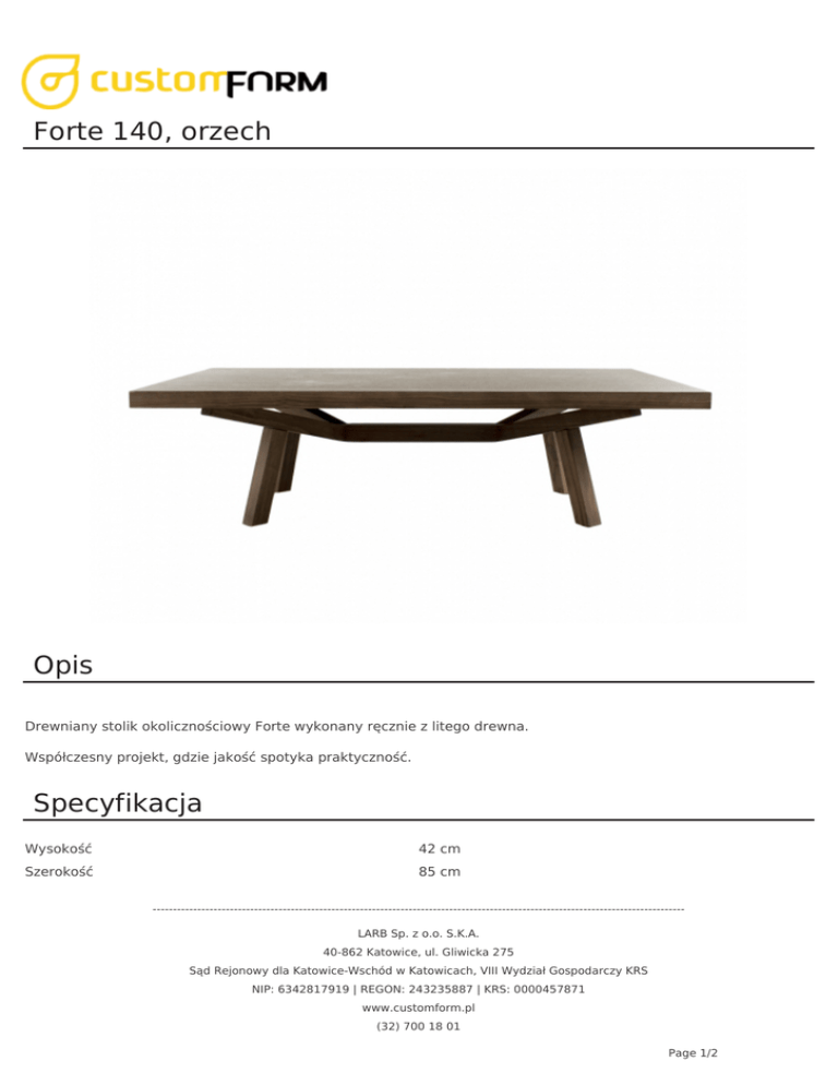 Forte 140, orzech Opis Drewniany stolik okolicznościowy Forte wykonany ręcznie z litego drewna. Współczesny projekt, gdzie jakość spotyka praktyczność. Specyfikacja Wysokość 42 cm Szerokość 85 cm ----------------------------------------------------------------------------------------------------------------------------------LARB Sp. z o.o. S.K.A. 40-862 Katowice, ul. Gliwicka 275 Sąd Rejonowy dla Katowice-Wschód w Katowicach, VIII Wydział Gospodarczy KRS NIP: 6342817919 | REGON: 243235887 | KRS: 0000457871 www.customform.pl (32) 700 18 01 Page 1/2 Długość 140 cm Podstawa drewno Blat MDF fornir Dodatkowe zdjęcia ----------------------------------------------------------------------------------------------------------------------------------LARB Sp. z o.o. S.K.A. 40-862 Katowice, ul. Gliwicka 275 Sąd Rejonowy dla Katowice-Wschód w Katowicach, VIII Wydział Gospodarczy KRS NIP: 6342817919 | REGON: 243235887 | KRS: 0000457871 www.customform.pl (32) 700 18 01 Page 2/2 Powered by TCPDF (www.tcpdf.org)
