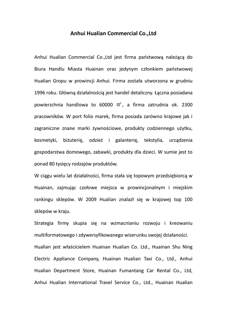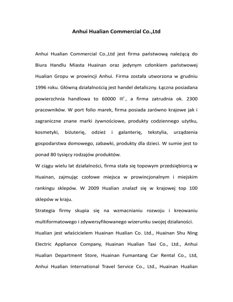 Anhui Hualian Commercial Co.,Ltd Anhui Hualian Commercial Co.,Ltd jest firma państwową należącą do Biura Handlu Miasta Huainan oraz jedynym członkiem państwowej Hualian Gropu w prowincji Anhui. Firma została utworzona w grudniu 1996 roku. Główną działalnością jest handel detaliczny. Łączna posiadana powierzchnia handlowa to 60000 ㎡ , a firma zatrudnia ok. 2300 pracowników. W port folio marek, firma posiada zarówno krajowe jak i zagraniczne znane marki żywnościowe, produkty codziennego użytku, kosmetyki, biżuterię, odzież i galanterię, tekstylia, urządzenia gospodarstwa domowego, zabawki, produkty dla dzieci. W sumie jest to ponad 80 tysięcy rodzajów produktów. W ciągu wielu lat działalności, firma stała się topowym przedsiębiorcą w Huainan, zajmując czołowe miejsca w prowincjonalnym i miejskim rankingu sklepów. W 2009 Hualian znalazł się w krajowej top 100 sklepów w kraju. Strategia firmy skupia się na wzmacnianiu rozwoju i kreowaniu multiformatowego i zdywersyfikowanego wizerunku swojej działaności. Hualian jest właścicielem Huainan Hualian Co. Ltd., Huainan Shu Ning Electric Appliance Company, Huainan Hualian Taxi Co., Ltd., Anhui Hualian Department Store, Huainan Fumantang Car Rental Co., Ltd, Anhui Hualian International Travel Service Co., Ltd., Huainan Hualian Investment Co., Ltd., Huainan Huashu Agriculture Science and Technology Co., Ltd., Huainan Shenfu Ecological Agriculture Co., Ltd.. Dziewięć firm działających w branżach takich jak leasing samochodów, nieruchomości, turystyka, hotelarstwo, rolnictwo i inne pozwalają na uzyskanie wcześniej wspomnianego wizerunku firmy zdywersyfikowanej i multiformatowej. Firma posiada biura w Szanghaju, Kantonie oraz Yiwu, które odpowiedzialne są za rozwój nowych produktów. W ciągu wielu lat funkcjonowania, firma zbudowała silną grupę dostawców. W posiadaniu Hualian znajduje się 9 wielkopowierzchniowych supermarketów, których łączna powierzchnia to ponad 42 000 metrów kwadratowych. Dzięki uplasowaniu się w topowej setce sklepów w kraju, Hualian postrzegany jest jako firma otwarta i dynamicznie rozwijająca się, będąc jednocześnie jedną z kluczowych firm w Huainan i prowincji Anhui. Firma współpracuje m.in. ze strefą ekonomiczno – handlową Bella Mozambique oraz aktywnie rozwija współprace z krajami Afryki. Hualian cieszy się pełnym wsparciem i uznaniem Wydziału Handlu prowincji Anhui.