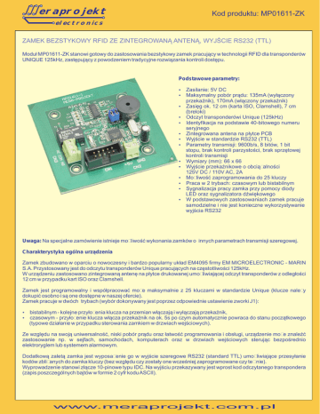 eraprojekt Kod produktu: MP01611-ZK electronics ZAMEK BEZSTYKOWY RFID ZE ZINTEGROWANĄ ANTENĄ, WYJŚCIE RS232 (TTL) Moduł MP01611-ZK stanowi gotowy do zastosowania bezstykowy zamek pracujący w technologii RFID dla transponderów UNIQUE 125kHz, zastępujący z powodzeniem tradycyjne rozwiązania kontroli dostępu. Podstawowe parametry: Zasilanie: 5V DC Maksymalny pobór prądu: 135mA (wyłączony przekaźnik), 170mA (włączony przekaźnik) Zasięg ok. 12 cm (karta ISO, Clamshell), 7 cm (breloki) Odczyt transponderówi Unique (125kHz) Identyfikacja na podstawie 40-bitowego numeru seryjnego Zintegrowana antena na płytce PCB Wyjście w standardzie RS232 (TTL) Parametry transmisji: 9600b/s, 8 bitów, 1 bit stopu, brak kontroli parzystości, brak sprzętowej kontroli transmisji Wymiary (mm): 66 x 66 Wyjście przekaźnikowe o obciążalności 125V DC / 110V AC, 2A Możliwość zaprogramowania do 25 kluczy Praca w 2 trybach: czasowym lub bistabilnym Sygnalizacja pracy zamka przy pomocy diody LED oraz sygnalizatora dźwiękowego W podstawowych zastosowaniach zamek pracuje samodzielne i nie jest konieczne wykorzystywanie wyjścia RS232 Uwaga: Na specjalne zamówienie istnieje możliwość wykonania zamków o innych parametrach transmisji szeregowej. Charakterystyka ogólna urządzenia Zamek zbudowano w oparciu o nowoczesny i bardzo popularny układ EM4095 firmy EM MICROELECTRONIC - MARIN S.A. Przystosowany jest do odczytu transponderów Unique pracujących na częstotliwości 125kHz. W urządzeniu zastosowano zintegrowaną antenę na płytce drukowanej umożliwiającej odczyt transponderów z odległości 12 cm w przypadku kart ISO oraz Clamshell. Zamek jest programowalny i współpracować może maksymalnie z 25 kluczami w standardzie Unique (klucze należy dokupić osobno i są one dostępne w naszej ofercie). Zamek pracuje w dwóch trybach (wybór dokonywany jest poprzez odpowiednie ustawienie zworki J1): bistabilnym - kolejne przyłożenia klucza na przemian włączają i wyłączają przekaźnik, czasowym - przyłożenie klucza włącza przekaźnik na ok. 5s po czym automatycznie powraca do stanu początkowego (typowe działanie w przypadku sterowania zamkiem w drzwiach wejściowych). Ze względu na swoją uniwersalność, niski pobór prądu oraz łatwość programowania i obsługi, urządzenie może znaleźć zastosowanie np. w sejfach, samochodach, komputerach oraz w drzwiach wejściowych sterując bezpośrednio elektroryglem lub systemem alarmowym. Dodatkową zaletą zamka jest wyposażenie go w wyjście szeregowe RS232 (standard TTL) umożliwiające przesyłanie kodów zbliżanych do zamka kluczy (bez względu czy zostały one wcześniej zaprogramowane czy też nie). Wyprowadzenie stanowi złącze 10-pinowe typu IDC. Na wyjściu przekazywany jest wprost kod odczytanego transpondera (zapis poszczególnych bajtów w formie 2 cyfr kodu ASCII). www.meraprojekt.com.pl eraprojekt Kod produktu: MP01611-ZK electronics Praca zamka sygnalizowana jest poprzez diodę LED oraz sygnalizator dźwiękowy. Urządzenie współpracuje bezpośrednio z modułami interfejsów (praca opcjonalna wykorzystująca wyjście szeregowe RS232): MP00101 - moduł konwertera umożliwiający podłączenie czytnika do portu USB komputera. MP-RS232-DCE - interfejs na standard RS232 umożliwiający podłączenie czytnika do portu szeregowego komputera lub innego urządzenia wyposażonego w standardowy port szeregowy COM. MP01503 - interfejs na standard RS485 Rozkład wyprowadzeń zamka MP01611-ZK Złącze CN1: J2 J1 3: OUT (sygnał wyjściowy w standardzie RS232 TTL) 9: GND (masa) 10: VCC (zasilanie +5V DC) Pozostałe wyprowadzenia: nie podłączone. CN3 Złącze CN2 (zasilanie +5V DC) NC COM NO VCC CN1 2 1 CN2 10 9 Uwaga: Czytnik zasilany powinien być jedynie z jednego źródla, poprzez złącze CN1 (np. z modułu MP00101) lub poprzez złącze CN2. OUT GND VCC GND Złącze CN3 (wyprowadzenie styków przekaźnika): Styki przekaźnika w stanie wyłączonym NC COM NO Styki przekaźnika w stanie włączonym NC COM NO Zworka J1 (ustalenie trybu pracy zamka): rozłączona - tryb czasowy załączona - tryb bistabilny Zworka J2 (wejście w tryb zapisu kluczy): rozłączona - normalna praca zamka załączona - tryb programowania Działanie zamka Zamek posiada dwa stany pracy: załączony i wyłączony. Wyjście sterujące stanowi przekaźnik z jedną parą styków przełącznych NO/NC. W stanie załączony styki przekaźnika zwierają zaciski oznaczone COM i NO, natomiast w stanie wyłączony zwierają zaciski COM i NC. Zakupione urządzenie nie posiada zapisanych w pamięci kluczy kodowych. Aby tego dokonać należy przed podłączeniem zasilania zewrzeć zworkę J2. Po włączeniu zasilania nastąpi przejście do trybu programowania. Sygnalizowane jest to cyklicznym miganiem diody LED. Teraz należy kolejno przykładać do czytnika klucze kodowe (maksymalnie 25 szt.), które mają być zarejestrowane. Jeśli wykorzystywana liczba kluczy jest mniejsza należy po zarejestrowaniu ostatniego klucza rozłączyć zworkę J2. Podczas rejestrowania kluczy poprawna operacja jest sygnalizowana sygnałem dźwiękowym. Po zapisie ostatniego 25-go klucza następuje automatyczne wyjście z trybu programowania i dalsze zapisy nie są możliwe. Uwaga: Podłączenie zasilania przy zapiętej zworce J2 powoduje automatyczne wykasowanie poprzednio zarejestrowanych kluczy. www.meraprojekt.com.pl eraprojekt Kod produktu: MP01611-ZK electronics Po zaprogramowaniu kluczy zamek jest gotowy do normalnej pracy. Praca urządzenia w trybie czasowym (zworka J1 rozłączona) W trybie tym przyłożenie klucza włącza przekaźnik na ok. 5s po czym automatycznie powraca do stanu początkowego (typowe działanie w przypadku sterowania zamkiem w drzwiach wejściowych). Uwaga: Na specjalne zamówienie istnieje możliwość wykonania wersji z innym czasem podtrzymania. Praca urządzenia w trybie bistabilnym (zworka J1 załączona) W trybie tym kolejne przyłoż