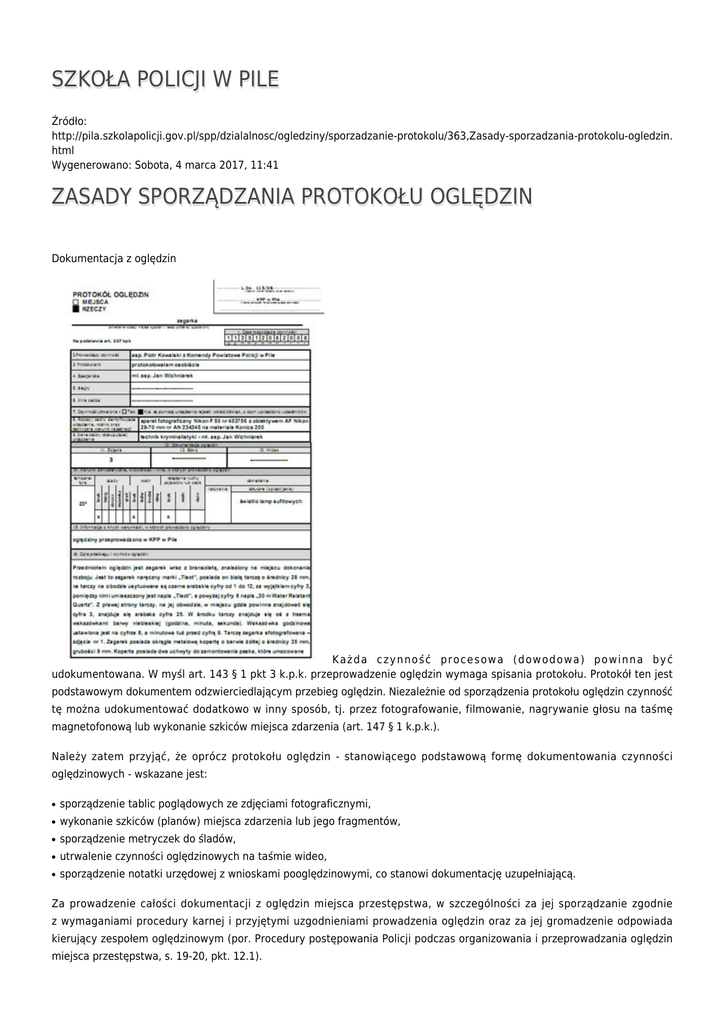SZKOŁA POLICJI W PILE Źródło: http://pila.szkolapolicji.gov.pl/spp/dzialalnosc/ogledziny/sporzadzanie-protokolu/363,Zasady-sporzadzania-protokolu-ogledzin. html Wygenerowano: Sobota, 4 marca 2017, 11:41 ZASADY SPORZĄDZANIA PROTOKOŁU OGLĘDZIN Dokumentacja z oględzin Każda czynność procesowa (dowodowa) powinna być udokumentowana. W myśl art. 143 § 1 pkt 3 k.p.k. przeprowadzenie oględzin wymaga spisania protokołu. Protokół ten jest podstawowym dokumentem odzwierciedlającym przebieg oględzin. Niezależnie od sporządzenia protokołu oględzin czynność tę można udokumentować dodatkowo w inny sposób, tj. przez fotografowanie, filmowanie, nagrywanie głosu na taśmę magnetofonową lub wykonanie szkiców miejsca zdarzenia (art. 147 § 1 k.p.k.). Należy zatem przyjąć, że oprócz protokołu oględzin - stanowiącego podstawową formę dokumentowania czynności oględzinowych - wskazane jest: ● sporządzenie tablic poglądowych ze zdjęciami fotograficznymi, ● wykonanie szkiców (planów) miejsca zdarzenia lub jego fragmentów, ● sporządzenie metryczek do śladów, ● utrwalenie czynności oględzinowych na taśmie wideo, ● sporządzenie notatki urzędowej z wnioskami pooględzinowymi, co stanowi dokumentację uzupełniającą. Za prowadzenie całości dokumentacji z oględzin miejsca przestępstwa, w szczególności za jej sporządzanie zgodnie z wymaganiami procedury karnej i przyjętymi uzgodnieniami prowadzenia oględzin oraz za jej gromadzenie odpowiada kierujący zespołem oględzinowym (por. Procedury postępowania Policji podczas organizowania i przeprowadzania oględzin miejsca przestępstwa, s. 19-20, pkt. 12.1). Protokół oględzin - prawidłowe sporządzenie protokołu oględzin wymaga znajomości podstawowych zasad, których należy przestrzegać. Zasada bezpośredniości - protokół oględzin powinien być sporządzony na miejscu zdarzenia w obecności osób uczestniczących w oględzinach (dopuszcza się przepisanie go na maszynie w jednostce i dołączenie do akt wraz z oryginałem). Zasada komunikatywności - protokół oględzin musi być tak zredagowany, aby czytający go człowiek, który nie był na miejscu zdarzenia, mógł na jego podstawie łatwo zorientować się co do istotnych właściwości tego miejsca; zakaz pozostawiania wolnych miejsc w protokole, chodzi tu o to by wszystkie rubryki protokółu były wypełnione lub zakreślone; nakaz unikania niepotrzebnych skreśleń i poprawek (poczynione należy opisać). Zasada zwięzłości opisu - redakcja tekstu powinna być syntetyczna, zwięzła i rzeczowa; należy opisywać fakty istotne, nie przeładowywać treści niepotrzebnym opisem sytuacji; należy odwoływać się do zdjęć, szkiców, stron świata. Zasada stosowania odpowiednich form gramatycznych - formy bezosobowej dokonanej, np. "?ślad linii papilarnych ujawniono argentoratem?"; czasu teraźniejszego, np. "?na blacie biurka leży nóż?". Zasada dokładności - w opisie czynności podejmowanych podczas oględzin należy uwzględnić nie tylko te działania, które dały jakiekolwiek wyniki, ale wymienić trzeba także wszystko to, co w ogóle zrobiono, tak aby czytający ten opis nabrał przekonania, że rzeczywiście niczego nie przeoczono lub zaniechano; w treści protokołu nie należy używać słów wieloznacznych, niezrozumiałych, nieostrych, np. mniej więcej, około, przypuszczalnie, w pobliżu, prawie, obok, tuż. Zasada obiektywizmu - prowadząc oględziny, należy ściśle opisywać zastany stan faktyczny, bez zamieszczania w treści protokołu własnych wniosków i sugestii (dopuszczalne jest jednak wpisywanie oświadczeń osób uczestniczących w oględzinach), nie wolno podawać nazw substancji (materiałów), jeśli nie ma pewności co to za substancja. Zasada zgodności dokumentacyjnej - dokumentacja uzupełniająca musi być zgodna z treścią protokołu oględzin; istnienie rozbieżności między protokołem a materiałem fotograficznym i szkicami stawia pod znakiem zapytania ustalenia z oględzin, a w konsekwencji powoduje odrzucenie przez sąd dowodu z oględzin. Zasada jednolitego nazewnictwa - podczas redagowania protokołu konieczne jest konsekwentne stosowanie jednolitego nazewnictwa opisywanych przedmiotów; w miarę możliwości należy stosować jednolite jednostki miary, redagując tekst protokołu oględzin; stosować należy polski język literacki (zakaz stosowania gwary regionalnej lub środowiskowej). Zasada systematyczności - w protokole oględzin należy zachować uporządkowaną kolejność opisu, zgodną z przyjętą kolejnością wykonywania czynności oględzinowych, tj. ślady należy opisywać według kolejności ich oznaczania (porównaj też: Procedury postępowania Policji podczas organizowania i przeprowadzania oględzin miejsca przestępstwa, s. 20, pkt. 12.4). Do protokołu oględzin powinny zostać załączone wszystkie ujawnione ślady. Po opisaniu ich w protokole oględzin (zabezpieczenie procesowe śladu) powinny zostać zabezpieczone pod względem kryminalistycznym. Także pozostała dokumentacja, o której była mowa wyżej stanowi załączniki do protokołu oględzin. Ocena: 4/5 (1) Tweetnij