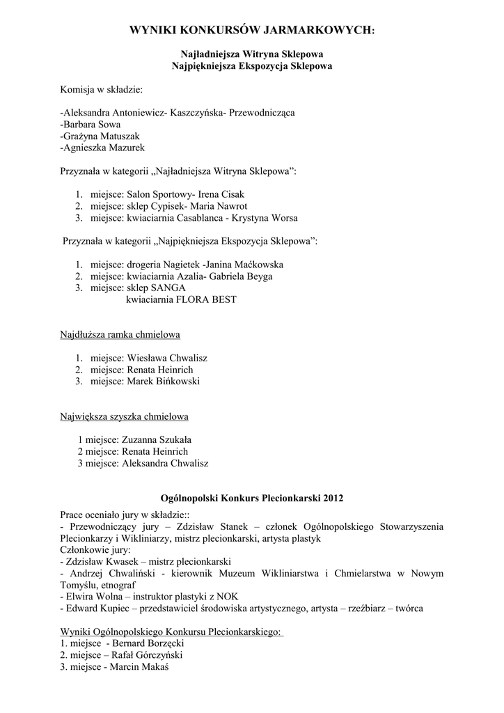 WYNIKI KONKURSÓW JARMARKOWYCH: Najładniejsza Witryna Sklepowa Najpiękniejsza Ekspozycja Sklepowa Komisja w składzie: -Aleksandra Antoniewicz- Kaszczyńska- Przewodnicząca -Barbara Sowa -Grażyna Matuszak -Agnieszka Mazurek Przyznała w kategorii „Najładniejsza Witryna Sklepowa”: 1. miejsce: Salon Sportowy- Irena Cisak 2. miejsce: sklep Cypisek- Maria Nawrot 3. miejsce: kwiaciarnia Casablanca - Krystyna Worsa Przyznała w kategorii „Najpiękniejsza Ekspozycja Sklepowa”: 1. miejsce: drogeria Nagietek -Janina Maćkowska 2. miejsce: kwiaciarnia Azalia- Gabriela Beyga 3. miejsce: sklep SANGA kwiaciarnia FLORA BEST Najdłuższa ramka chmielowa 1. miejsce: Wiesława Chwalisz 2. miejsce: Renata Heinrich 3. miejsce: Marek Bińkowski Największa szyszka chmielowa 1 miejsce: Zuzanna Szukała 2 miejsce: Renata Heinrich 3 miejsce: Aleksandra Chwalisz Ogólnopolski Konkurs Plecionkarski 2012 Prace oceniało jury w składzie:: - Przewodniczący jury – Zdzisław Stanek – członek Ogólnopolskiego Stowarzyszenia Plecionkarzy i Wikliniarzy, mistrz plecionkarski, artysta plastyk Członkowie jury: - Zdzisław Kwasek – mistrz plecionkarski - Andrzej Chwaliński - kierownik Muzeum Wikliniarstwa i Chmielarstwa w Nowym Tomyślu, etnograf - Elwira Wolna – instruktor plastyki z NOK - Edward Kupiec – przedstawiciel środowiska artystycznego, artysta – rzeźbiarz – twórca Wyniki Ogólnopolskiego Konkursu Plecionkarskiego: 1. miejsce - Bernard Borzęcki 2. miejsce – Rafał Górczyński 3. miejsce - Marcin Makaś Puchar dla najmłodszego uczestnika konkursu ufundowany przez Burmistrza Nowego Tomyśla Henryka Helwinga otrzymał Karol Molenda. Komisja konkursowa przyznała również wyróżnienia dla : Krzysztofa Pierzyńskiego, Katarzyny Wachowiak, Jolanty Surma, Katarzyny Kowalskiej I Anny Zelach, Łukasza Pawlaka, Piotra Barańczaka, Marii I Ryszarda Machowskich, Haliny Haładudy I Jana Bartosiewicza, Tadeusza Pięty, Grzegorza Stachowiaka, Henryka Napierały I Karola Molendy, Bernadetty Kufel –Diakowskiej, Zbigniewa Polaczka, Czesława I Macieja Łuczkowskich, Jarosława Mierzyńskiego , Małgorzaty Klimek, Krystyny Laskowskiej Dzięciołowskiej Z Zespołem