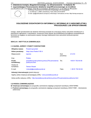 1/ 5 ENOTICES_powleczna - ID:2010-XXXXXX Formularz standardowy 14 — PL 1. Udzielenie kredytu długoterminowego, na sfinansowanie: 1) Zadanie Nr 1: wyprzedzające finansowanie działania współfinansowanego ze środków pochodzących z budżetu Unii Europejskiej określonego w budżecie Powiatu Publikacja Suplementu do Dziennika Urzędowego Unii Europejskiej na rok 2010 pn: ,,Wirtualne powiaty. Budowa społeczeństwa informacyjnego na 2, rue Mercier, L-2985 Luksemburg Faks (352) 29 29-42670 Lubelszczyźnie EtapE-mail: III "; [email protected] w kwocie 5 666 234 Informacje PLN zgodnie z Uchwałą Nr XLIV/276/2010 i formularze on-line: http://simap.europa.eu Rady Powiatu w Łęcznej, z dnia 05 listopada 2010r. 2) Zadanie Nr 2: na wyprzedzające finansowanie działania współfinansowanego ze środków pochodzących z budżetu Unii Europejskiej określonego w budżecie Powiatu na rok 2010 pn: ,,Program Bogdanka przebudowa dróg powiatowych o Nr 2013L i 1716L wraz z przebudową skrzyżowania w miejscowości Nadrybie poprzez budowę ronda"; wINFORMACJE kwocie 4 530 623 PLN zgodnie OGŁOSZENIE DODATKOWYCH INFORMACJI, O NIEKOMPLETNEJ z Uchwałą Nr XLIV/277/2010 Rady Powiatu w Łęcznej, z dnia 05 listopada 2010r. PROCEDURZE LUB SPROSTOWANIE ZP.3431/35/2010 Uwaga: Jeżeli sprostowanie lub dodanie informacji prowadzi do znaczącej zmiany warunków określonych w pierwotnym ogłoszeniu o zamówieniu, konieczne może okazać się przedłużenie początkowo przewidzianych terminów ze względu na zachowanie zasady równego traktowania oraz warunków konkurencyjności zamówienia. SEKCJA I: INSTYTUCJA ZAMAWIAJĄCA I.1) NAZWA, ADRESY I PUNKTY KONTAKTOWE Oficjalna nazwa: Powiat Łęczyński Adres pocztowy: Aleja Jana Pawła II 95 A Miejscowość: Łęczna Kraj: Polska Punkt kontaktowy: powiatleczynski.pl/strony,show,278,zamowienia- Tel.: publiczne.html Osoba do kontaktów: Teresa Olszak E-mail: [email protected] Kod pocztowy: Faks: 21-010 +48 81 752 64 80 + 48 81 752 64 64 Adres(y) internetowy(e) (jeżeli dotyczy) Ogólny adres instytucji zamawiającej (URL): www.powiatleczynski.pl Adres profilu nabywcy (URL): http://powiatleczynski.pl/strony,show,278,zamowienia-publiczne.html I.2) RODZAJ ZAMAWIAJĄCEGO Instytucja zamawiająca (w przypadku zamówienia objętego przepisami dyrektywy 2004/18/WE) Podmiot zamawiający (w przypadku zamówienia objętego przepisami dyrektywy 2004/17/WE – Zamówienia sektorowe) 2/ 5 ENOTICES_powleczna - ID:2010-XXXXXX Formularz standardowy 14 — PL 1. Udzielenie kredytu długoterminowego, na sfinansowanie: 1) Zadanie Nr 1: wyprzedzające finansowanie działania współfinansowanego ze środków pochodzących z budżetu Unii Europejskiej określonego w budżecie Powiatu SEKCJA II: PRZEDMIOT ZAMÓWIENIA na rok 2010 pn: ,,Wirtualne powiaty. Budowa społeczeństwa informacyjnego na Lubelszczyźnie Etap III "; w kwocie 5 666 234 PLN zgodnie z Uchwałą Nr XLIV/276/2010 II.1) OPIS Rady Powiatu w Łęcznej, z dnia 05 listopada 2010r. 2) Zadanie Nr 2: na wyprzedzające finansowanie działania współfinansowanego ze środków pochodzących z budżetu Unii II.1.1) Nazwa nadana zamówieniu przez instytucję zamawiającą (podano w pierwotnym ogłoszeniu) 1. Udzielenie kredytu długoterminowego, na sfinansowanie: 1) Zadanie Nr 1: wyprzedzające finansowanie Europejskiej określonego w budżecie Powiatu na rok 2010 pn: ,,Program Bogdanka działania współfinansowanego ze środków pochodzących z budżetu Unii Europejskiej określonego w budżecie przebudowa dróg powiatowych o Nr 2013L i 1716L wraz z przebudową skrzyżowania Powiatu na rok 2010 Nadrybie pn: ,,Wirtualne powiaty.budowę Budowa społeczeństwa informacyjnego Lubelszczyźnie Etap III w miejscowości poprzez ronda"; w kwocie 4 530 na 623 PLN zgodnie "; w kwocie 5 666 234 PLN zgodnie z Uchwałą Nr XLIV/276/2010 Rady Powiatu w Łęcznej, z dnia 05 listopada z2010r. Uchwałą Nr XLIV/277/2010 Rady Powiatu w Łęcznej, z dnia 05 listopada 2010r. 2) Zadanie Nr 2: na wyprzedzające finansowanie działania współfinansowanego ze środków pochodzących ZP.3431/35/2010 z budżetu Unii Europejskiej określonego w budżecie Powiatu na rok 2010 pn: ,,Program Bogdanka - przebudowa dróg powiatowych o Nr 2013L i 1716L wraz z przebudową skrzyżowania w miejscowości Nadrybie poprzez budowę ronda"; w kwocie 4 530 623 PLN zgodnie z Uchwałą Nr XLIV/277/2010 Rady Powiatu w Łęcznej, z dnia 05 listopada 2010r. ZP.3431/35/2010 II.1.2) Krôtki opis (podano w pierwotnym ogłoszeniu) 1. Udzielenie kredytu długoterminowego, na sfinansowanie: 1) Zadanie Nr 1: wyprzedzające finansowanie działania współfinansowanego ze środków pochodzących z budżetu Unii Europejskiej określonego w budżecie Powiatu na rok 2010 pn: ,,Wirtualne powiaty. Budowa społeczeństwa informacyjnego na Lubelszczyźnie Etap III "; w kwocie 5 666 234 PLN zgodnie z Uchwałą Nr XLIV/276/2010 Rady Powiatu w Łęcznej, z dnia 05 listopada 2010r. 2) Zadanie Nr 2: na wyprzedzające finansowanie działania współfinansowanego ze środków pochodzących z budżetu Unii Europejskiej określonego w budżecie Powiatu na rok 2010 pn: ,,Program Bogdanka - przebudowa dróg powiatowych o Nr 2013L i 1716L wraz z przebudową skrzyżowania w miejscowości Nadrybie poprzez budowę ronda"; w kwocie 4 530 623 PLN zgodnie z Uchwałą Nr XLIV/277/2010 Rady Powiatu w Łęcznej, z dnia 05 listopada 2010r. Termin spłaty w/w kredytów według zadań Nr 1 i Nr 2 – 30 czerwca 2011r. Wypłata w/w kredytów do 7 dni od daty podpisania umowy kredytowej na w/w zadania, szacunkowa data wypłaty kredytów to 21 grudnia 2010r. 2. Źródłem spłaty w/w kredytów będzie dotacja celowa uzyskana w ramach programów finansowanych z udziałem środków europejskich. 3. Wysokość prowizji bankowej od udzielonego kredytu nie może przekroczyć 1,0 % kwoty kredytu. 4. Kredyt będzie oprocentowany w oparciu o stawkę WIBOR 1M na dzień 31 października 2010 z uwzględnieniem marży Banku 5. CP