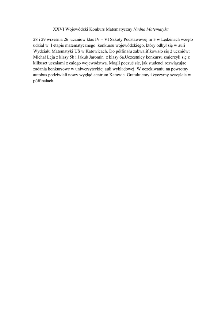 XXVI Wojewódzki Konkurs Matematyczny Nudna Matematyka 28 i 29 września 26 uczniów klas IV – VI Szkoły Podstawowej nr 3 w Lędzinach wzięło udział w I etapie matematycznego konkursu wojewódzkiego, który odbył się w auli Wydziału Matematyki UŚ w Katowicach. Do półfinału zakwalifikowało się 2 uczniów: Michał Leja z klasy 5b i Jakub Jaromin z klasy 6a.Uczestnicy konkursu zmierzyli się z kilkuset uczniami z całego województwa. Mogli poczuć się, jak studenci rozwiązując zadania konkursowe w uniwersyteckiej auli wykładowej. W oczekiwaniu na powrotny autobus podziwiali nowy wygląd centrum Katowic. Gratulujemy i życzymy szczęścia w półfinałach.