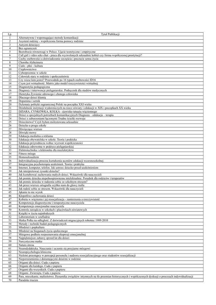 Lp. 1 2 3 4 5 6 7 8 9 10 11 12 13 14 15 16 17 18 19 20 21 22 23 24 25 26 27 28 29 30 31 32 33 34 35 36 37 38 39 40 41 42 43 44 45 46 47 48 49 50 51 52 53 54 55 56 57 58 59 60 61 62 63 64 65 66 67 68 69 70 Tytuł Publikacji Alternatywne i wspomagające metody komunikacji Asystent rodziny - współczesna forma pomocy rodzinie Autyzm dziecięcy Bez ograniczeń Bezrobocie równowagi w Polsce. Ujęcie teoretyczne i empiryczne Call girl i video seks chat - praca dla wyzwolonych seksualnie kobiet czy forma współczesnej prostytucji? Cechy osobowości a doświadczanie szczęścia i poczucie sensu życia Choroba Alzheimera Ciało - płeć - kultura Ciepłownictwo Cyberprzemoc w szkole Człowiek stary w rodzinie i społeczeństwie Czy wiesz kim jesteś? Przewodnik po 16 typach osobowości ID16 Czym jest wirtualność. Matrix jako model rzeczywistości wirtualnej Diagnostyka pedagogiczna Diagnozy i interwencje pielęgniarskie. Podręcznik dla studiów medycznych Dietetyka Żywienie zdrowego i chorego człowieka Dlaczego dzieci kłamią Dopamina i sernik Dylematy polityki zagranicznej Polski na początku XXI wieku Działalność instytucji wydawniczych na rzecz oświaty i edukacji w XIX i początkach XX wieku DZIARA, CYNKÓWKA, KOLKA - zjawisko tatuażu więziennego Dzieci o specjalnych potrzebach komunikacyjnych Diagnoza – edukacja – terapia Dzieci z zaburzeniami łączonymi Trudne ścieżki rozwoju Dzieciństwo? Czyli byłam molestowana seksualnie Dziecko u progu szkoły Dźwięczące wiersze Dźwięki mowy Edukacja medialna a reklama Edukacja obywatelska w szkole. Teoria i praktyka Edukacja przyrodnicza wobec wyzwań współczesności Edukacja zdrowotna w praktyce pielęgniarskiej Elektrotechnika i elektronika dla nieelektryków Fitness mózgu Homoseksualizm Indywidualizacja procesu kształcenia uczniów edukacji wczesnoszkolnej Integracyjna psychoterapia uzależnień. Teoria i praktyka Internet, komputer, telefon. Jak ustrzec dziecko przed uzależnieniem Jak interpretować rysunki dziecka? Jak kształtować zachowania małych dzieci. Wskazówki dla nauczycieli Jak pomóc dziecku niepełnosprawnemu intelektualnie. Poradnik dla rodziców i terapeutów Jak pomóc dziecku w radzeniu sobie ze szkolnym stresem? Jak przez wiersze ortografia szybko nam do głowy trafia Jak radzić sobie ze stresem. Wskazówki dla nauczycieli Jąkanie to nie wyrok Kłopotliwe zachowania dzieci Kobieta w więzieniu i jej resocjalizacja - zamierzenia a rzeczywistość Kompetencje diagnostyczne i terapeutyczne nauczyciela Kompetencje emocjonalne nauczyciela Kontrola zarządcza w szkołach i placówkach oświatowych Książki w życiu najmłodszych Laboratorium w szufladzie Matka Polka na odległość. Z doświadczeń migracyjnych robotnic 1989-2010 Metody i techniki badań pedagogicznych Młodzież i popkultura Młodzież na biegunach życia społecznego Mózgowe podłoże rozpoznawania ekspresji emocjonalnej Najpiękniejsze zabawy sprzed lat dla dzieci Narcystyczna matka Natura stresu Neurodydaktyka. Nauczanie i uczenie się przyjazne mózgowi Neuropsychologia kliniczna Nieletni przestępcy w percepcji personelu i nadzoru resocjalizacyjnego oraz studentów resocjalizacji Nieporozumienia z dorastającymi dziećmi w rodzinie Origami dla dzieci. Cuda z papieru Origami dla każdego. Cuda z papieru Origami dla wszystkich. Cuda z papieru Origami. Zwierzęta. Cuda z papieru Para, mieszkanie, małżeństwo. Dynamika związków intymnych na tle przemian historycznych i współczesnych dyskusji o procesach indywidualizacji Paradoks trucizn 71 72 73 74 75 76 77 78 79 80 81 82 83 84 85 86 87 88 89 90 91 92 93 94 95 96 97 98 99 100 101 102 103 104 105 106 107 108 109 110 111 112 113 114 115 116 117 118 119 120 121 122 123 124 125 126 127 128 129 130 131 132 133 134 135 136 137 138 139 140 141 142 143 144 145 Pedagogika czasu wolnego Pedagogika na pograniczu światów Pedagogika osób niepełnosprawnych. Program psychostymulacji dzieci w wieku przedszkolnym z deficytami i zaburzeniami rozwoju Pedagogika społeczna: wstępy i kontynuacje Pedagogizacja medialna rodziny Pedofilia Geneza i mechanizm zaburzenia Platforma Moodle dla każdego nauczyciela Poczucie sensu życia osób niepełnosprawnych ruchowo Podkultura więzienna - wielowymiarowość rzeczywistości penitencjarnej Praca kuratora sądowego w sprawach rodzinnych nieletnich i karnych Praca socjalna z osobami chorującymi psychicznie Prace magisterskie z pedagogiki Prasa szkolna - teoria, funkcje, tematyka Prawdziwa Historia Internetu - wydanie II rozszerzone Probacyjna sprawiedliwość karząca Problemy współczesnego dziecka Promocja zdrowia w środowisku lokalnym Przemiany seksualności w społeczeństwie współczesnym Przemoc i mobbing w szkole, w domu, w miejscu pracy Przemoc seksualna wobec dziecka Przemoc stosowana przez kobiety Przestępczość młodocianych. Interpretacja zjawiska w świetle ogólnej teorii napięcia Roberta Agnew Przestrzenie manipulacji społecznej Psychiatria dzieci i młodzieży Psychologia kryzysów w kulturowym rozwoju dzieci i młodzieży PSYCHOLOGIA ROZTARGNIENIA Psychologia stresu Psychologia tłumu w ratownictwie medycznym Psychologia wojny Psychospołeczne aspekty nienormatywnej masy ciała Psychospołeczne, prawne i medyczne aspekty transpłciowości Python dla dzieci. Programowanie na wesoło Raz… dwa… trzy… do rodziny trafisz… Ty! Relacje międzypokoleniowe we współczesnych polskich rodzinach Repetytorium z postępowania korekcyjnego Rodzina współczesna - portret interdyscyplinarny Rodziny ubogie i przestępczość od XVI do XX wieku Rozwijanie kompetencji kluczowych uczniów w procesie edukacji wczesnoszkolnej Rozwój psychiczny dziecka od 0 do 10 lat. Poradnik dla rodziców, psychologów i lekarzy Ryzyko samobójstwa u młodzieży Sieci współpracy i samokształcenia. Teoria i praktyka Siedem ścieżek integracji psychoterapii Skarbiec nauczyciela-terapeuty (na bazie własnych doświadczeń z pracy terapeutycznej) Społ