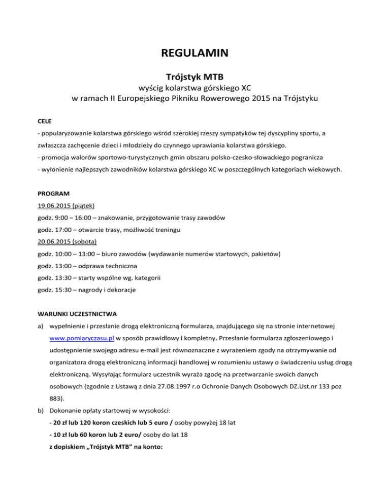 REGULAMIN Trójstyk MTB wyścig kolarstwa górskiego XC w ramach II Europejskiego Pikniku Rowerowego 2015 na Trójstyku CELE - popularyzowanie kolarstwa górskiego wśród szerokiej rzeszy sympatyków tej dyscypliny sportu, a zwłaszcza zachęcenie dzieci i młodzieży do czynnego uprawiania kolarstwa górskiego. - promocja walorów sportowo-turystycznych gmin obszaru polsko-czesko-słowackiego pogranicza - wyłonienie najlepszych zawodników kolarstwa górskiego XC w poszczególnych kategoriach wiekowych. PROGRAM 19.06.2015 (piątek) godz. 9:00 – 16:00 – znakowanie, przygotowanie trasy zawodów godz. 17:00 – otwarcie trasy, możliwość treningu 20.06.2015 (sobota) godz. 10:00 – 13:00 – biuro zawodów (wydawanie numerów startowych, pakietów) godz. 13:00 – odprawa techniczna godz. 13:30 – starty wspólne wg. kategorii godz. 15:30 – nagrody i dekoracje WARUNKI UCZESTNICTWA a) wypełnienie i przesłanie drogą elektroniczną formularza, znajdującego się na stronie internetowej www.pomiaryczasu.pl w sposób prawidłowy i kompletny. Przesłanie formularza zgłoszeniowego i udostępnienie swojego adresu e-mail jest równoznaczne z wyrażeniem zgody na otrzymywanie od organizatora drogą elektroniczną informacji handlowej w rozumieniu ustawy o świadczeniu usług drogą elektroniczną. Wysyłając formularz uczestnik wyraża zgodę na przetwarzanie swoich danych osobowych (zgodnie z Ustawą z dnia 27.08.1997 r.o Ochronie Danych Osobowych DZ.Ust.nr 133 poz 883). b) Dokonanie opłaty startowej w wysokości: - 20 zł lub 120 koron czeskich lub 5 euro / osoby powyżej 18 lat - 10 zł lub 60 koron lub 2 euro/ osoby do lat 18 z dopiskiem „Trójstyk MTB” na konto: Dane do wpłaty: Stowarzyszenie Wspierania Inicjatyw Rowerowych CYCLO PARTNER 43 – 470 Istebna, Istebna 236 Bank Zachodni WBK 31 1090 2011 0000 0001 2326 5592 Kontakt, weryfikacja opłat: [email protected] c) Osoby które w dniu imprezy nie ukończyły 18 lat mają prawo startu po złożeniu u organizatora pisemnej zgody obojga rodziców lub opiekunów prawnych na formularzu udostępnionym przez organizatora w biurze zawodów. d) Każdy uczestnik jest zobowiązany do podpisania oświadczenia o swoim stanie zdrowia lub przedstawienia zaświadczenia od lekarza o braku przeciwwskazań zdrowotnych do uprawiania kolarstwa w biurze zawodów. e) Każdy uczestnik startuje na własną odpowiedzialność, a w przypadku zawodników niepełnoletnich na odpowiedzialność rodziców lub prawnych opiekunów. KATEGORIE: MA - Maluchy (wiek: 5-10) M - Młodzik (mężczyźni, wiek: 11-14) MK - Młodziczka (kobiety, wiek: 11-14) J1 - Junior 1 (mężczyźni, wiek: 15-16) JK1 - Juniorka 1 (kobiety, wiek: 15-16) J2 - Junior 2 (mężczyźni, wiek: 17-18) JK2 - Juniorka 2 (kobiety, wiek: 17-18) K2 - Kobiety K2 (kobiety, wiek: 19-29) K3 - Kobiety K3 (kobiety, wiek: 30-65) M2 - Mężczyźni M2 (mężczyźni, wiek: 19-29) M3 - Mężczyźni M3 (mężczyźni, wiek: 30-39) M4 - Mężczyźni M4 (mężczyźni, wiek: 40-49) M5 - Mężczyźni M5 (mężczyźni, wiek: 50-65) Wszyscy uczestnicy wyścigów muszą posiadać aktualne ubezpieczenie NW, zalecane OC. Wszystkie kategorie wiekowe startują zgodnie z oficjalnym programem. Wszyscy zawodnicy mają obowiązek startowania w kaskach ochronnych, zgodnych z obowiązującymi standardami bezpieczeństwa, podczas wyścigów oraz oficjalnych treningów wyznaczonych przez organizatora imprezy. Wszyscy uczestnicy przyjeżdżają na zawody na koszt własny. Organizator nie zapewnia zakwaterowania. Wszyscy uczestnicy otrzymują informacje o obowiązującym wszystkich uczestników regulaminie wyścigu, programie, oficjalnych godzin startów dla każdej kategorii wiekowej. Wszyscy uczestnicy otrzymują przy rejestracji numer startowy z chipem. Warunkiem uczestnictwa zawodnika w wyścigach jest przestrzeganie zasad niniejszego regulaminu oraz przepisów sportowych wyznaczonych przez organizatora. PRZEPISY SPORTOWE Zawodnik zostanie dopuszczony do startu w wyścigu po dokonaniu prawidłowej rejestracji i wniesieniu opłaty startowej oraz po prawidłowym przymocowaniu numeru startowego otrzymanego od organizatora. Ewentualne zmiany dotyczące zasad rozgrywania wyścigu oraz trasy, a wynikające w ostatniej chwili, będą podane do wiadomości zawodnikom tuż przed startem przez przedstawiciela Komisji Sędziowskiej. Zawodnicy nie mogą przeprowadzać treningów po trasie podczas rozgrywania wyścigów. W przypadku naruszenia tego przepisu zawodnicy będą karani zgodnie z regulaminem. W trakcie wyścigu zawodnicy nie mogą skracać ani zmieniać wyznaczonej przez organizatora trasy. W przypadku naruszenia tego przepisu zawodnicy będą karani zgodnie z regulaminem. W przypadku, gdy zawodnik zjedzie z trasy, powinien on powrócić na trasę wyścigu i rozpocząć wyścig w tym samym punkcie, w którym z trasy zjechał. W przypadku naruszenia tego przepisu zawodnicy będą karani zgodnie z obowiązującymi przepisami. Dla zawodników wszystkich kategorii wprowadza się 1 strefę pomocy technicznej, usytuowaną na trasie zawodów. Pomoc techniczna podczas wyścigu składa się z naprawy lub wymiany dowolnej części roweru innej niż rama. Wymiana roweru jest zabroniona a zawodnik musi przekroczyć linię mety z tą samą tabliczką z numerem, którą miał na stracie. Części zapasowe i narzędzia do reparacji muszą być przechowywane w strefach. Każdy zawodnik musi dokonać naprawy lub wymiany wyposażenia samodzielnie lub z pomocą zawodnika ze swojej drużyny aktualnie jadącego w wyścigu lub mechanika drużyny lub mechanika neutralnego. Pomoc techniczna dozwolona jest wyłącznie w strefie boksu. Zawodnicy mogą mieć przy sobie narzędzia i inne części zamienne pod warunkiem, że nie spowodują żadnego zagrożenia dla siebie samych lub innych zawodników. Użycie radia lub innej zdalnej komunikacji z zawodnikami jest zabronione. Zawodnik musi przestrzegać zasad dobrego wychowania podczas trwania całeg