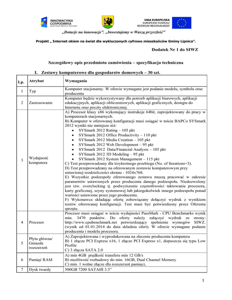 Projekt „ Internet okiem na świat dla wykluczonych cyfrowo mieszkańców Gminy Lipnica”. Dodatek Nr 1 do SIWZ Szczegółowy opis przedmiotu zamówienia – specyfikacja techniczna I. Zestawy komputerowe dla gospodarstw domowych – 30 szt. Lp. Atrybut 1 Typ 2 Zastosowanie 3 Wydajność komputera 4 Procesor 5 Płyta główna/ Gniazda rozszerzeń 6 Pamięć RAM 7 Dysk twardy Wymagania Komputer stacjonarny. W ofercie wymagane jest podanie modelu, symbolu oraz producenta Komputer będzie wykorzystywany dla potrzeb aplikacji biurowych, aplikacji edukacyjnych, aplikacji obliczeniowych, aplikacji graficznych, dostępu do Internetu oraz poczty elektronicznej. A) Procesor klasy x86 wykonujący instrukcje 64bit, zaprojektowany do pracy w komputerach stacjonarnych. B) Komputer w oferowanej konfiguracji musi osiągać w teście BAPCo SYSmark 2012 wyniki nie mniejsze niż: SYSmark 2012 Rating – 105 pkt SYSmark 2012 Office Productivity – 110 pkt SYSmark 2012 Media Creation – 105 pkt SYSmark 2012 Web Development – 95 pkt SYSmark 2012 Data/Financial Analysis – 105 pkt SYSmark 2012 3D Modeling – 95 pkt SYSmark 2012 System Management – 115 pkt C) Test przeprowadzany dla trzykrotnego przebiegu (No. of Iterations=3). D) Test przeprowadzany na oferowanym zestawie komputerowym przy ustawionej rozdzielczości ekranu - 1024x768. E) Wszystkie podzespoły oferowanego zestawu muszą pracować w zakresie parametrów ustawionych przez producenta danego podzespołu. Niedozwolony jest tzw. overclocking tj. podwyższenie częstotliwości taktowania procesora, karty graficznej, szyny systemowej lub jakiegokolwiek innego podzespołu ponad wartości ustawione przez jego producenta. F) Wykonawca składając ofertę zobowiązany dołączyć wydruk z wynikiem testów oferowanej konfiguracji. Test musi być potwierdzony przez Oferenta sprzętu. Procesor musi osiągać w teście wydajności PassMark - CPU Benchmarks wynik min. 3470 punktów. Do oferty należy załączyć wydruk ze strony: http://www.cpubenchmark.net potwierdzający spełnienie wymogów SIWZ. (wynik od 01.01.2014 do dnia składnia ofert). W ofercie wymagane podanie producenta i modelu procesora. A) Zaprojektowana i wyprodukowana na zlecenie producenta komputera B) 1 złącze PCI Express x16, 1 złącze PCI Express x1, dopuszcza się typu Low Profile C) 3 złącza SATA 2.0 A) min 4GB prędkość transferu min 12 GB/s B) możliwość rozbudowy do min. 16GB, Dual Channel Memory C) min. 1 wolne złącze dla rozszerzeń pamięci, 500GB 7200 SATAIII 3.5” 1 8 Wbudowana nagrywarka DVD+/-RW S-ATA 5,25" (nie dopuszcza się napędów typu Slim) wraz z oprogramowaniem do nagrywania płyt. Napęd przystosowany do pracy w pozycji poziomej i pionowej. Zintegrowana, gniazda słuchawek i mikrofonu wyprowadzone na przedni i tylny panel obudowy. Wbudowany głośnik audio do odtwarzania plików Karta dźwiękowa multimedialnych, nie dopuszcza się głośników instalowanych na złączu USB oraz głośników zewnętrznych. A) Port sieci LAN 10/100/1000 Ethernet RJ 45 (WOL, PXE), zintegrowany z płytą główną. Karta sieciowa B) WLAN 802.11a/b/g/n, zintegrowany z płytą główną lub w postaci wewnętrznego modułu PCI-Ex1 Karta graficzna zintegrowana z płytą główną lub procesorem. Z możliwością dynamicznego przydzielenia pamięci w obrębie pamięci Karta graficzna systemowej. Sprzętowe wsparcie dla technologii DirectX 10.1 i OpenGL 3.0. Z tyłu obudowy: 4 porty USB 2.0, 1 port szeregowy RS-232, 1 port LPT, 1 port RJ45, 1 port VGA, 1 port DVI-D, 2 porty PS2, porty audio. Porty I/O Z przodu obudowy: 2 porty USB 3.0, porty audio. (wbudowane) Wymagana liczba i rozmieszczenie (na zewnątrz obudowy komputera) portów USB nie może być osiągnięta w wyniku stosowania konwerterów, przejściówek itp. A) Obudowa typu SFF, przygotowana fabrycznie do pracy w pozycji poziomej i pionowej. Wszystkie niezbędne elementy typu nóżki, podstawki, mocowania itp. zapewniające ustawienia w pozycji poziomej lub pionowej w zależności od potrzeb użytkownika, z obsługą kart PCI Express typu Low Profile, wyposażona w min. 2 kieszenie: 1 szt 5.25” zewnętrzna, 1 szt 3.5” wewnętrzna. B) Obudowa powinna fabrycznie umożliwiać montaż min 1 szt. dysków 3.5”. C) Suma wymiarów obudowy nie może przekraczać 740 mm. Obudowa/Zasilacz D) Obudowa musi umożliwiać zastosowanie zabezpieczenia fizycznego w postaci linki metalowej (złącze blokady Kensingtona) oraz kłódki (oczko w obudowie do założenia kłódki). E) Obudowa powinna posiadać czujnik otwarcia obudowy współpracujący z BIOS’em płyty głównej. Zasilacz o mocy max 220W pracujący w sieci 230V 50/60Hz prądu zmiennego i efektywności min. 81% przy pełnym obciążeniu. Klawiatura Klawiatura USB w układzie QWERTY obsługującą standard polski programisty. Mysz Mysz optyczna USB z trzema klawiszami oraz rolką (scroll). System operacyjny klasy PC musi spełniać następujące wymagania poprzez wbudowane mechanizmy, bez użycia dodatkowych aplikacji: 1. Dostępne dwa rodzaje graficznego interfejsu użytkownika: a. Klasyczny, umożliwiający obsługę przy pomocy klawiatury i myszy, b. Dotykowy umożliwiający sterowanie dotykiem na urządzeniach typu tablet lub monitorach dotykowych, 2. Interfejsy użytkownika dostępne w wielu językach do wyboru – w tym System operacyjny Polskim i Angielskim, 3. Funkcje związane z obsługą komputerów typu tablet, z wbudowanym modułem „uczenia się” pisma użytkownika – obsługa języka polskiego. 4. Funkcjonalność rozpoznawania mowy, pozwalającą na sterowanie komputerem głosowo, wraz z modułem „uczenia się” głosu użytkownika. 5. Możliwość dokonywania bezpłatnych aktualizacji i poprawek w ramach wersji systemu operacyjnego poprzez Internet, mechanizmem udostępnianym przez producenta systemu z możliwością wyboru instalowanych poprawek oraz Napęd optyczny 9 10 11 12 13 14 15 16 2 mechanizmem sprawdzającym, które z poprawek są