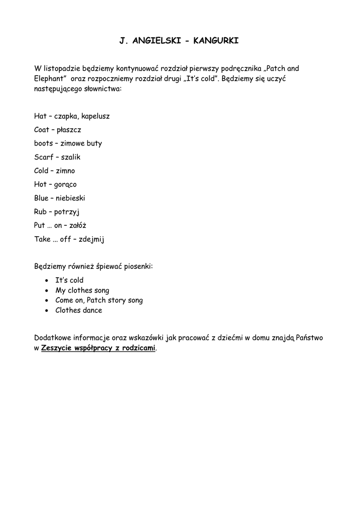 J. ANGIELSKI - KANGURKI W listopadzie będziemy kontynuować rozdział pierwszy podręcznika „Patch and Elephant” oraz rozpoczniemy rozdział drugi „It’s cold”. Będziemy się uczyć następującego słownictwa: Hat – czapka, kapelusz Coat – płaszcz boots – zimowe buty Scarf – szalik Cold – zimno Hot – gorąco Blue – niebieski Rub – potrzyj Put … on – załóż Take ... off – zdejmij Będziemy również śpiewać piosenki: It’s cold My clothes song Come on, Patch story song Clothes dance Dodatkowe informacje oraz wskazówki jak pracować z dziećmi w domu znajdą Państwo w Zeszycie współpracy z rodzicami.