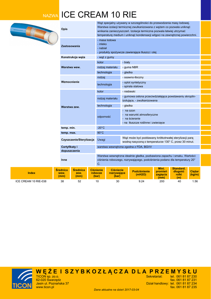 NAZWA ICE CREAM 10 RIE Opis Wąż specjalny używany w szczególności do przewodzenia masy lodowej. Warstwa izolacji termicznej zwulkanizowana z wężem co pozwala uniknąć wnikania zanieczyszczeń. Izolacja termiczna pozwala łatwiej utrzymać temperaturę medium i uniknąć kondensacji wilgoci na zewnętrznej powierzchni. Zastosowania - masa lodowa - mleko - nabiał - produkty spożywcze zawierające tłuszcz i olej Konstrukcja węża - wąż z gumy Warstwa wew. Wzmocnienie Warstwa zew. kolor - biały rodzaj materiału - guma NBR technologia - gładka rodzaj - ssawno-tłoczny technologia - oplot syntetyczny - spirala stalowa kolor - niebieski rodzaj materiału - gumowa osłona przeciwdziałająca powstawaniu skroplinizolująca, - zwulkanizowana technologia - gładka odporność - na ozon - na warunki atmosferyczne - na ścieranie - na tłuszcze roślinne i zwierzęce temp. min. -20°C temp. max. 90°C Czyszczenie/Sterylizacja Uwagi Certyfikaty i dopuszczenia warstwa wewnętrzna zgodna z FDA, BGVV Wąż może być poddawany krótkotrwałej sterylizacji parą wodną nasyconą o temperaturze 130° C, przez 30 minut. Warstwa wewnętrzna idealnie gładka, pozbawiona zapachu i smaku. Wartości: ciśnienia roboczego, rozrywającego, podciśnienia podano dla temperatury 20° C. Inne Index Index Średnica wew. (mm) Średnica zew. (mm) Ciśnienie robocze (bar) Ciśnienie rozrywające (bar) Podciśnienie Podciśnienie (mH2O) (mH2O) ICE CREAM 10 RIE-038 38 52 10 30 9.24 Mini. Mini. promień promień zagięcia zagięcia (mm) (mm) 200 Standard. Standard. długość długość rolki rolki (m) (m) 40 Ciężar Ciężar (kg/m) (kg/m) 1.56 WĘŻE I SZYBKOZŁĄCZA DLA PRZEMYSŁU TICON sp. zo.o. 62-020 Swarzędz Jasin ul. Poznańska 37 www.ticon.pl Sekretariat: Dane aktualne na dzień 2017-03-04 tel. 061 81 87 230 fax. 061 81 87 231 Dział handlowy: tel. 061 81 87 234 fax. 061 81 87 235